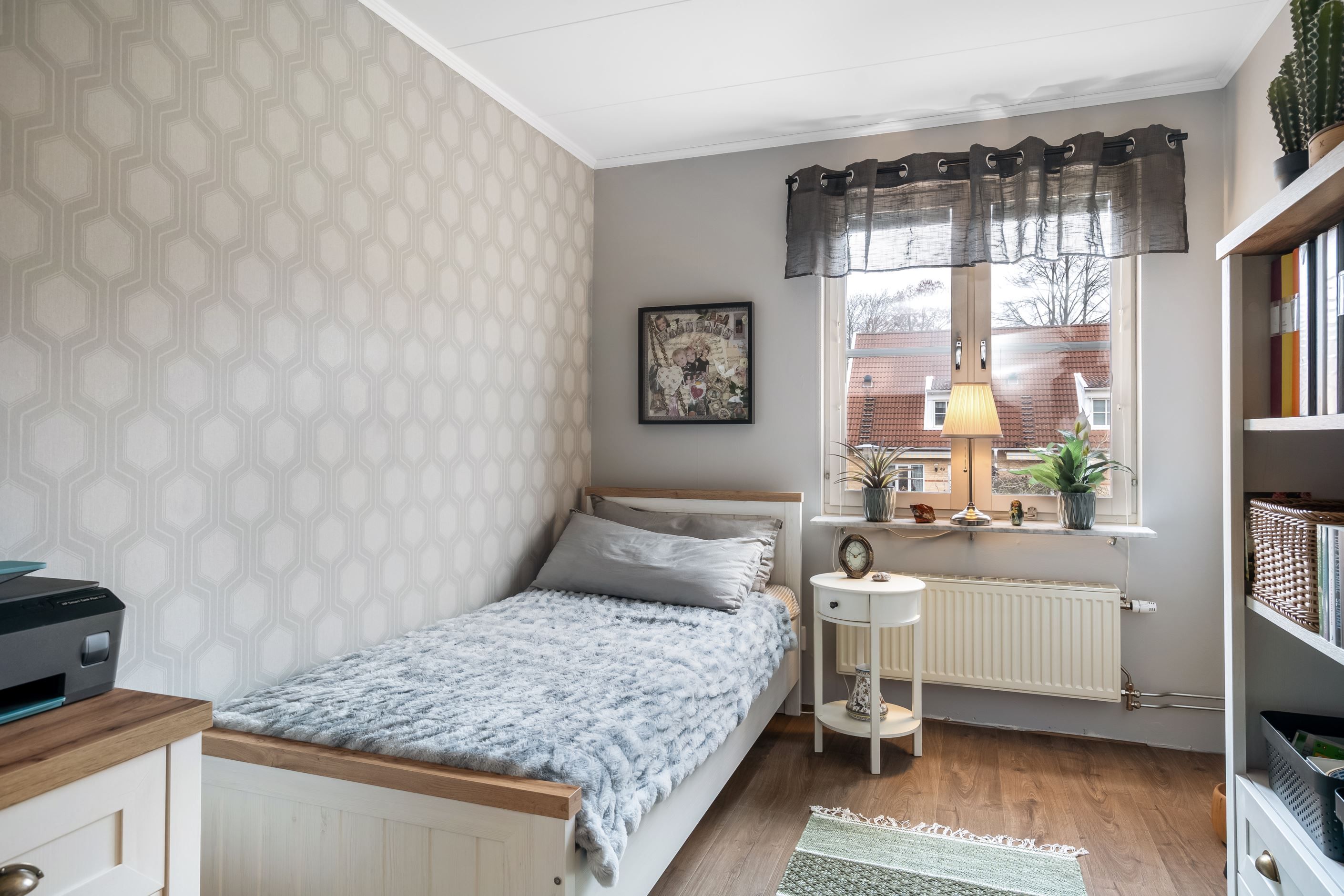 Det första sovrummet har ljusa väggar och ny tapet här finns plats för säng och skrivbord samt tre garderober som erbjuder bra förvaring. Vardagsrummet är generöst och lättmöblerat, med plats för soffa, tv-möbel och matbord, vilket gör det enkelt att ha mysiga stunder med familj och vänner. Från vardagsrummet leder altandörren ut till den stora inglasade balkongen i söderläge, där glaspartierna enkelt kan öppnas och möbleras efter behov, både under soliga och regniga dagar.