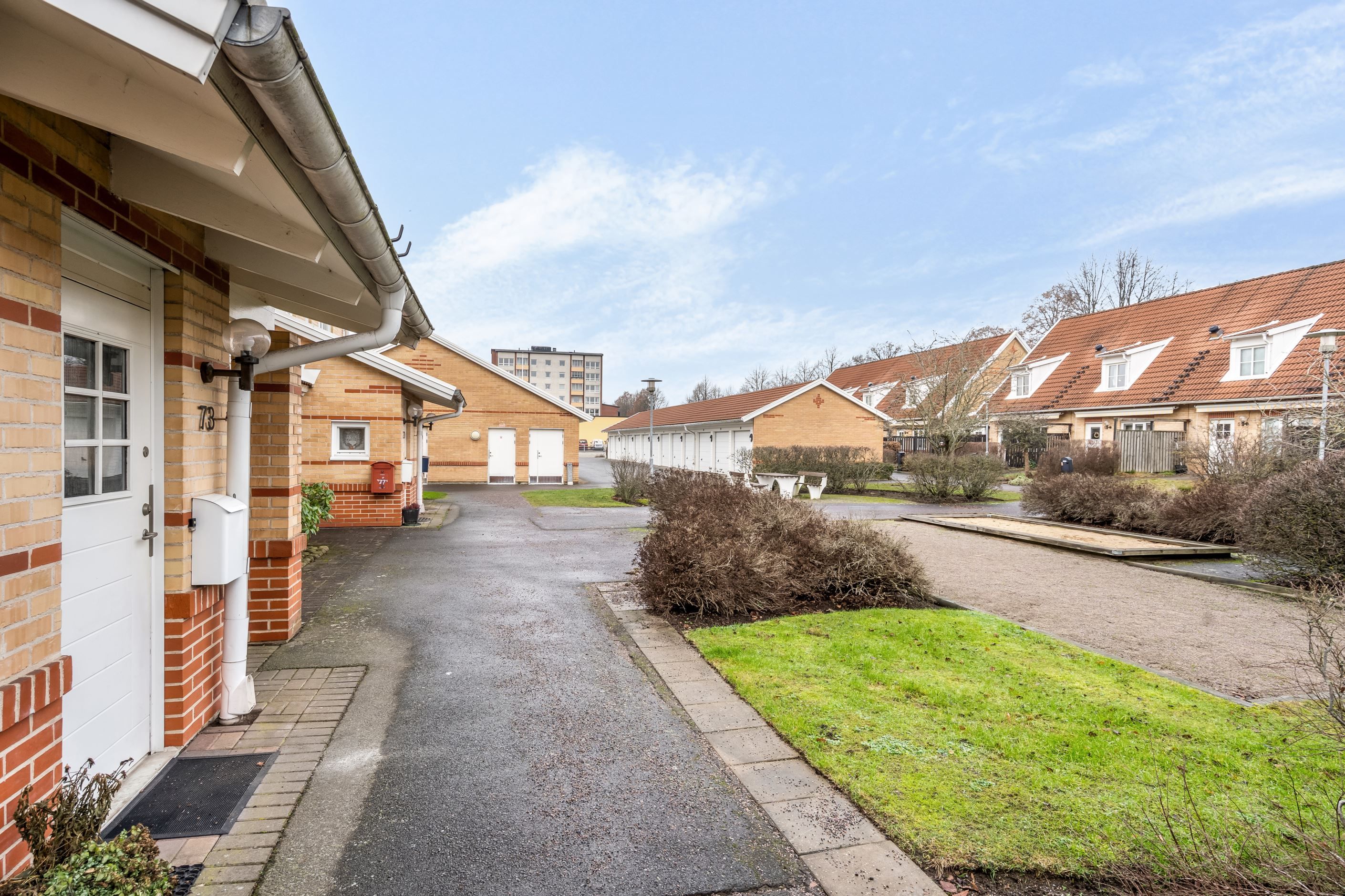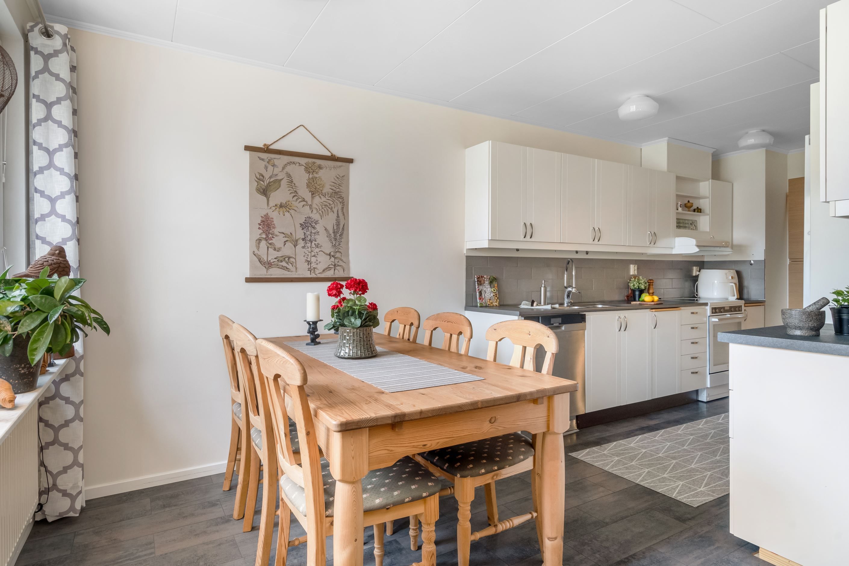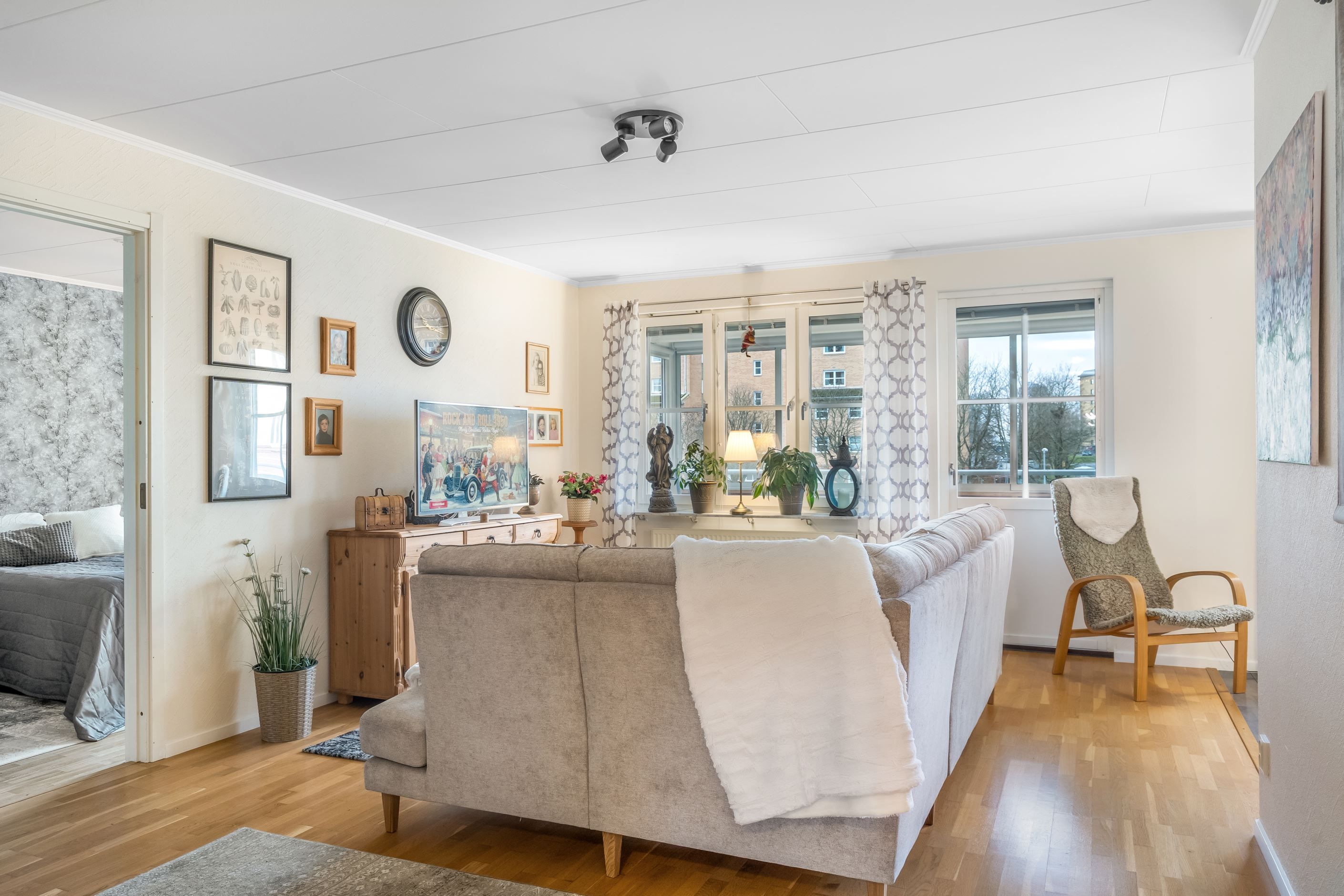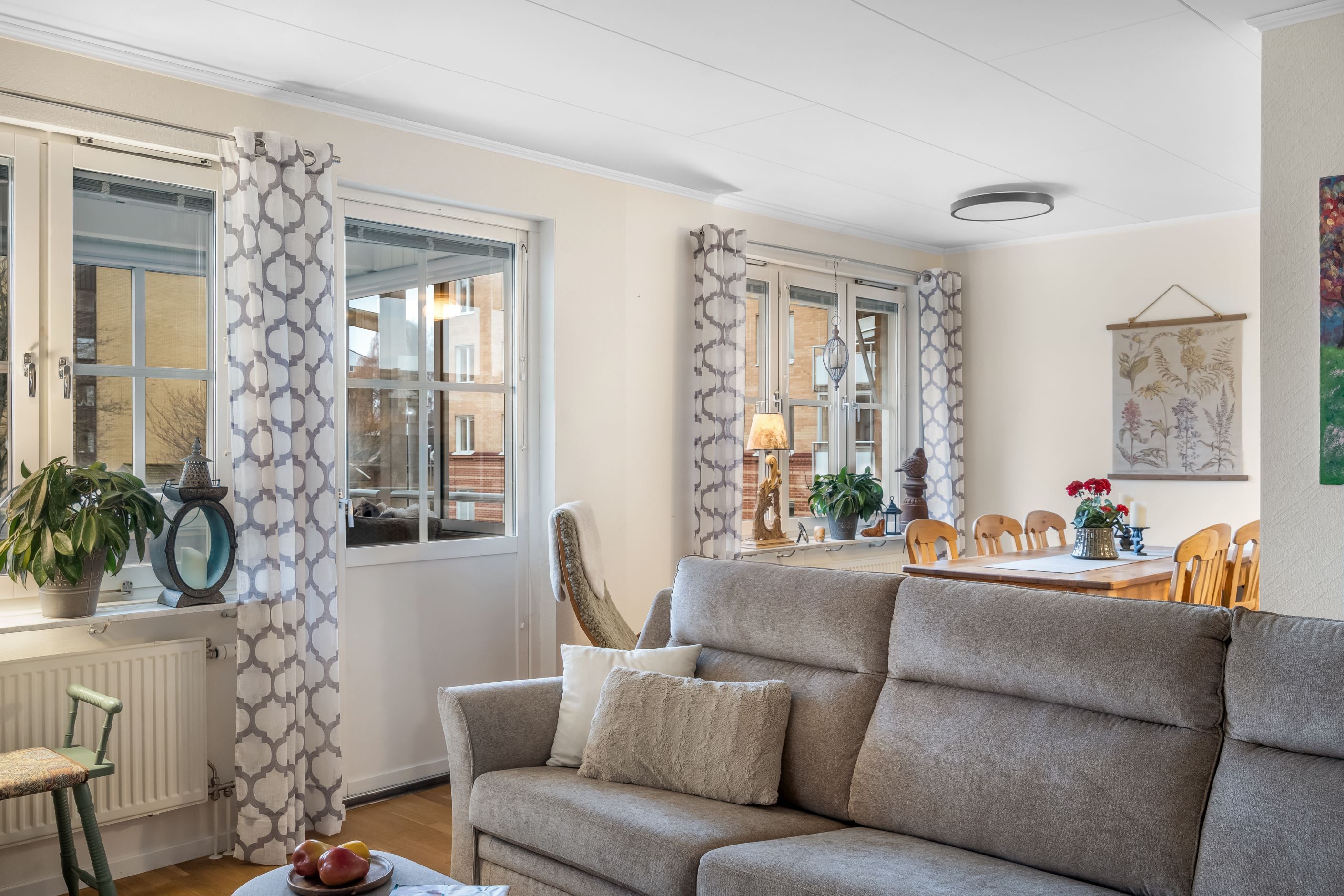 Välkommen till denna stora, centrala trea i två plan med egen praktisk entré i markplan och resterande del av bostaden en trappa upp. Lägenheten har en hemtrevlig och inbjudande interiör med genomgående fina och välhållna ytskikt. Den tilltalande planlösningen erbjuder rymligt vardagsrum och kök, två sovrum som båda har bra storlek – varav ett är nytapetserat – samt ett duschrum med egen tvättdel. Här finns även en stor inglasad balkong i härligt söderläge med utsikt över grönområdet utanför. Goda förvaringsmöjligheter nås inifrån bostaden och består av klädkammare, förvaring under trappan samt vind.