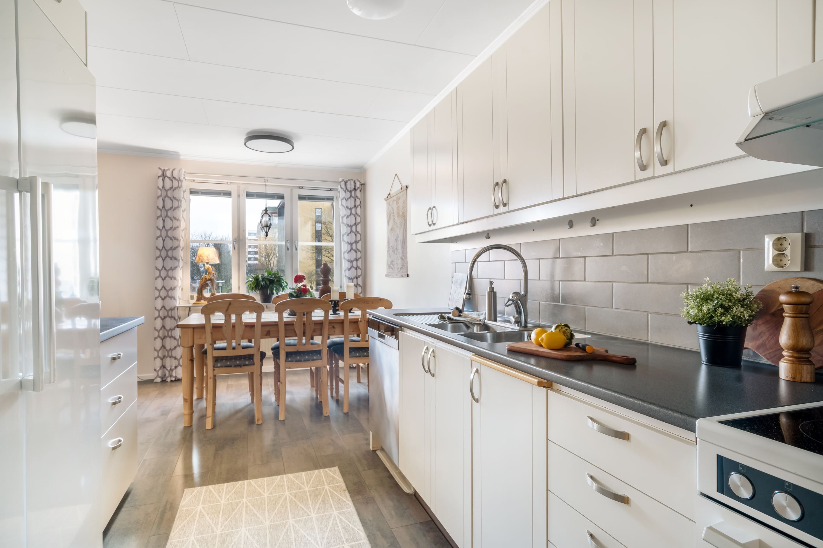 Köket är modernt med vita luckor, grå bänkskiva och grått kakel och är utrustat med ny kyl, ny frys samt ny ugn/spis. Här finns gott om skåp och arbetsyta, och plats för matbord med stolar vilket gör det enkelt att både laga mat och umgås samtidigt. Duschrummet är rymligt och praktiskt med egen tvättdel utrustad med tvättmaskin, ny torktumlare, vask, bänkskiva och skåp för bra förvaring, vilket gör det smidigt att sköta tvätten utan att behöva springa i trappor till gemensam tvättstuga.
