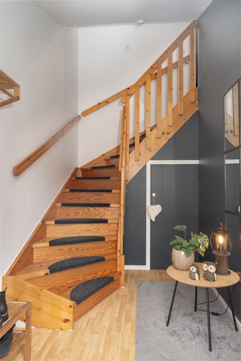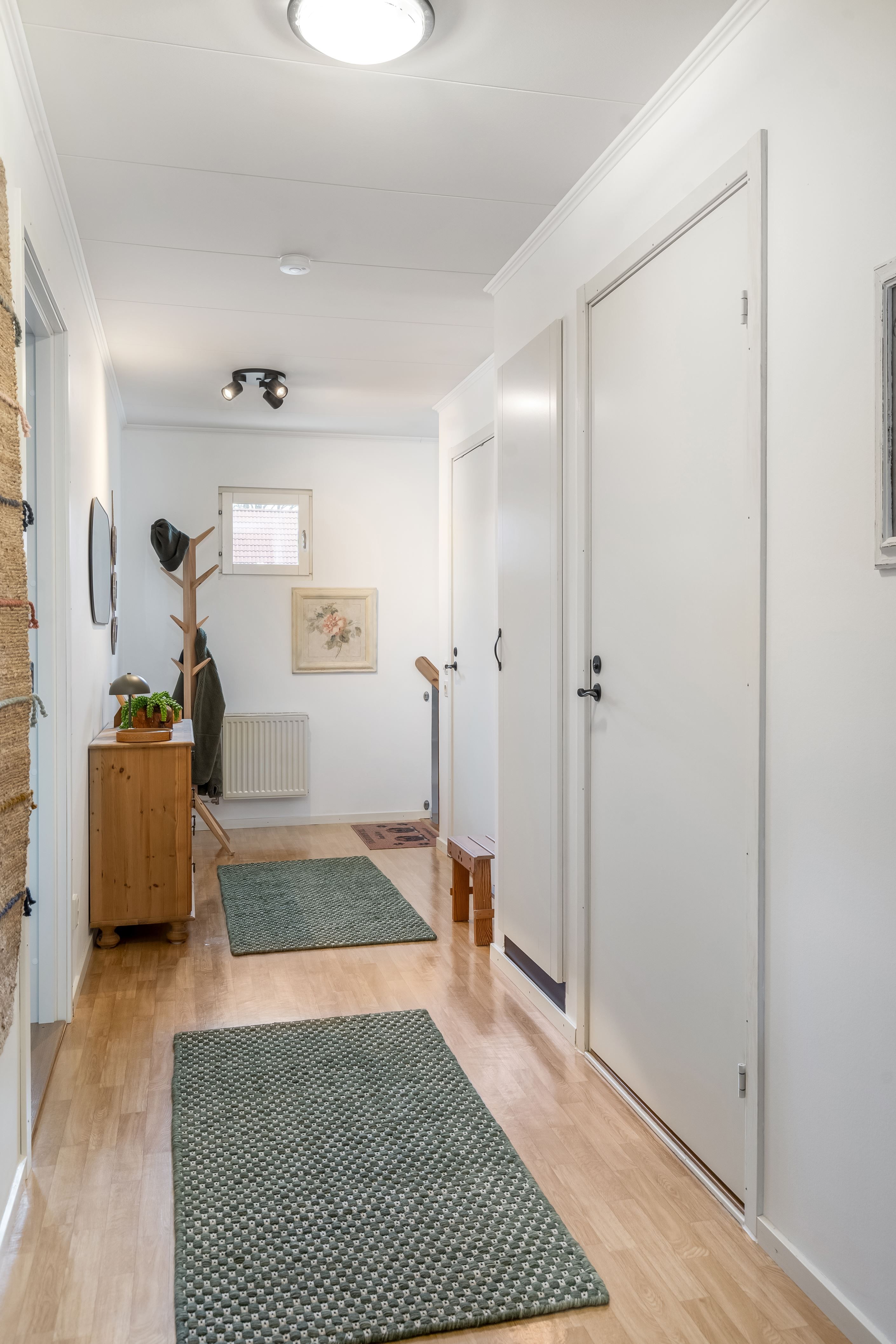 Entrén på markplan erbjuder plats för avhängning av ytterkläder och skor samt ett förråd under trappan för ytterligare förvaringsmöjligheter. Direkt välkomnas du av den hemtrevliga känslan och en trappa upp möts du av hallen som leder vidare till bostadens alla rum. Ovanför trappan ligger klädkammaren med gott om plats för förvaring.