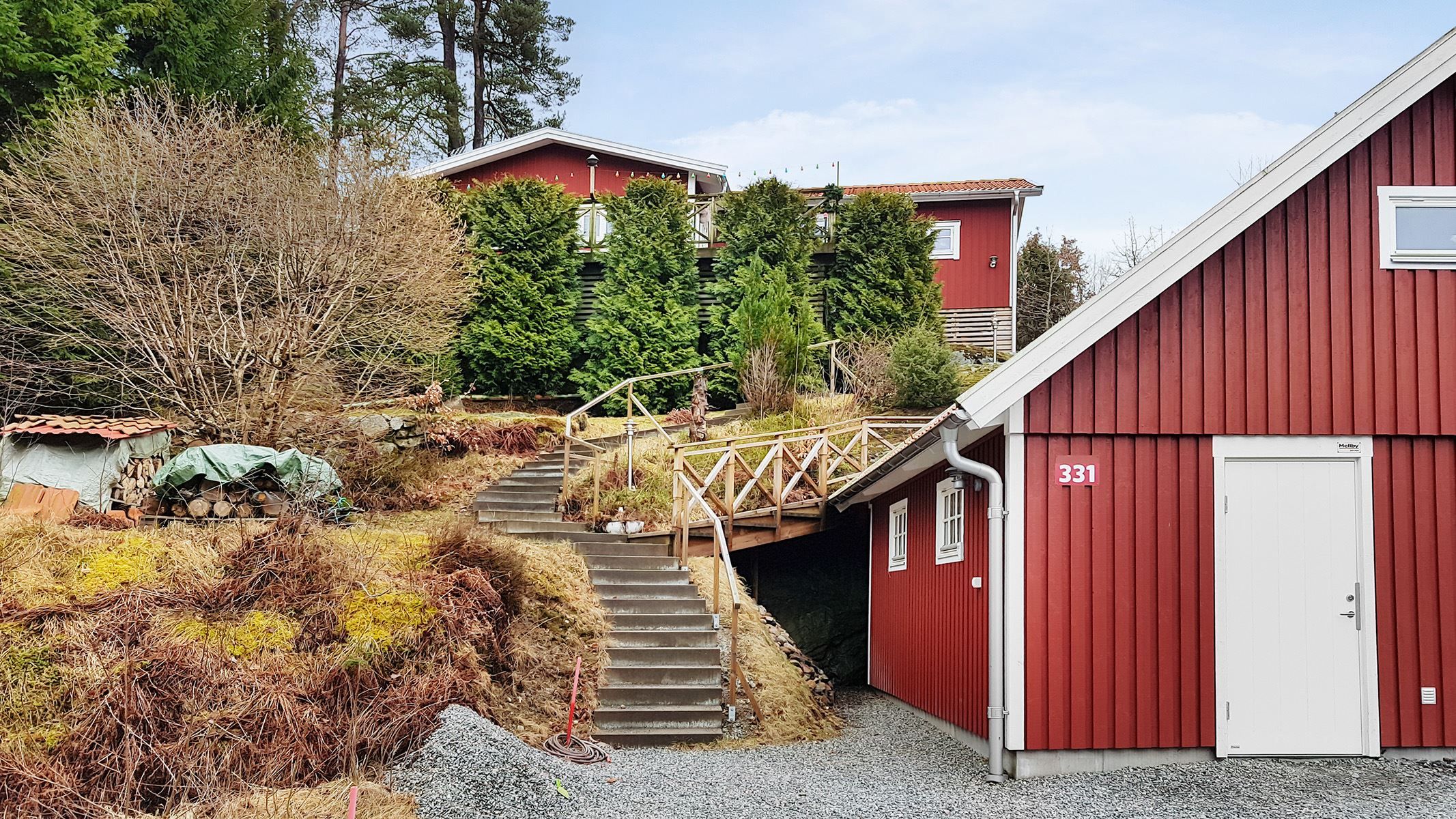 Varmgarage med mycket förvaring samt ett inrett loft för övernattande gäster eller kanske ett hemmakontor.