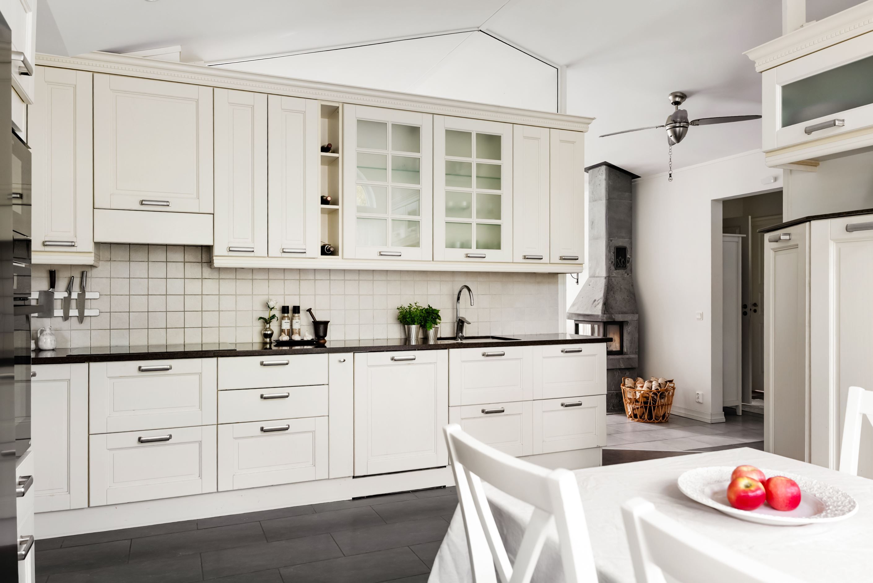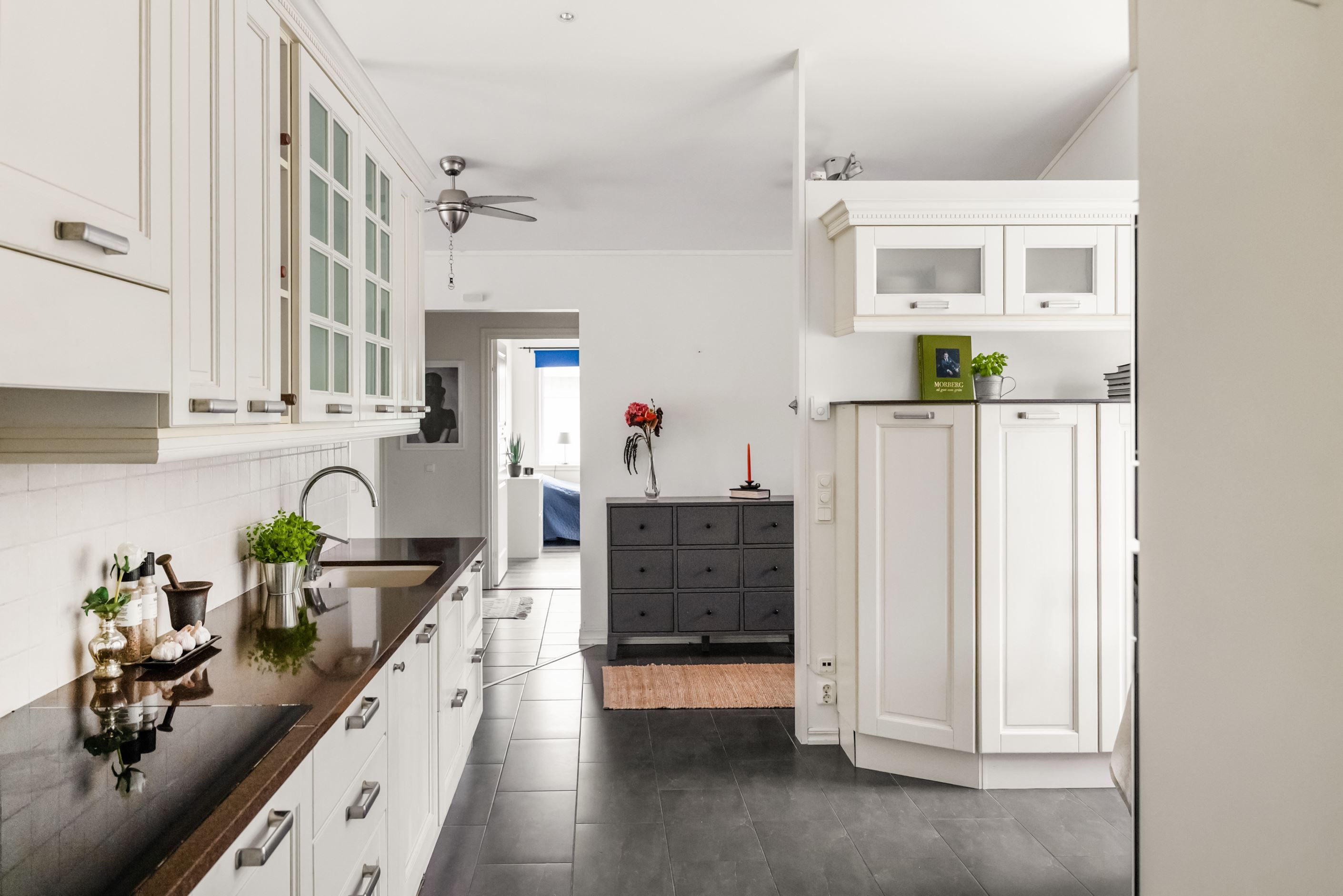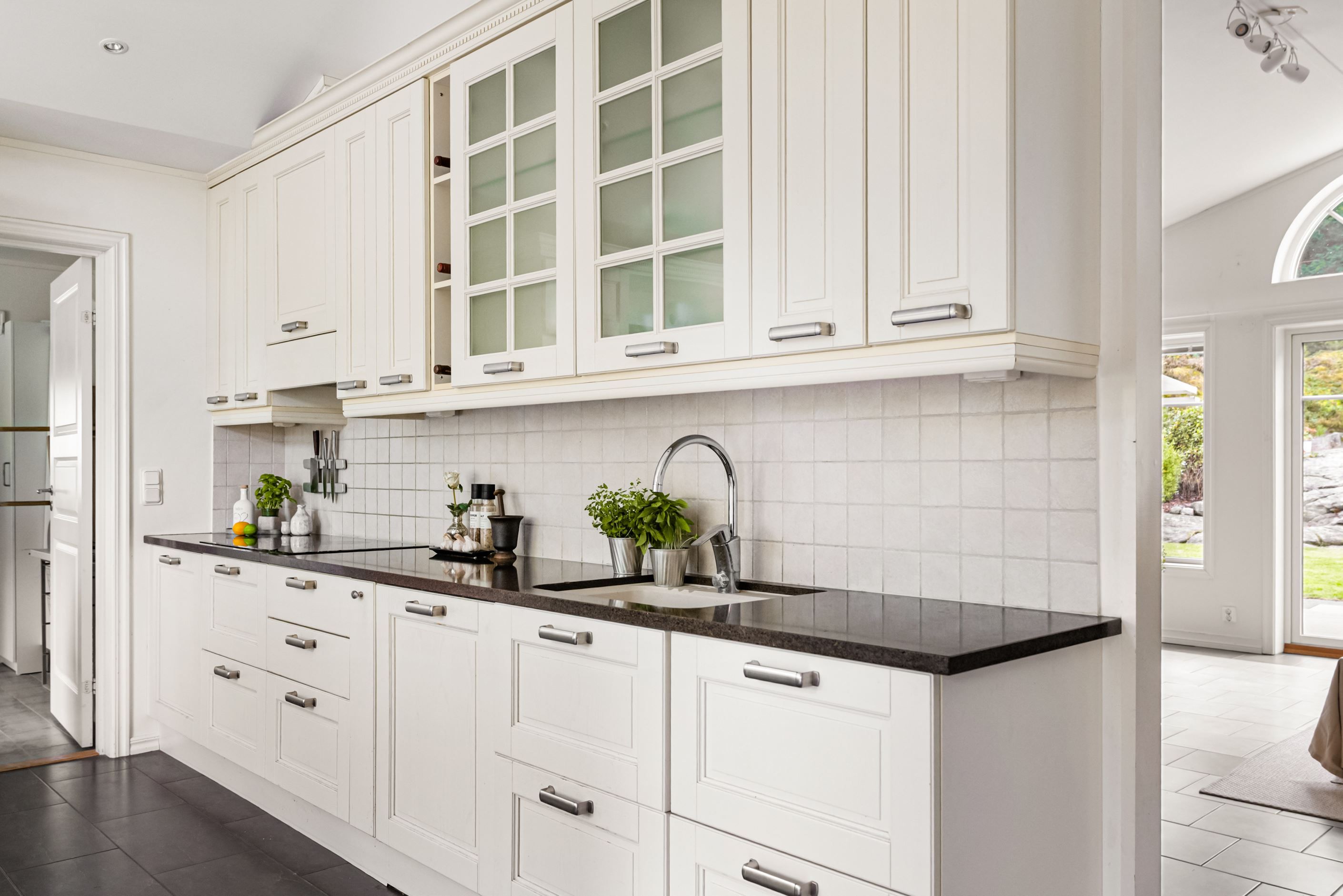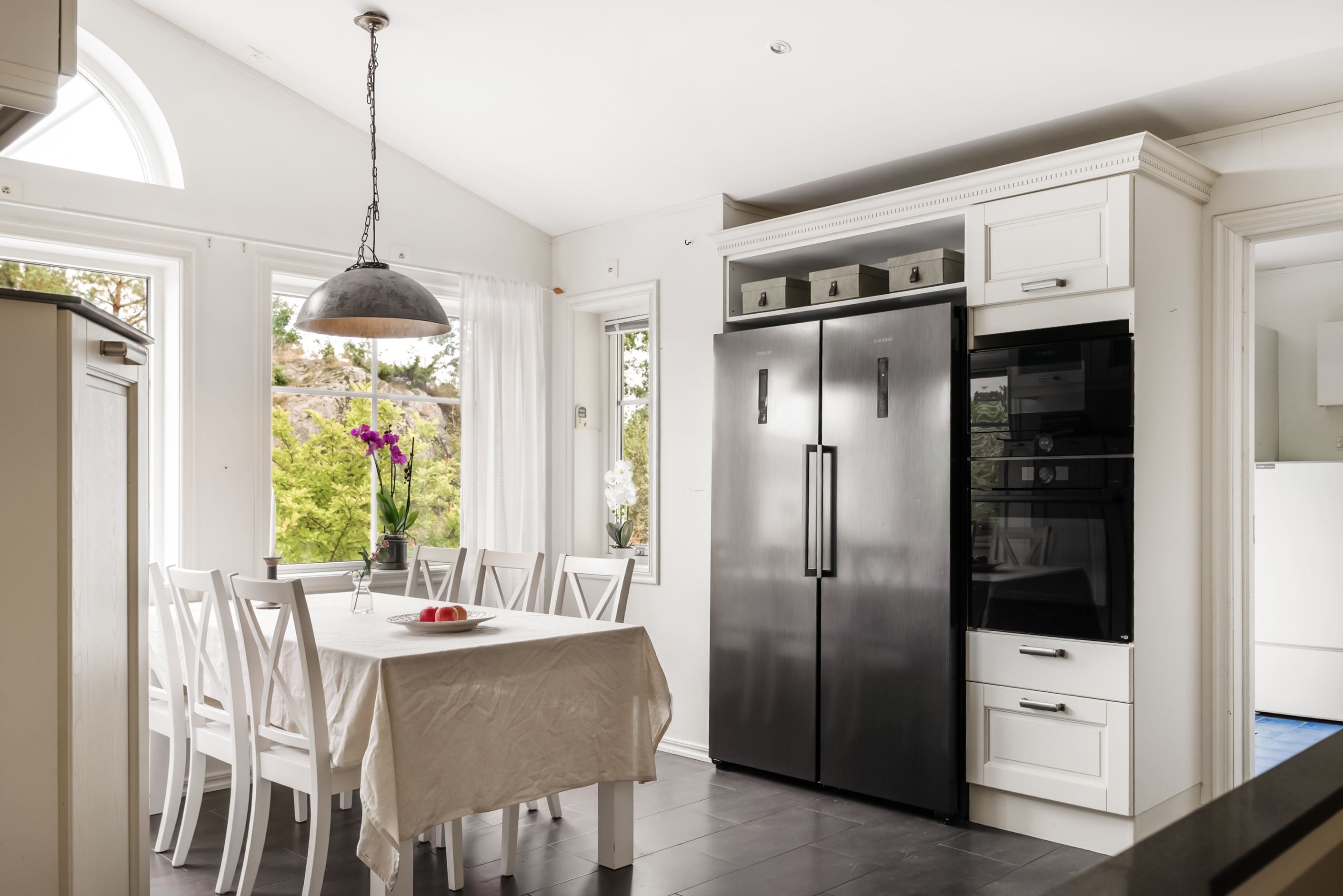 Köket är både praktiskt och hemtrevligt – perfekt för vardagens middagar och helgens långfrukostar. Intill finns gott om plats för matbord och samvaro.