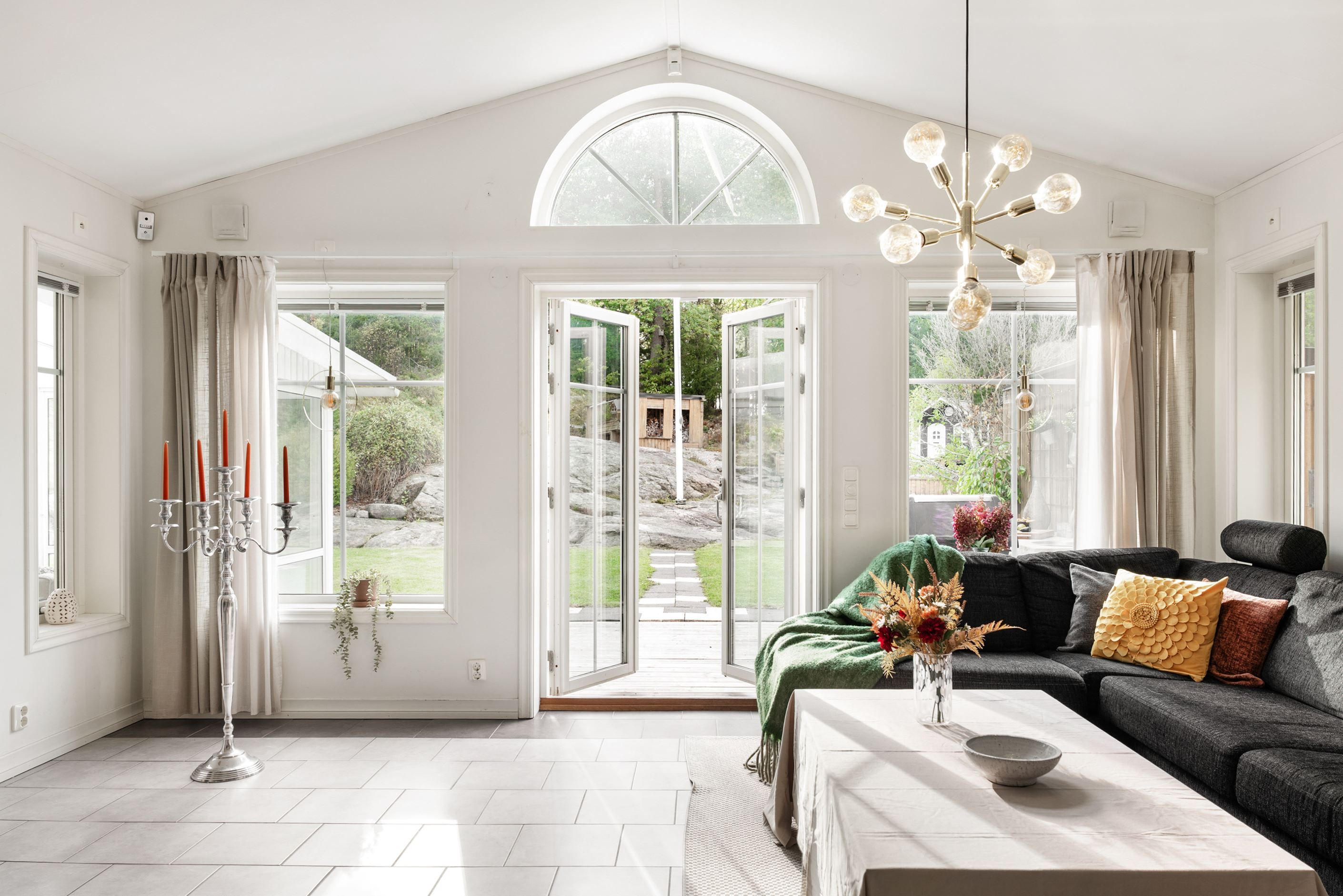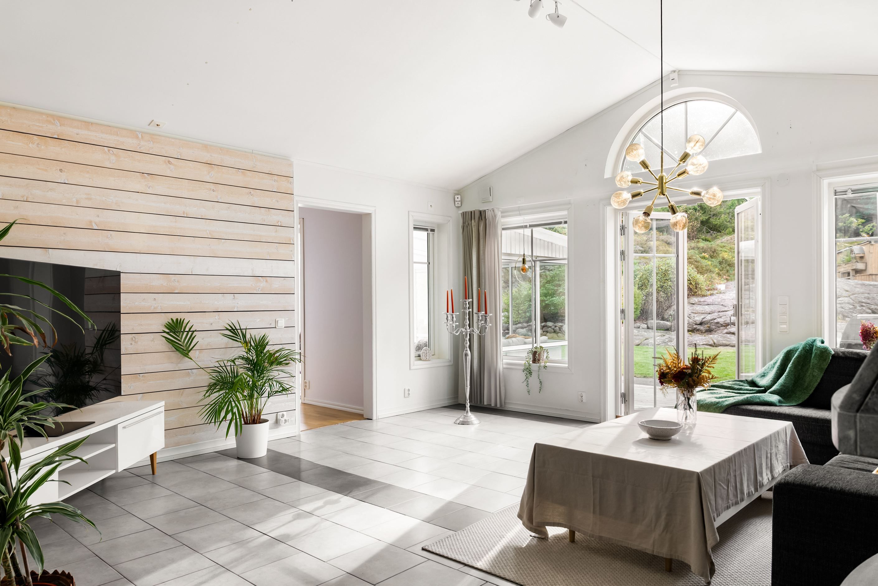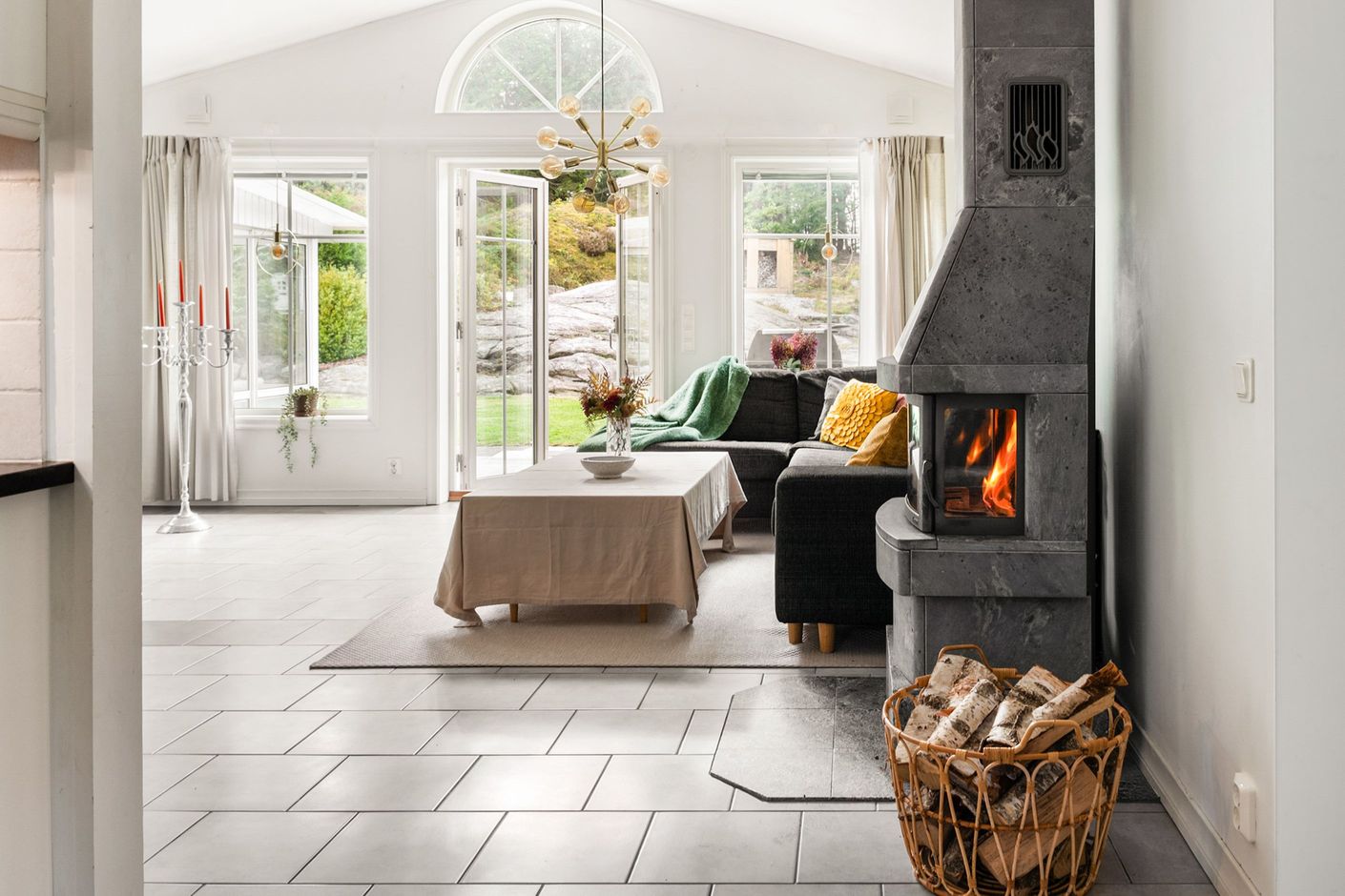 Redan när du kliver in möts du av en varm och inbjudande känsla. Det ljusa vardagsrummet med sina stora fönster bjuder in naturen och skapar en härlig plats för både avkoppling och umgänge. Här kan du tända en brasa, samla familjen framför en film eller bara njuta av utsikten mot grönskan utanför.