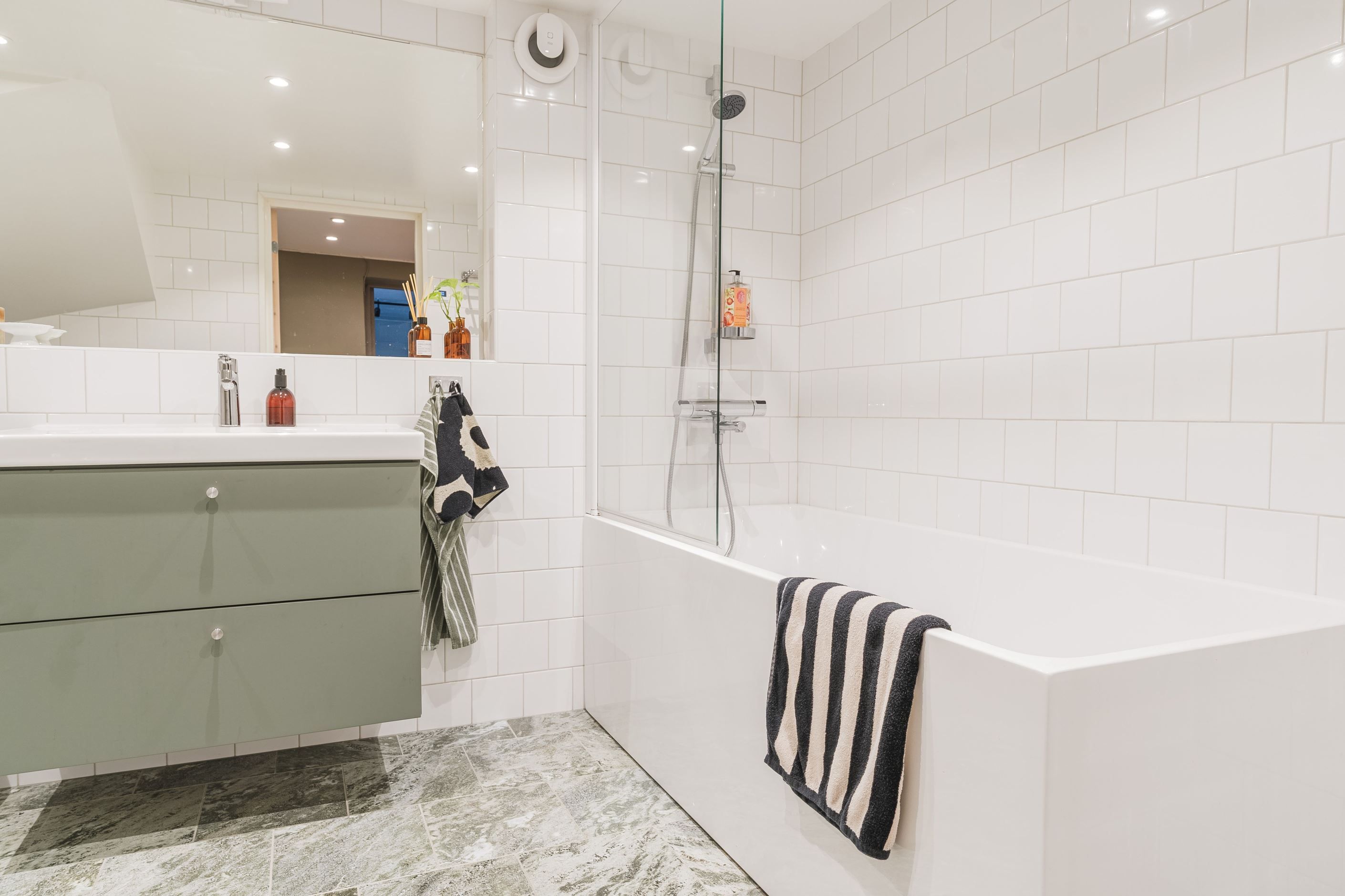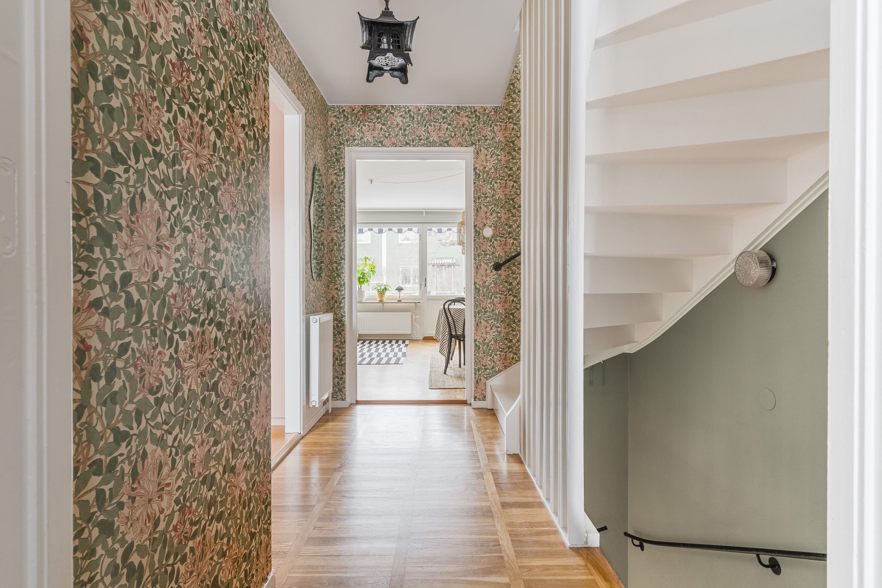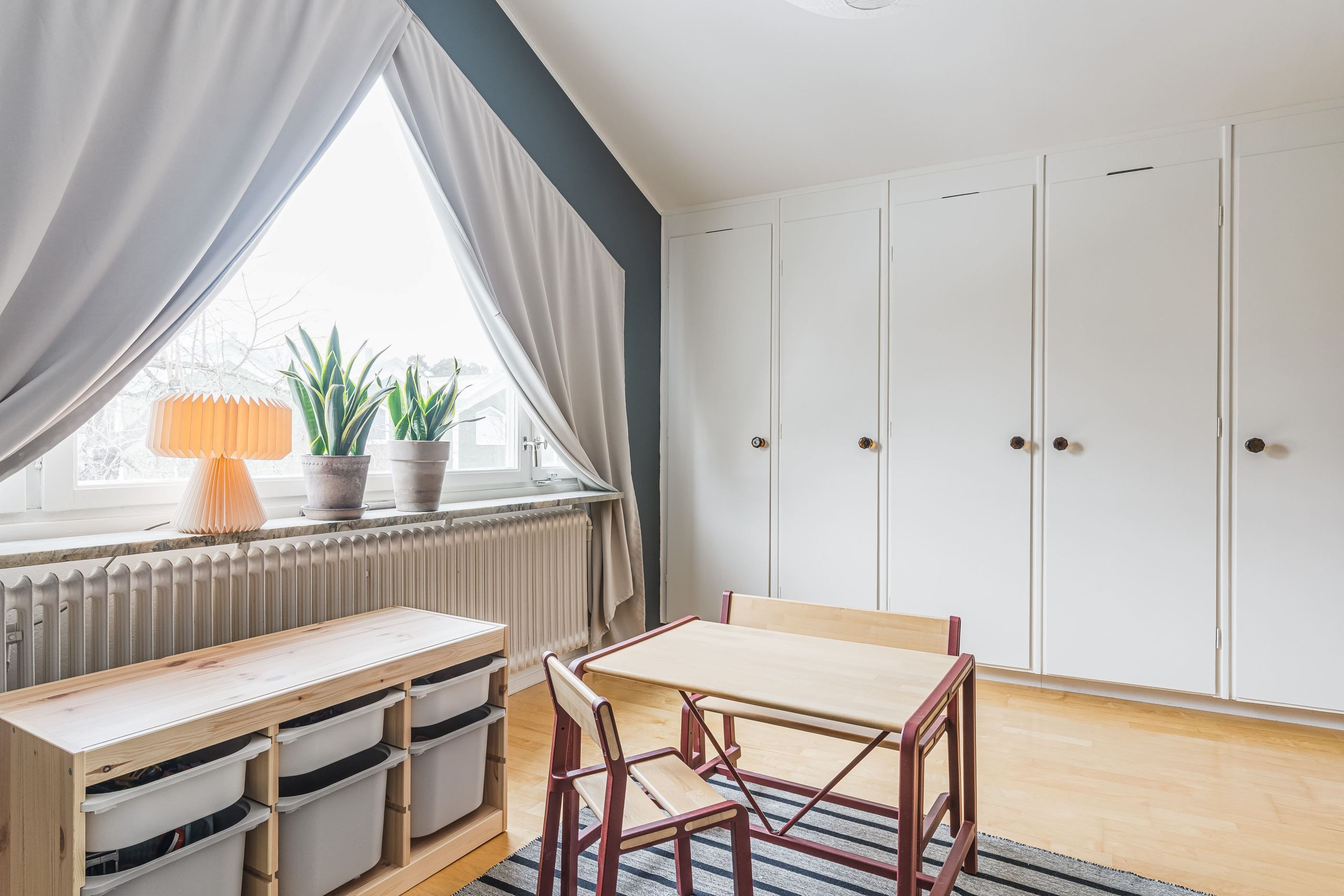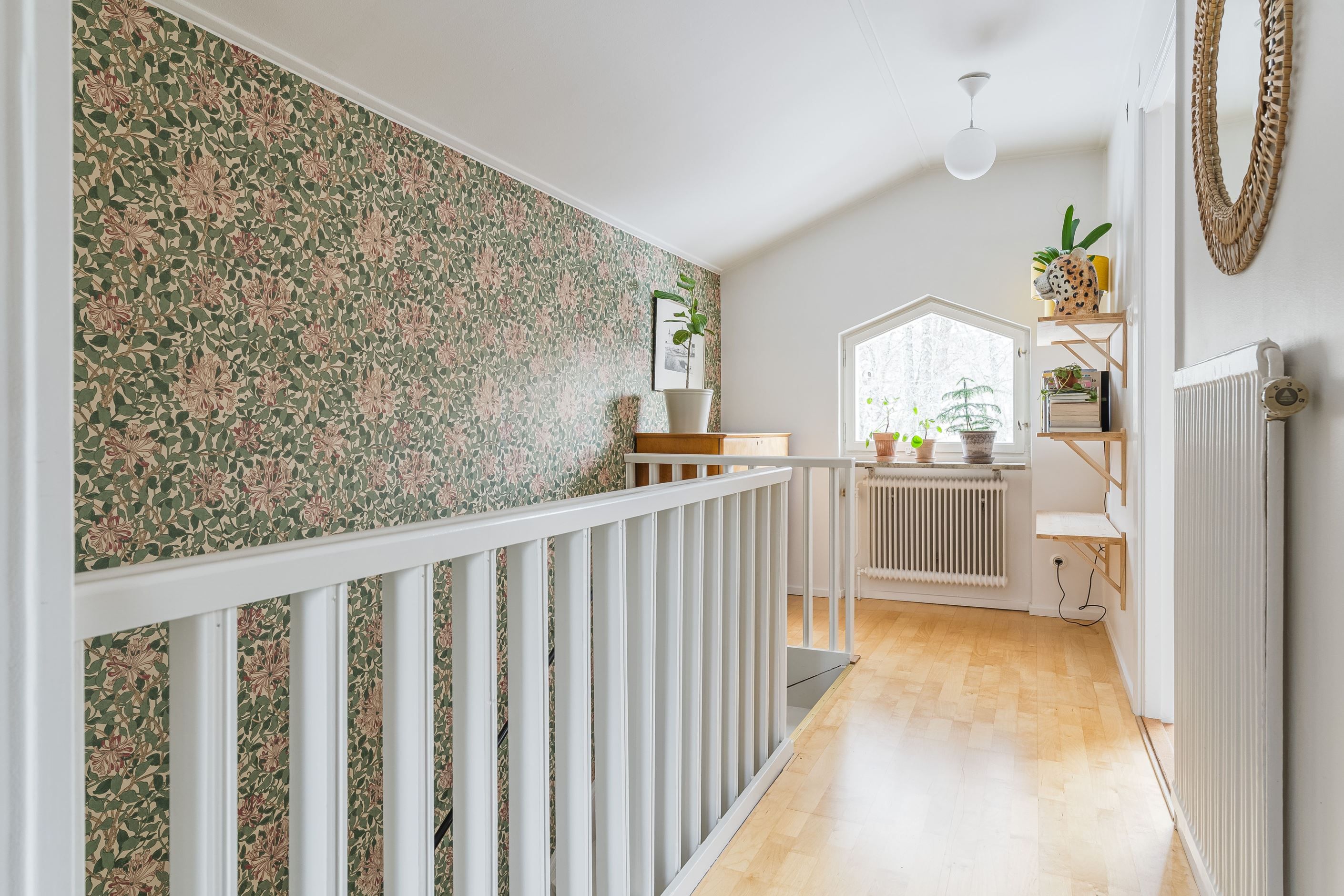 Bostaden välkomnar med en praktisk hall med slitstarkt klinkergolv och goda avhängningsmöjligheter som direkt ger en ordnad och hemtrevlig känsla. Köket går i harmoniska, jordnära kulörer och erbjuder generösa arbetsytor, gott om förvaring och modern maskinell utrustning som gör vardagen smidig. Det ljusa vardagsrummet präglas av stora fönsterpartier, charmig fiskbensparkett och en eldstad som skapar både värme och karaktär - eldstaden behöver tätas innan användning. Här finns gott om plats för både soffgrupp och matplats, och altandörren leder vidare ut till uteplatsen. På övre plan binds rummen samman av en möblerbar hall som lämpar sig utmärkt för en arbetsplats eller läshörna, tillsammans med två rofyllda sovrum med behagligt ljusinsläpp och god förvaring. De helkaklade badrummen i tidlösa toner förstärker den stilrena helheten, och det inredda källarplanet erbjuder ett ombonat allrum som passar utmärkt som extra vardagsrum, tonårsdel, hobbyrum eller ytterligare sovrum, kompletterat med praktisk tvättdel och goda förvaringslösningar.