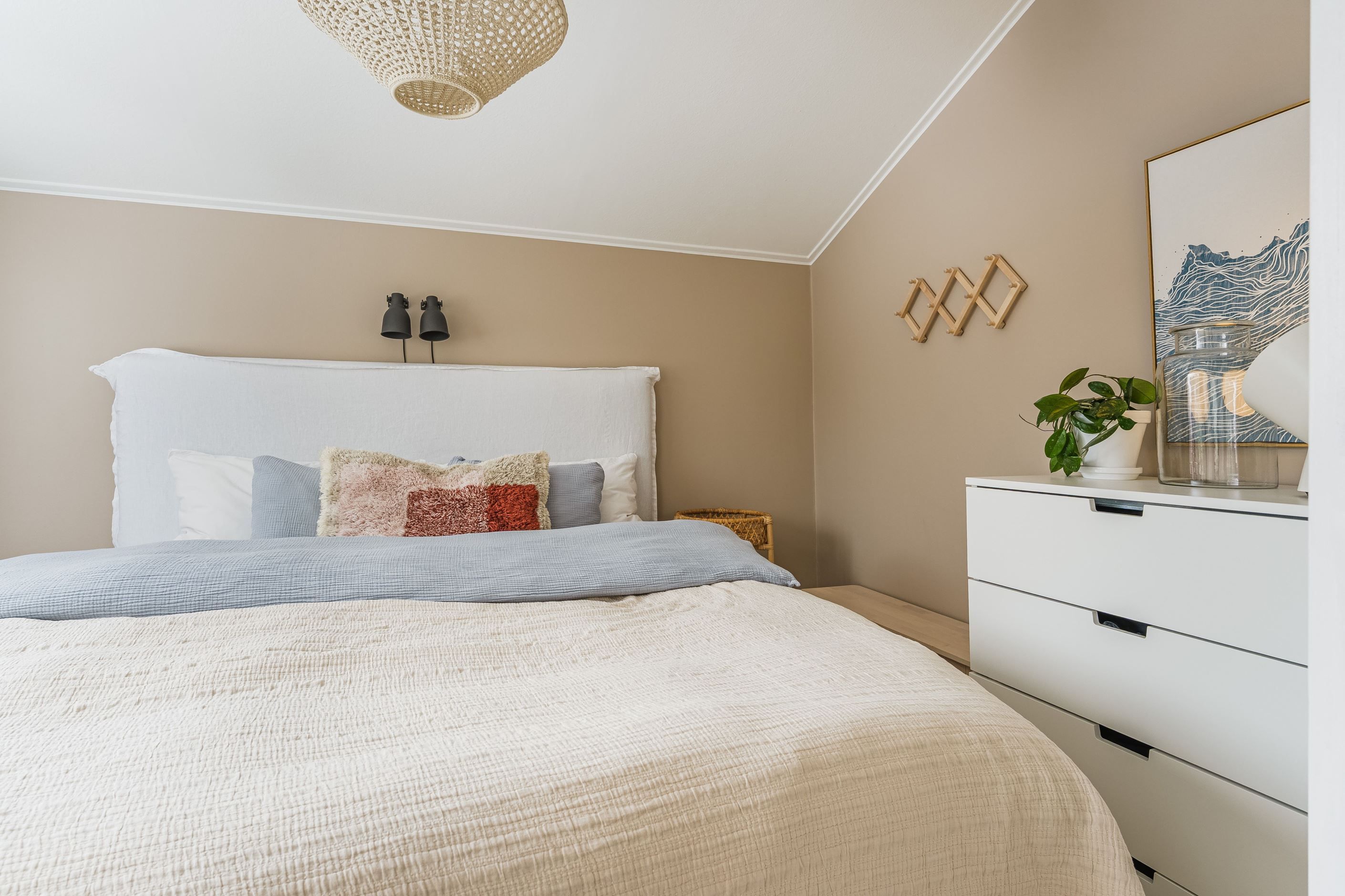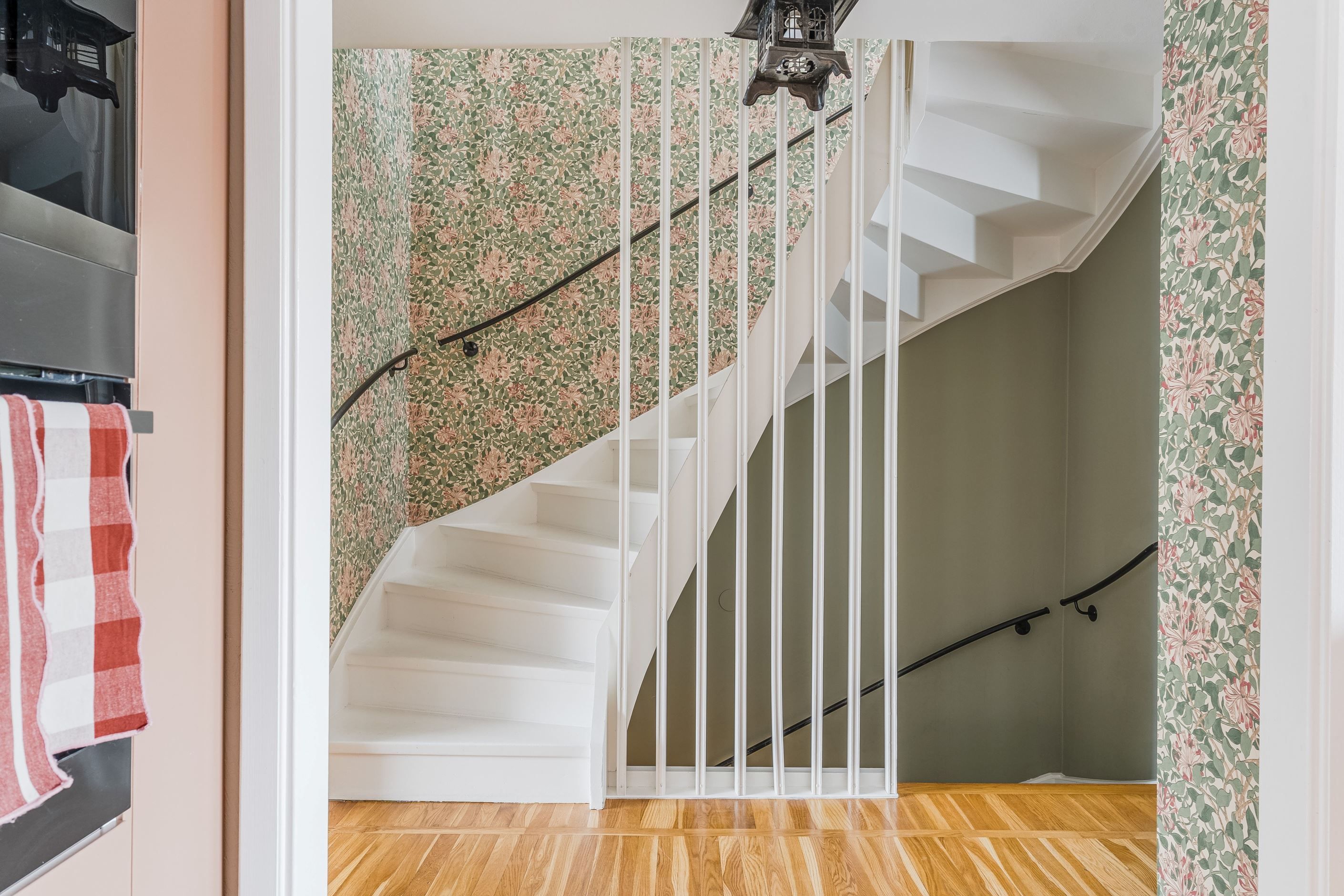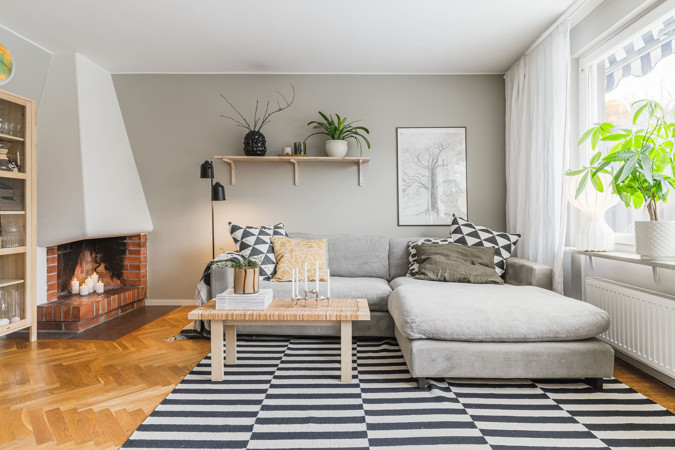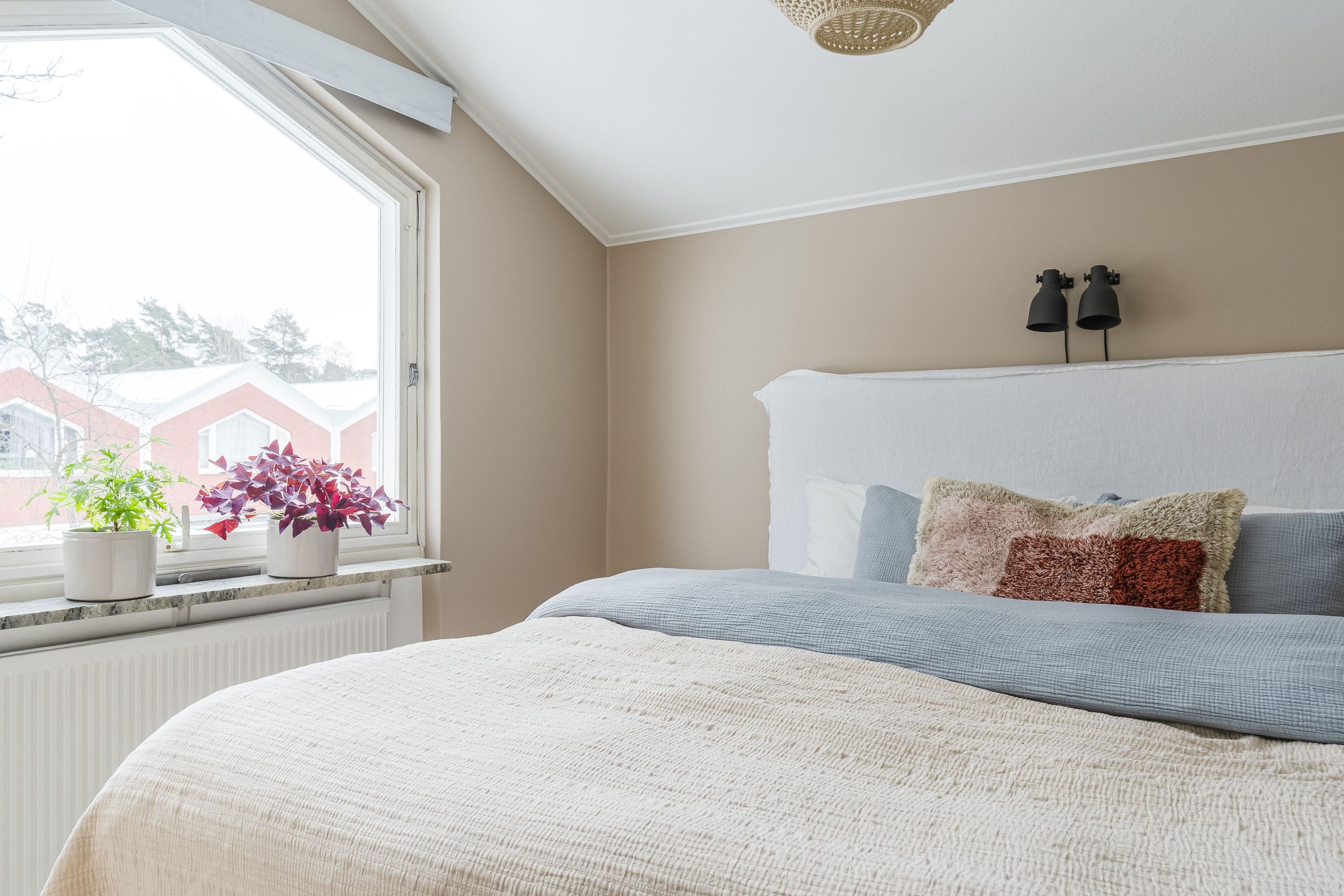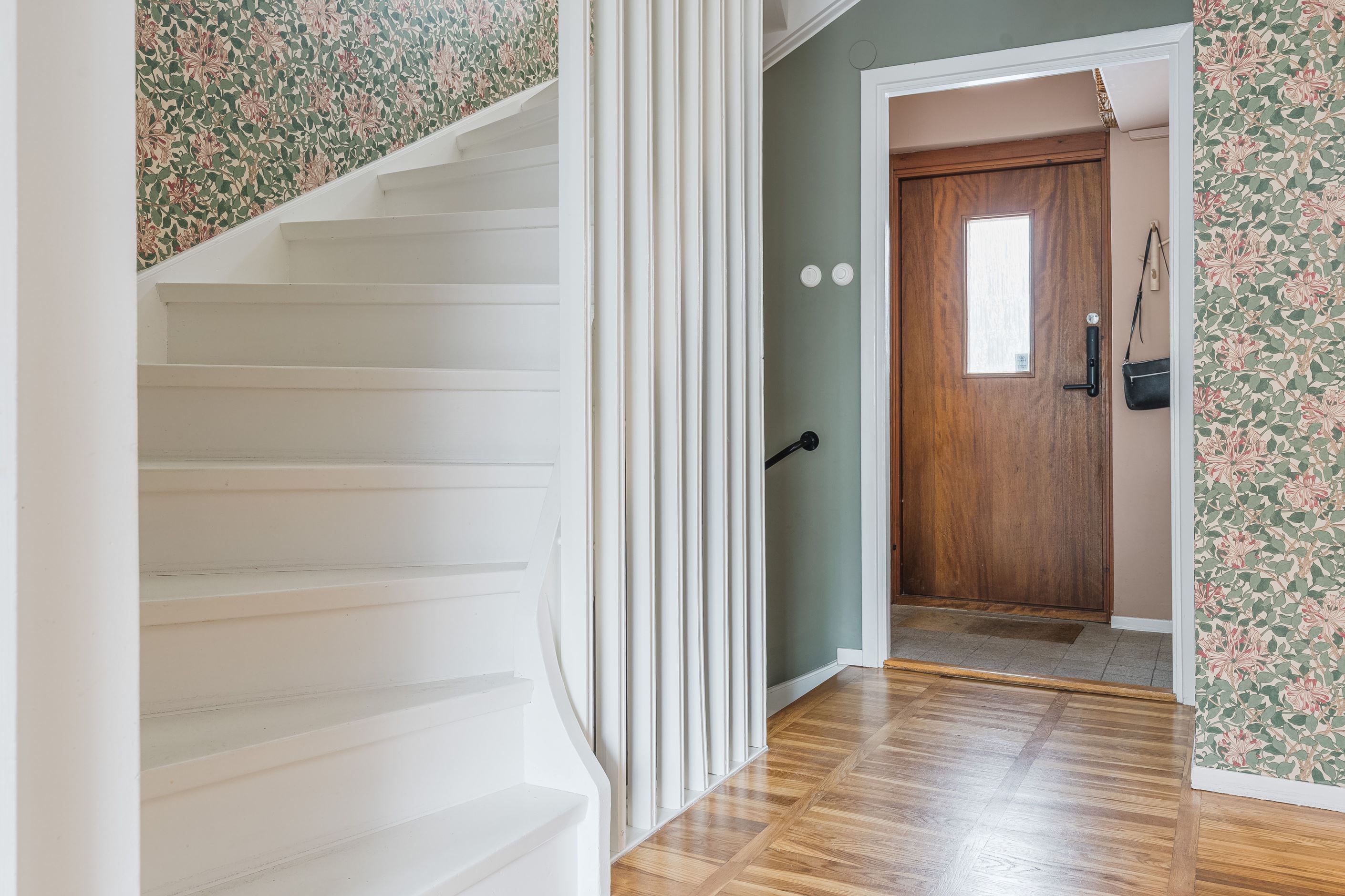 Bostaden välkomnar med en praktisk hall med slitstarkt klinkergolv och goda avhängningsmöjligheter som direkt ger en ordnad och hemtrevlig känsla. Köket går i harmoniska, jordnära kulörer och erbjuder generösa arbetsytor, gott om förvaring och modern maskinell utrustning som gör vardagen smidig. Det ljusa vardagsrummet präglas av stora fönsterpartier, charmig fiskbensparkett och en eldstad som skapar både värme och karaktär - eldstaden behöver tätas innan användning. Här finns gott om plats för både soffgrupp och matplats, och altandörren leder vidare ut till uteplatsen. På övre plan binds rummen samman av en möblerbar hall som lämpar sig utmärkt för en arbetsplats eller läshörna, tillsammans med två rofyllda sovrum med behagligt ljusinsläpp och god förvaring. De helkaklade badrummen i tidlösa toner förstärker den stilrena helheten, och det inredda källarplanet erbjuder ett ombonat allrum som passar utmärkt som extra vardagsrum, tonårsdel, hobbyrum eller ytterligare sovrum, kompletterat med praktisk tvättdel och goda förvaringslösningar.
