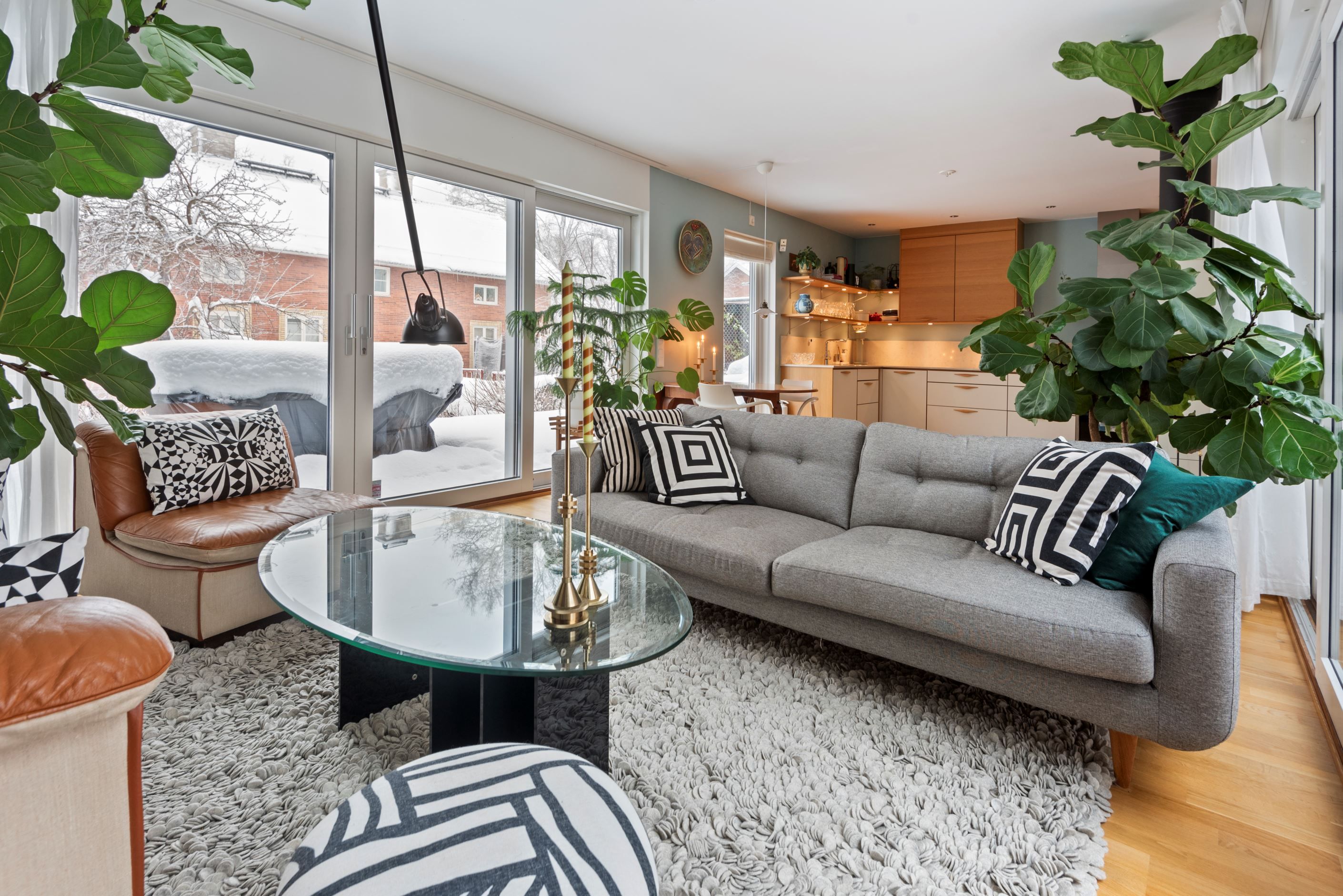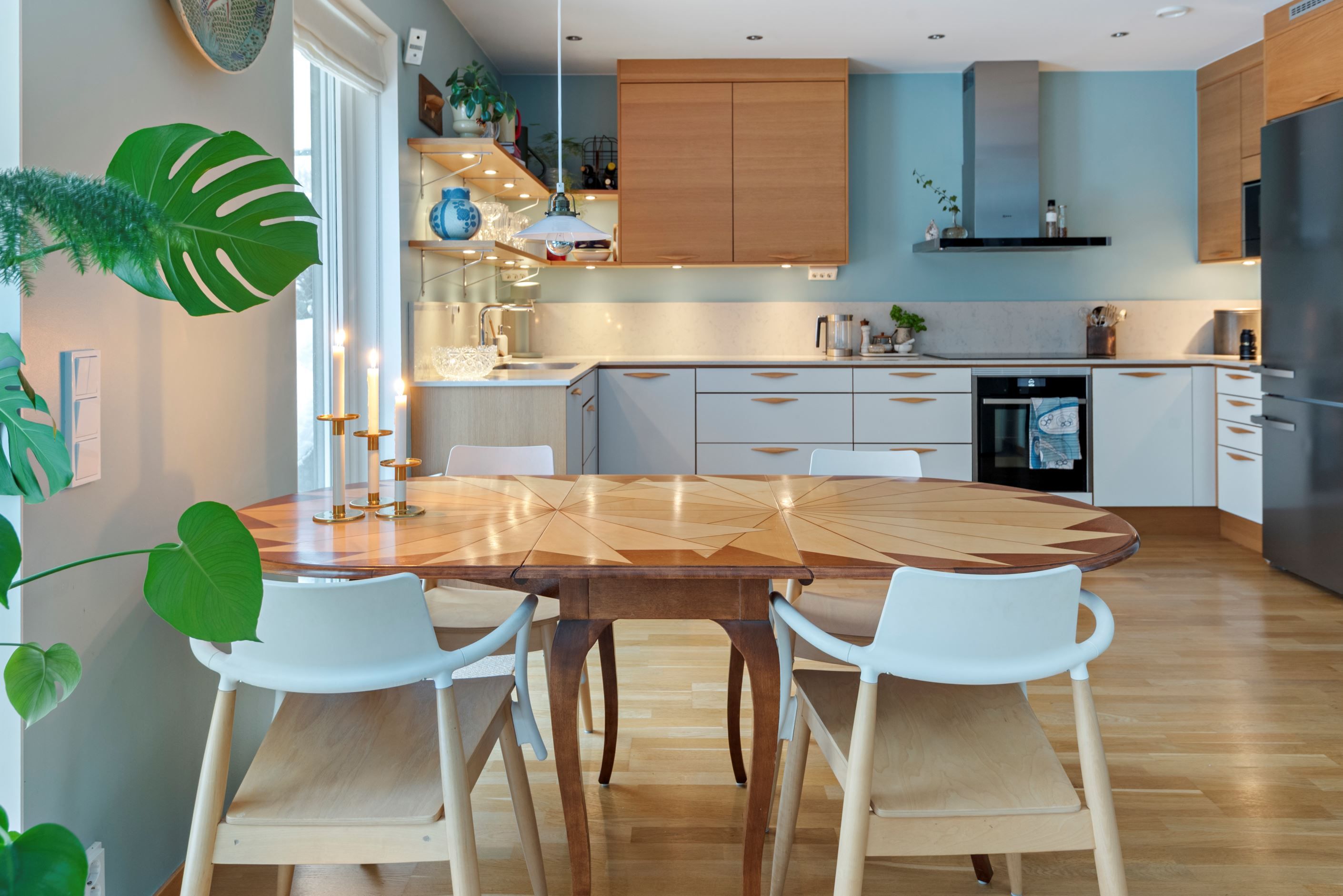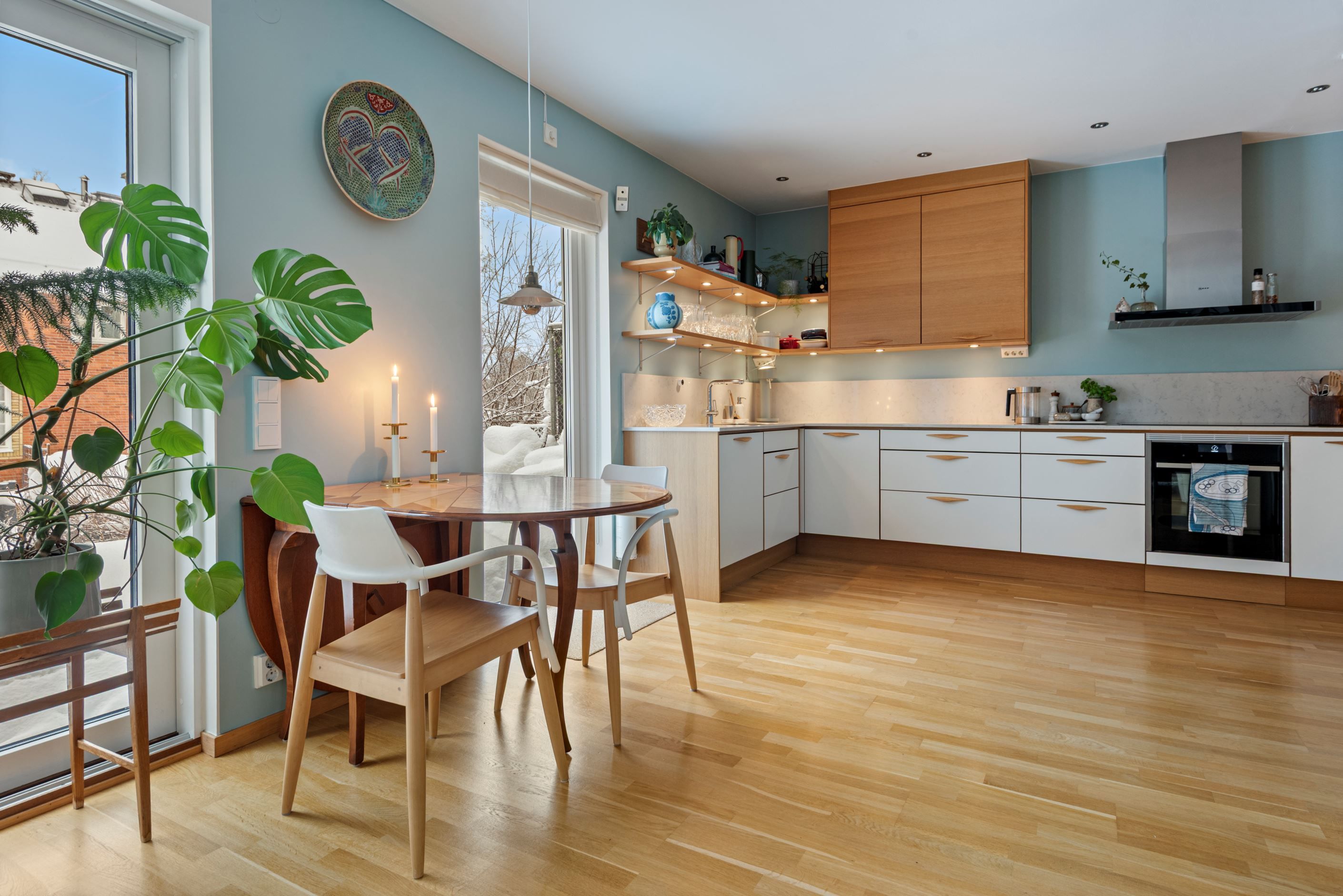 Ljus och fin med fyra uteplatser i olika väderstreck i form av takterrass, balkong samt altan i lä.