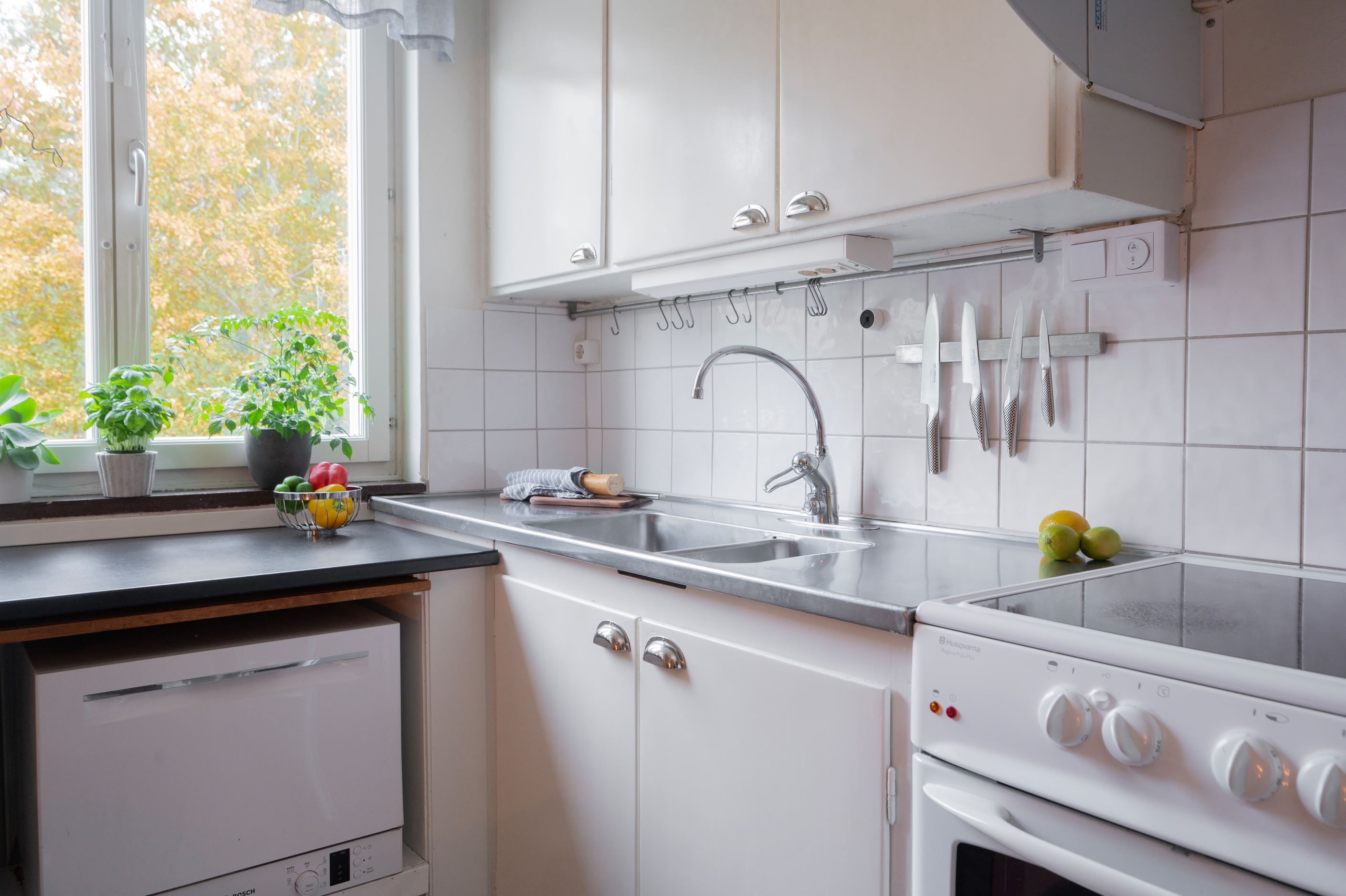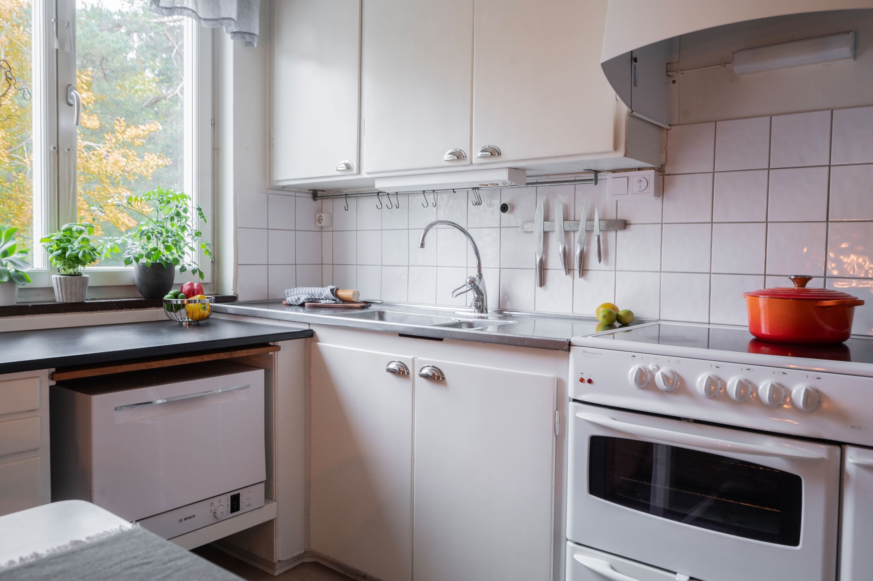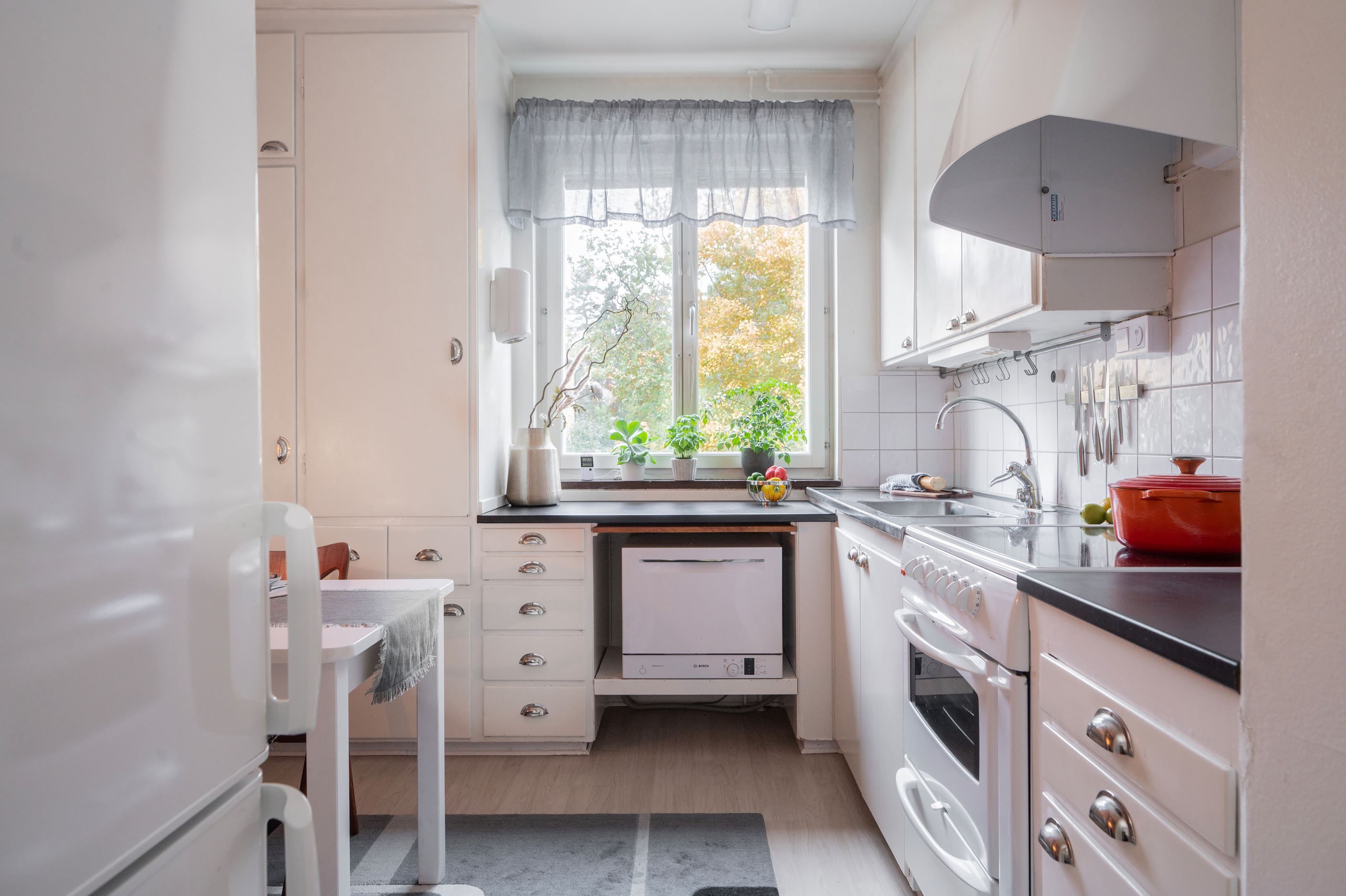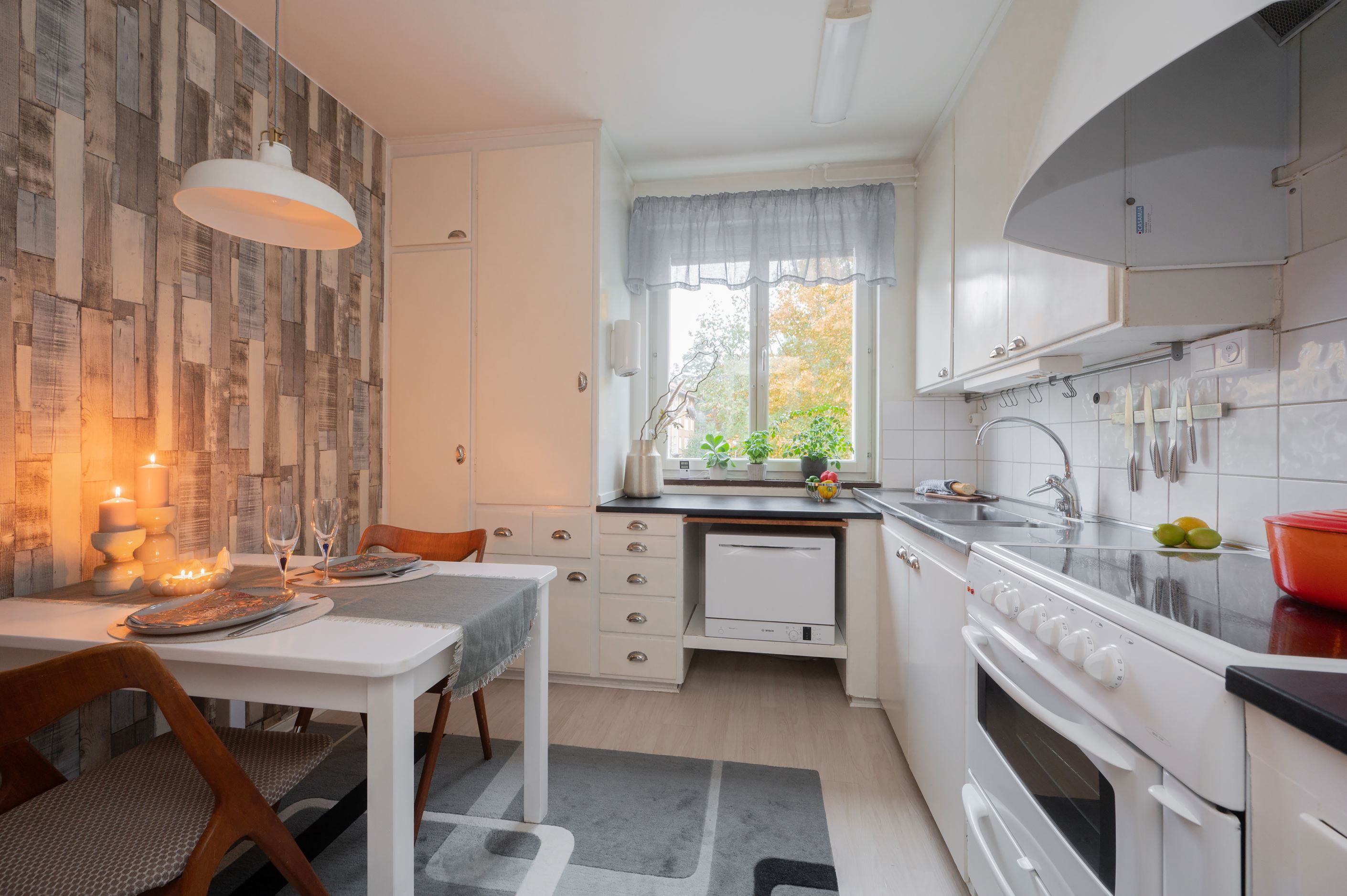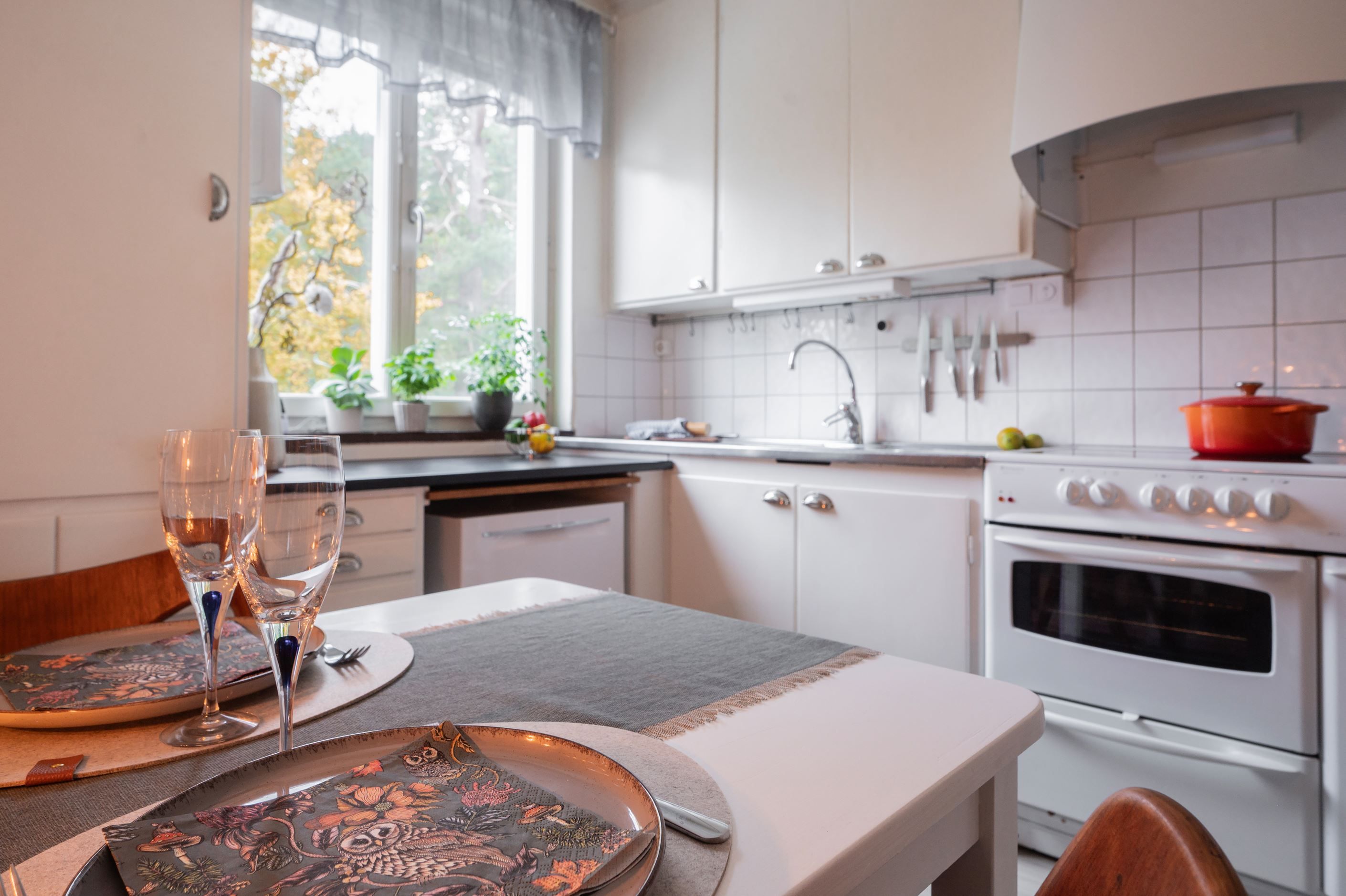 Köket har kvar sin ursprungliga charm och ger bostaden en personlig karaktär. Här finns gott om plats för matlagning och middag med vänner, och den genuina stilen skapar en fin kontrast till övriga moderna ytskikt i hemmet.