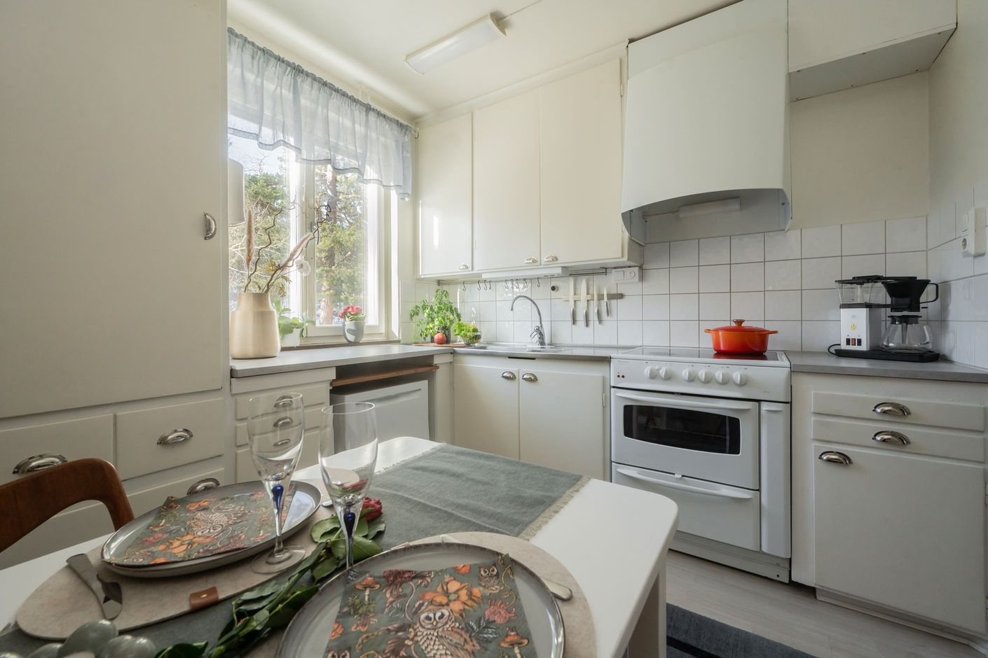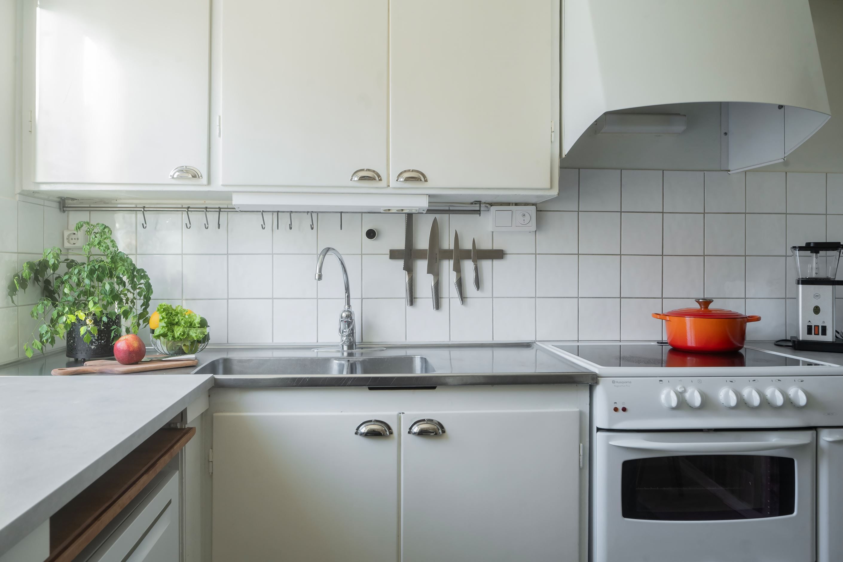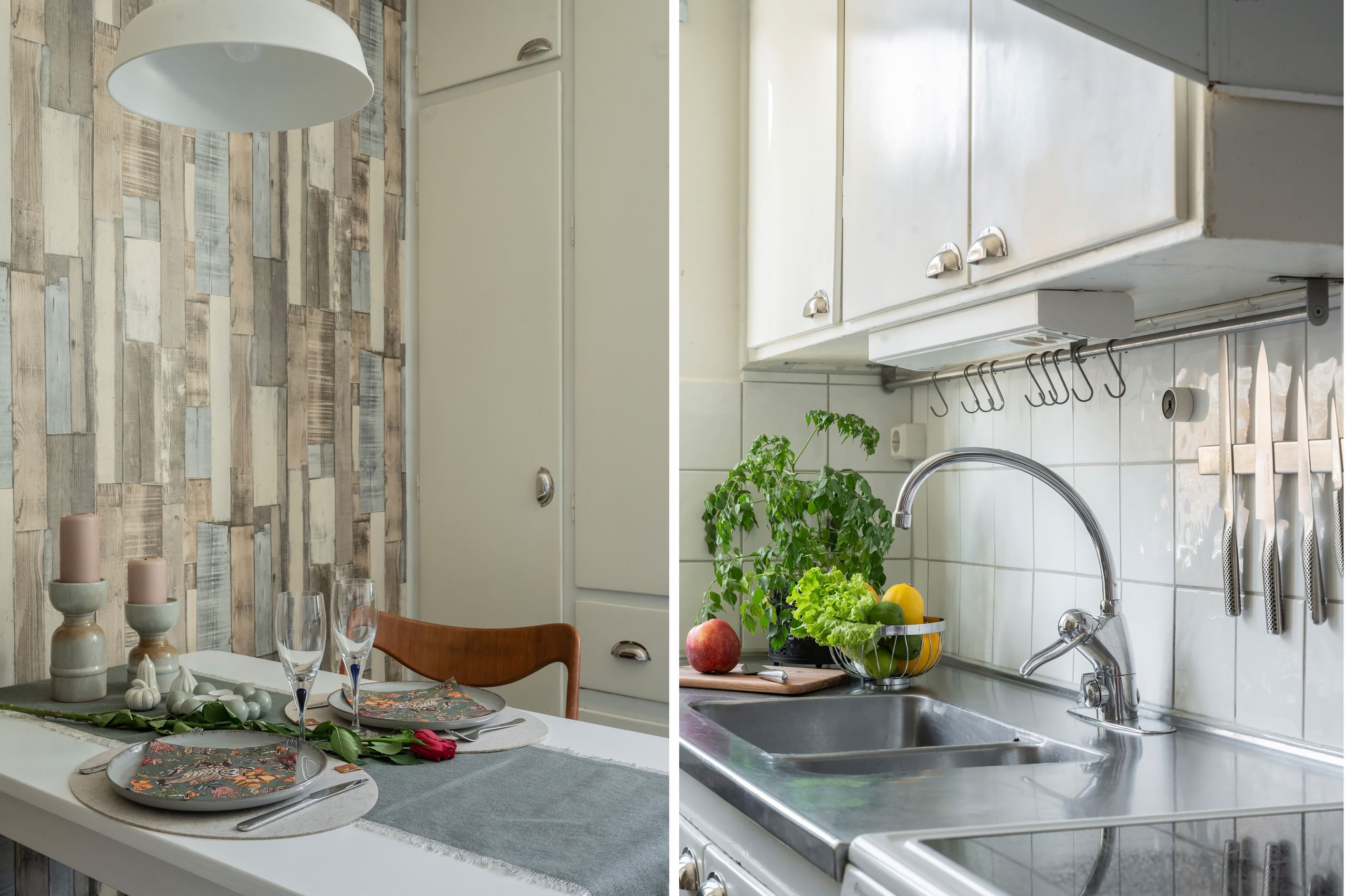 Köket har kvar sin ursprungliga charm och ger bostaden en personlig karaktär. Här finns gott om plats för matlagning och middag med vänner, och den genuina stilen skapar en fin kontrast till övriga moderna ytskikt i hemmet. Köket är utrustat diskmaskin, spis och ugn.