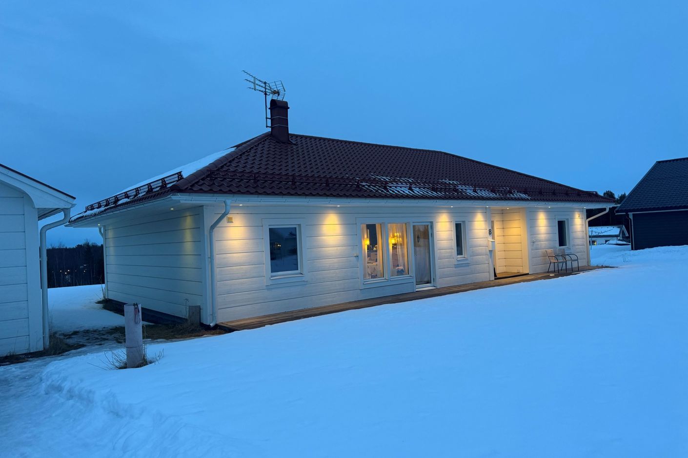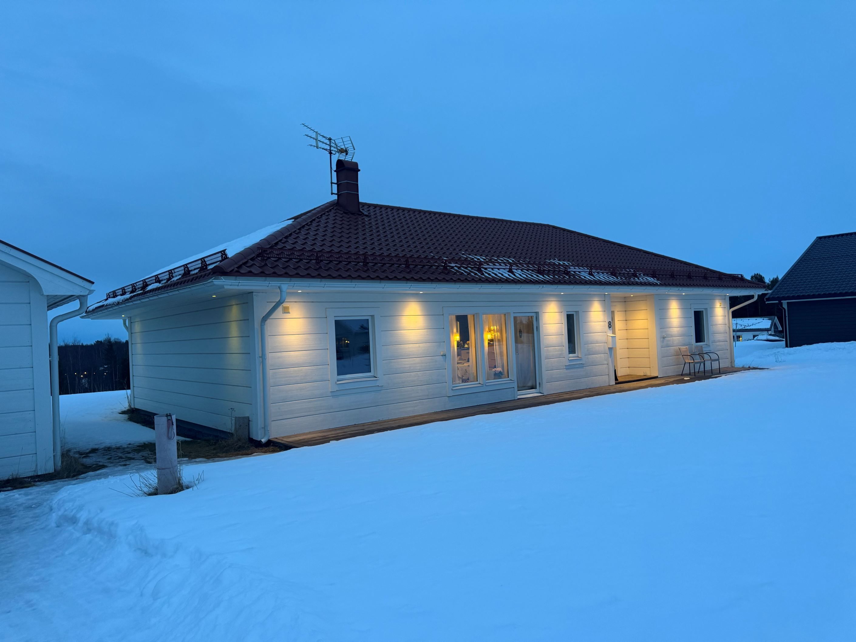 Planlösningen är öppen och modern, och den mysiga kaminen höjer trivselfaktorn under de mörka och kalla månaderna. Huset erbjuder tre sovrum. Det stilrena badrummen har grått klinkergolv, vitkaklade väggar och inrymmer både badkar, bastu och en avkopplande relaxdel. Här finns även en dusch, wc, handfat och tillgång till altanen.