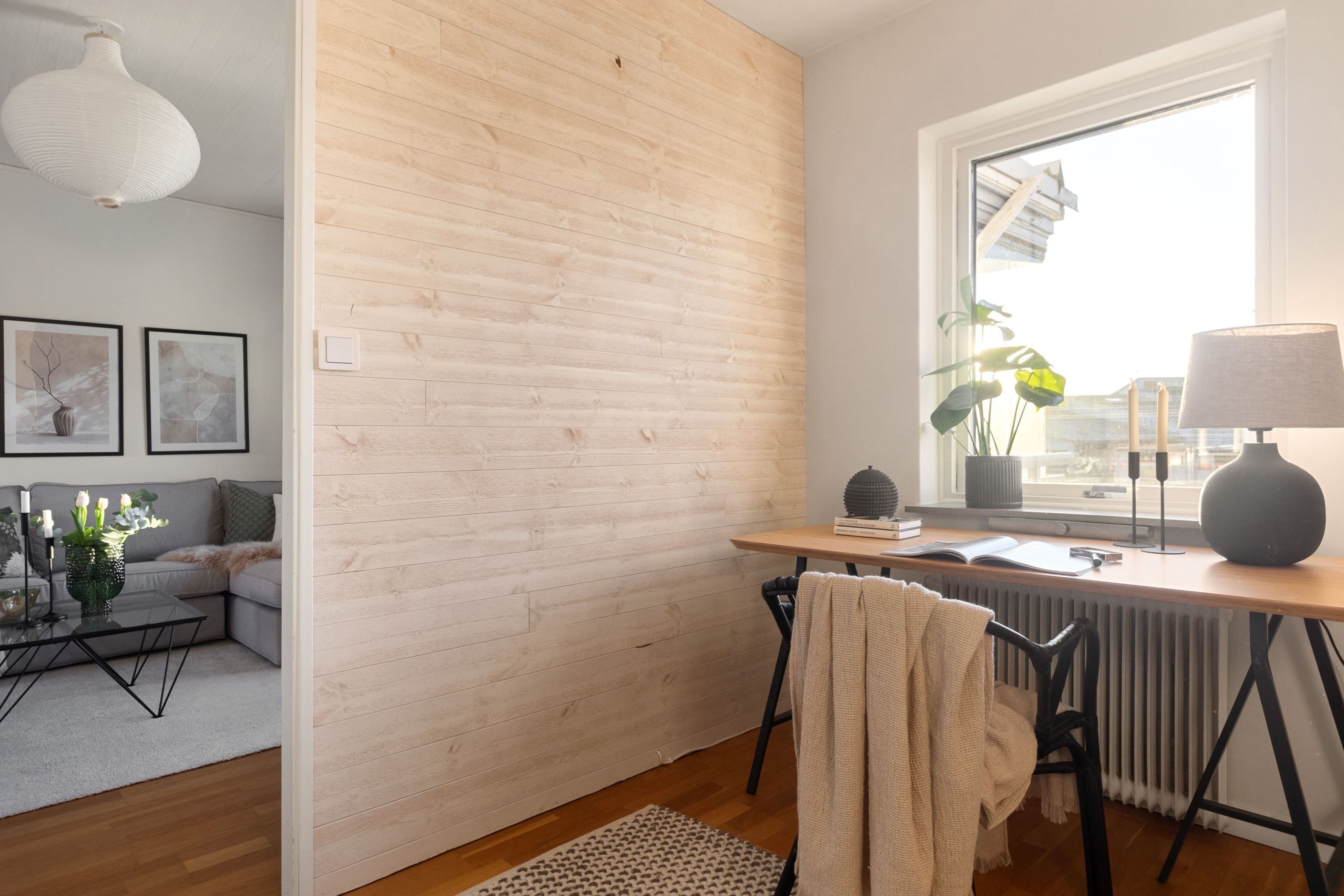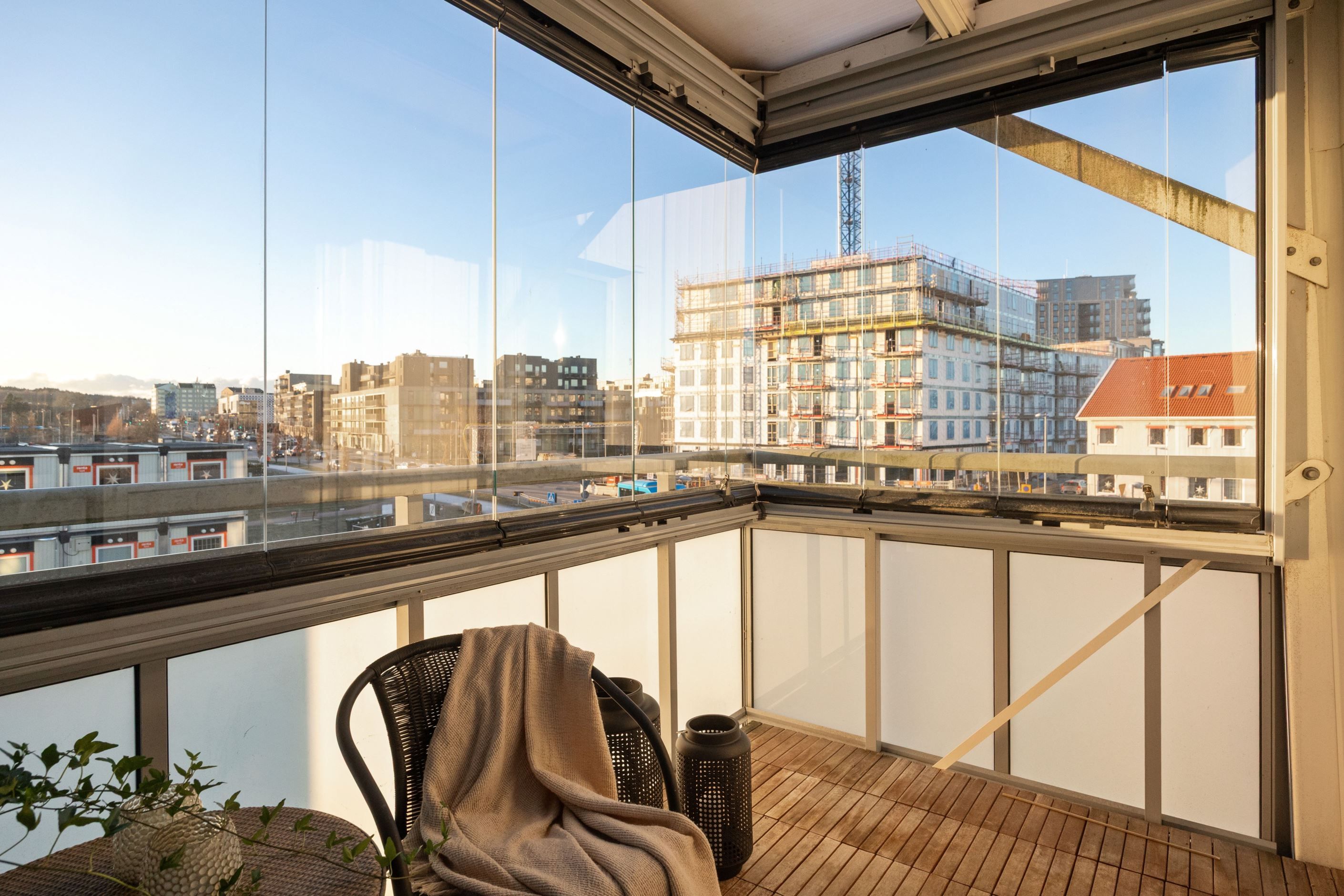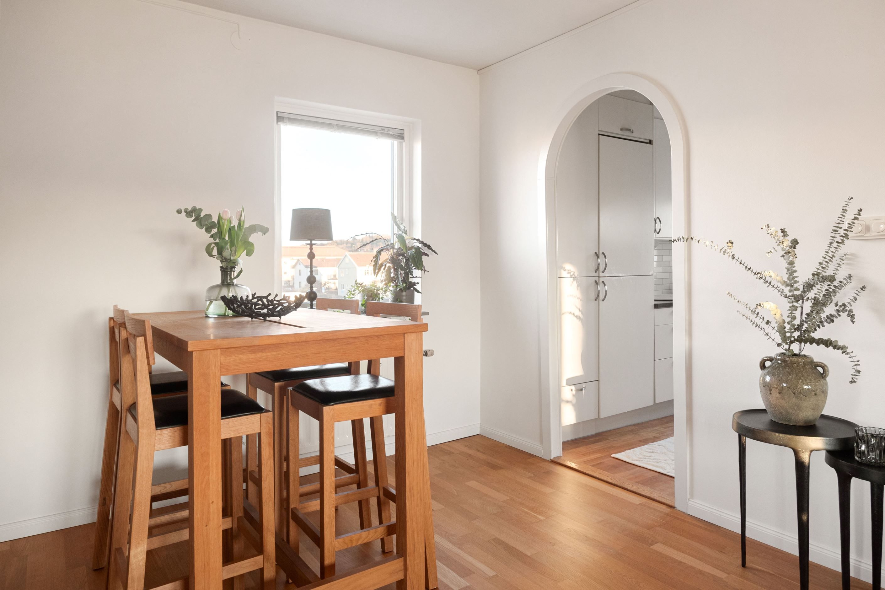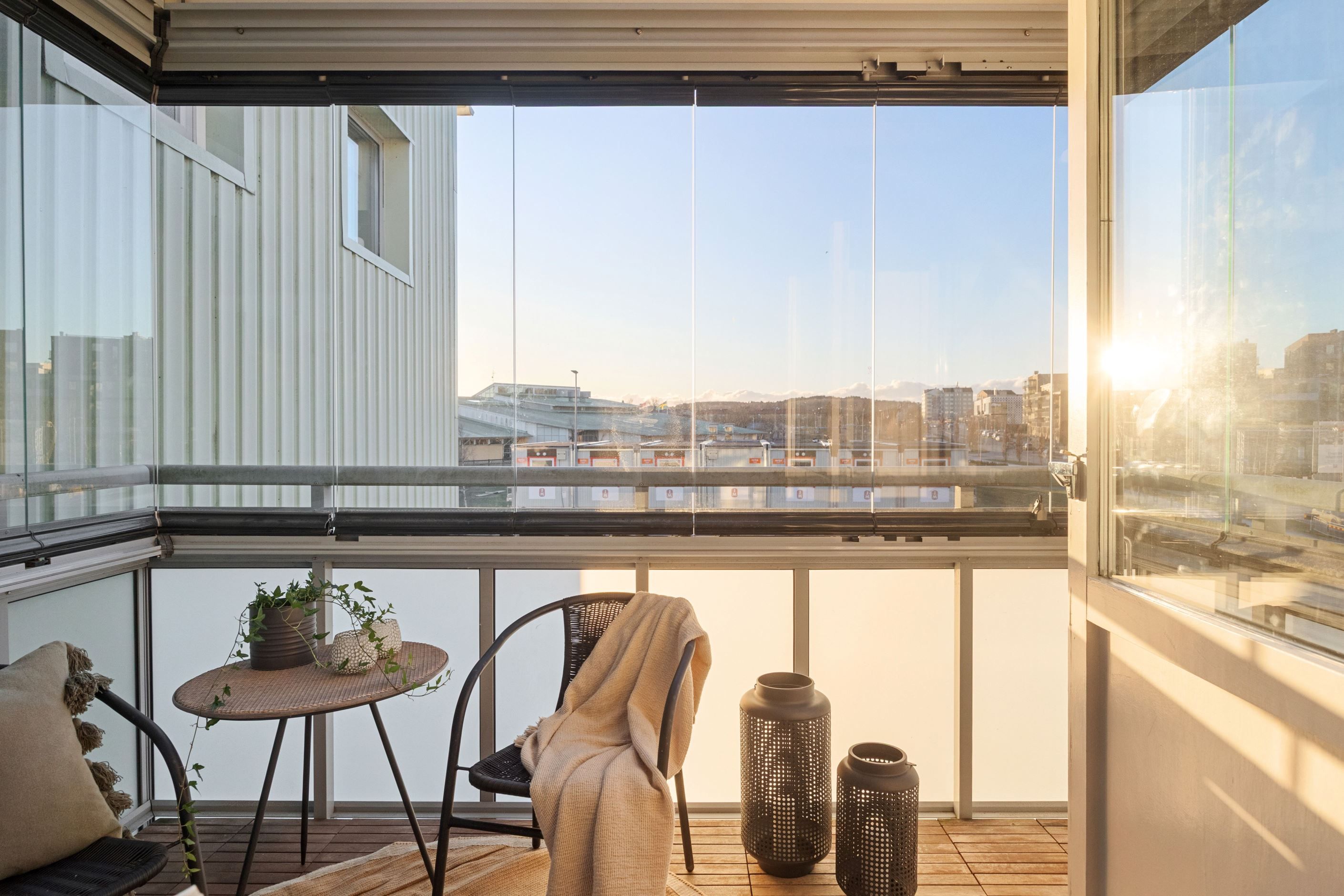 Bostaden har ett rymligt vardagsrum med plats för både soffgrupp och matplats. Härifrån nås den inglasade balkongen med kvällssol som fungerar som ett extra rum under stora delar av året och bidrar till ett mervärde i boendet.