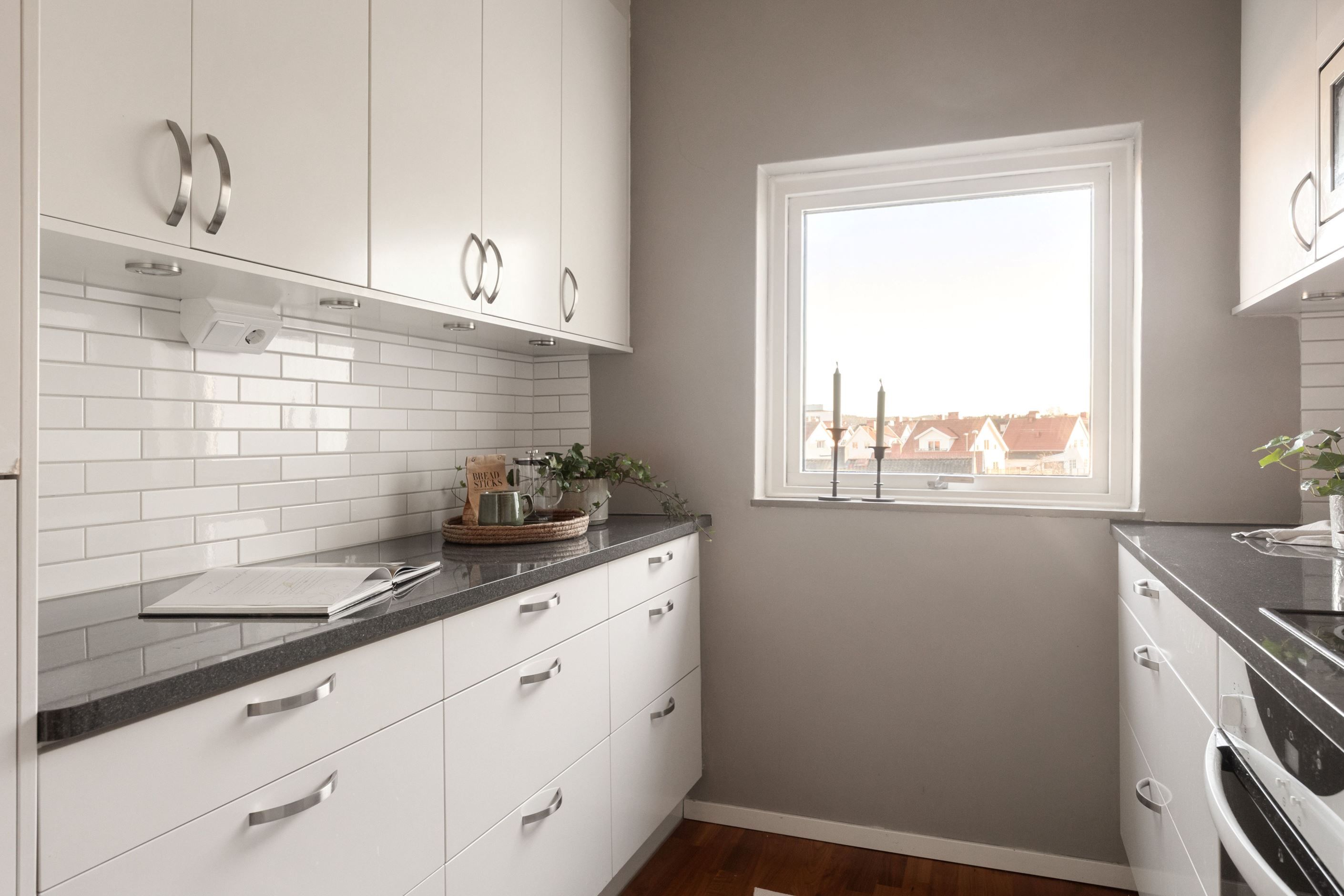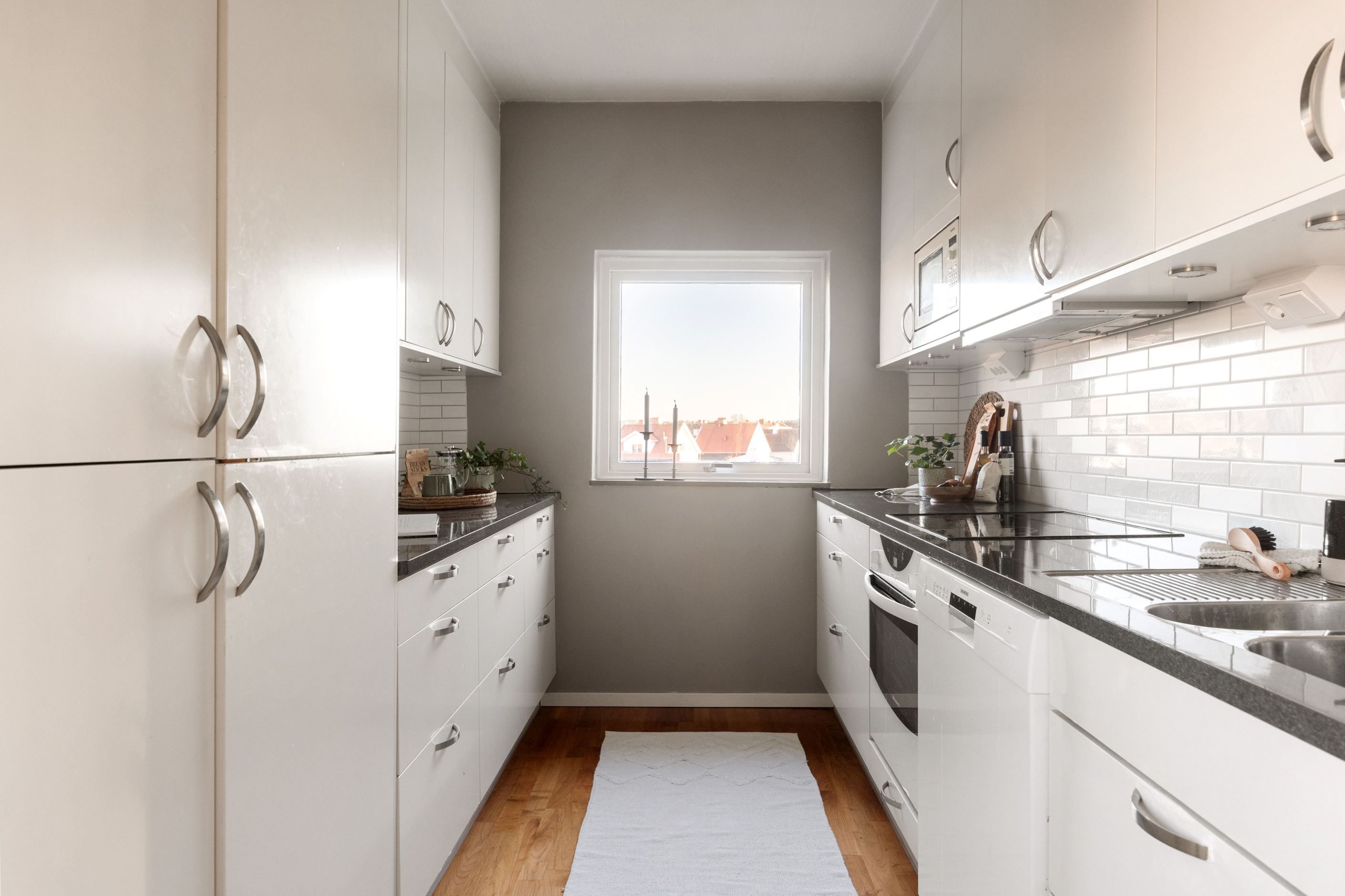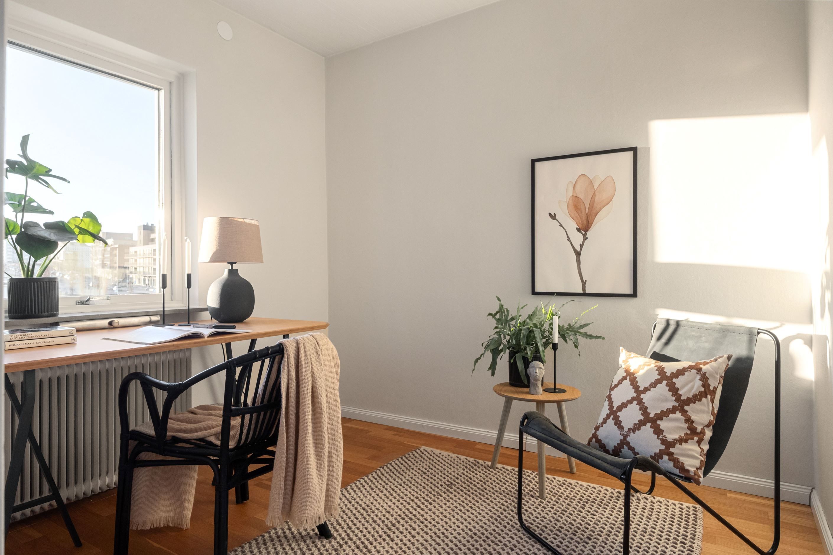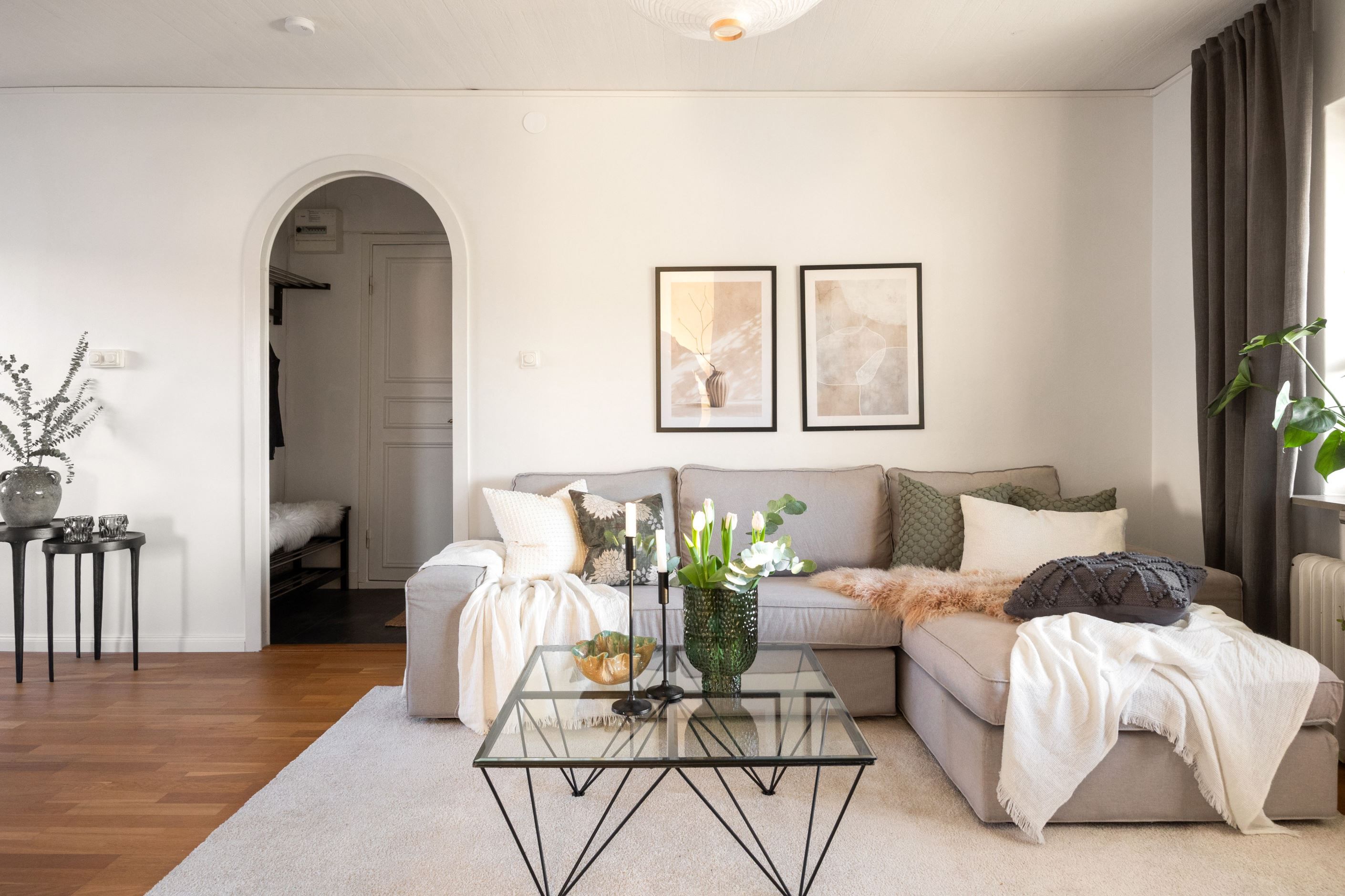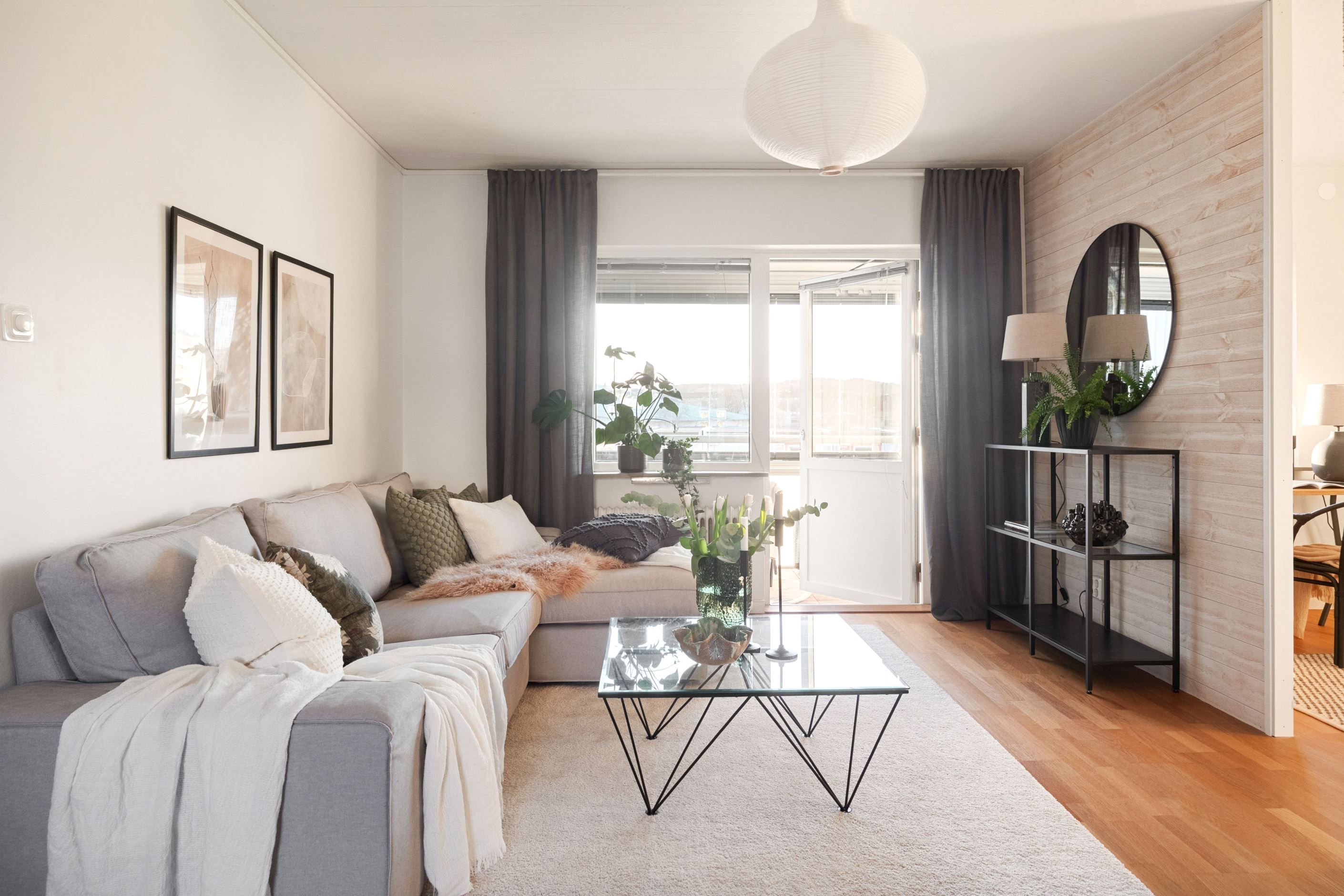 Bostaden har ett rymligt vardagsrum med plats för både soffgrupp och matplats. Härifrån nås den inglasade balkongen med kvällssol som fungerar som ett extra rum under stora delar av året och bidrar till ett mervärde i boendet.