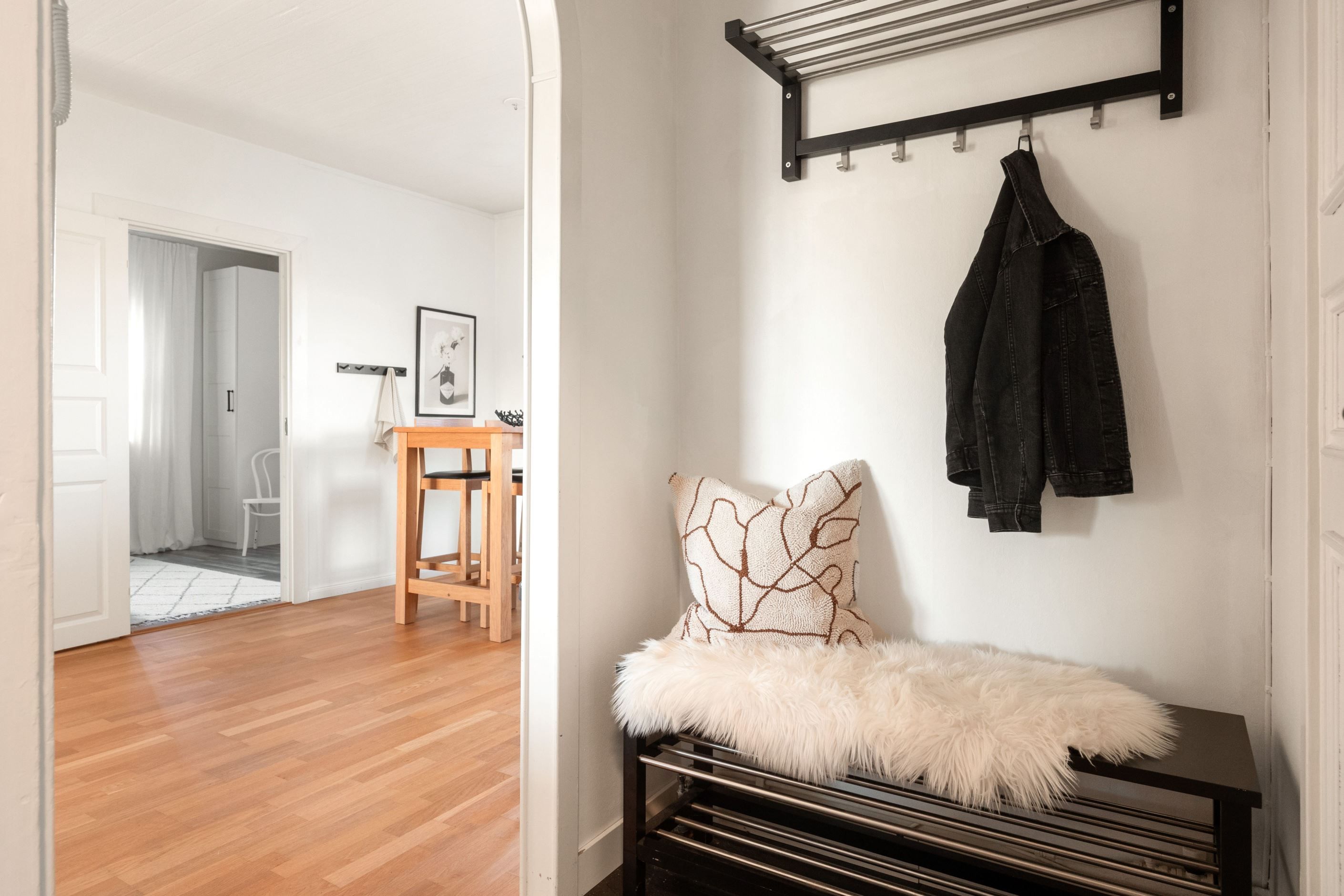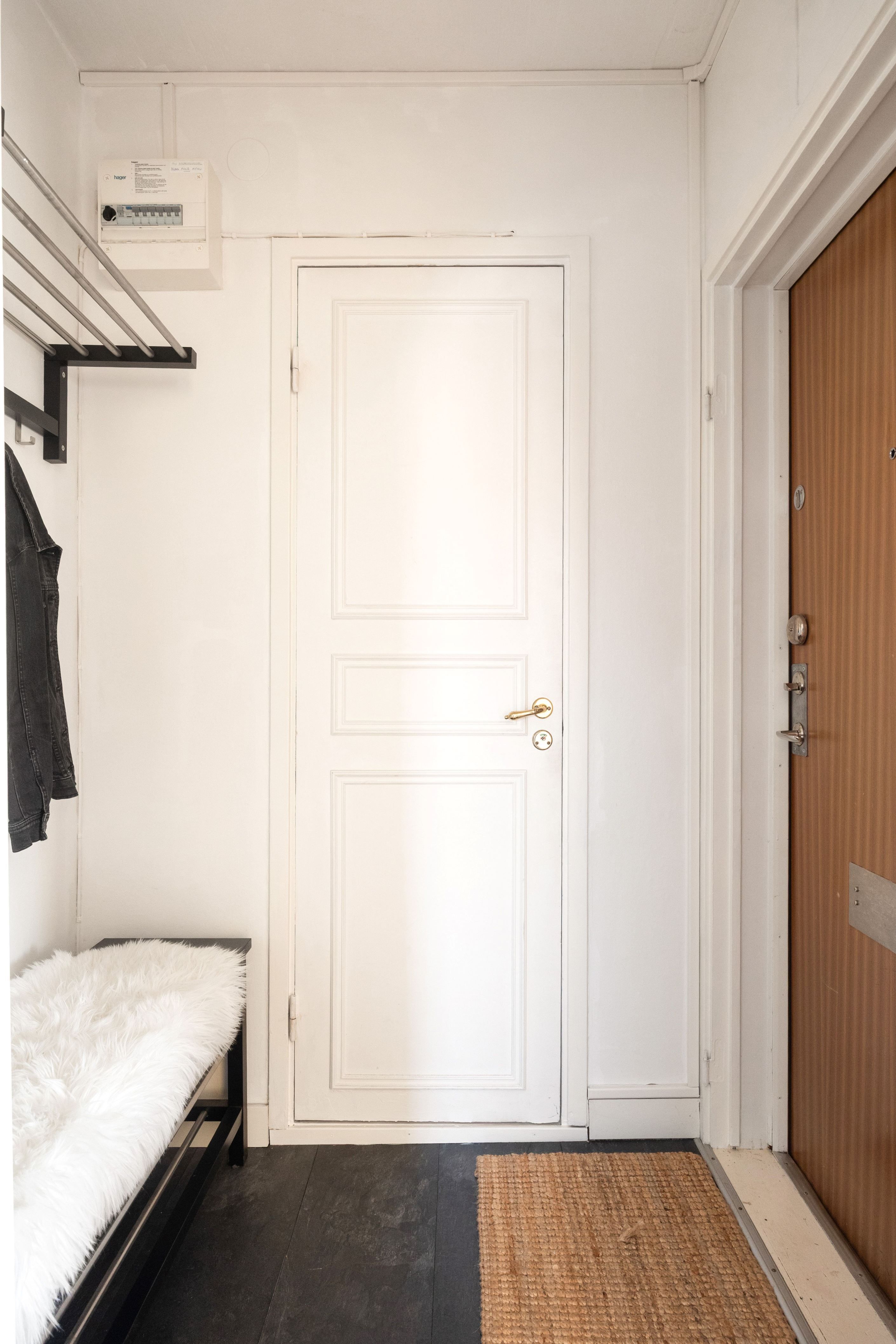 Badrummet är ljust och funktionellt med dusch och tvättmöjligheter. I hallen finns goda avhängningsmöjligheter.