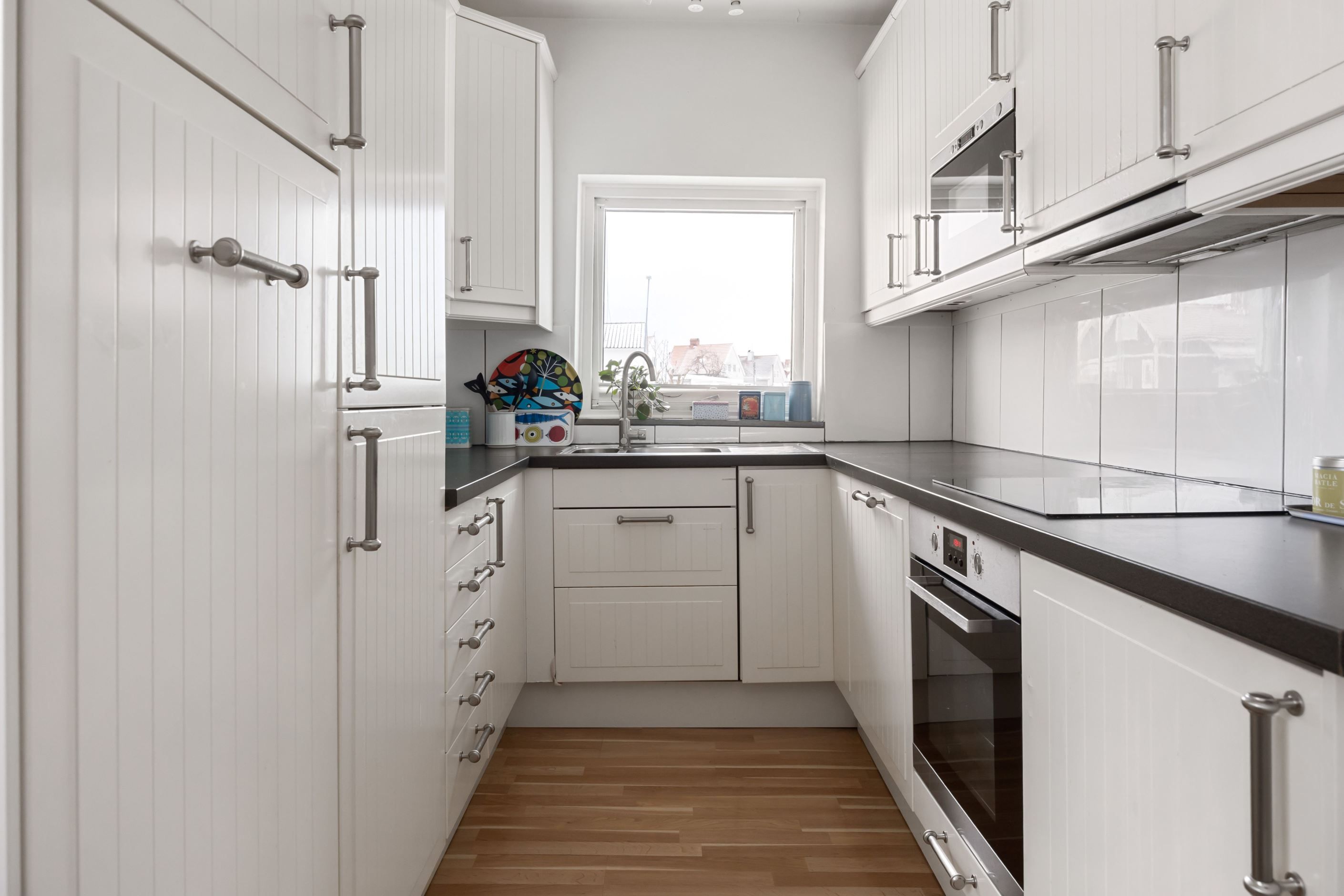 Köket är stilrent och praktiskt utformat med gott om förvaring, bra arbetsytor och plats för matbord vid fönstret. Diskmaskin och inbyggd tvättmaskin finns installerad för bekvämlighetens skull.