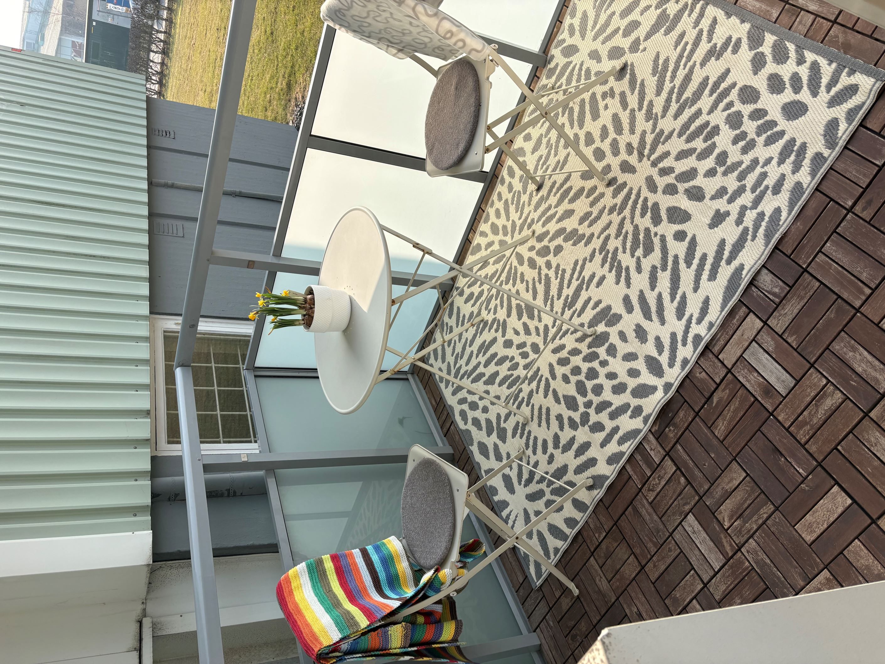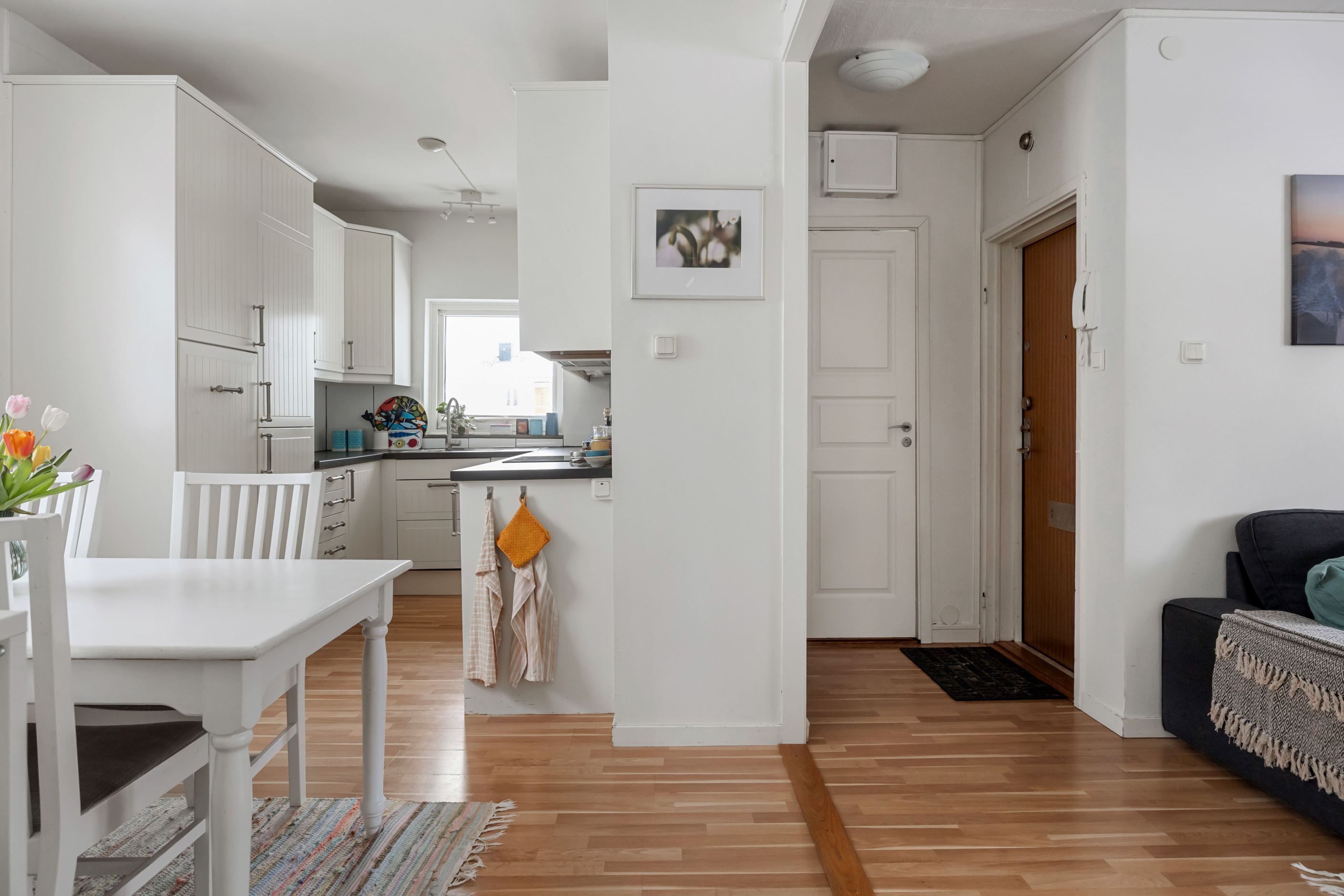 Planlösningen är väl genomarbetad och skapar en luftig känsla trots den effektiva ytan. Det generösa vardagsrummet har ett härligt ljusflöde från stora fönsterpartier och erbjuder plats för både soffgrupp och tv-möbel. Härifrån nås balkongen som ligger i markplan – en perfekt plats för utemöbler och avkoppling när solen letar sig fram under eftermiddag och kväll.
