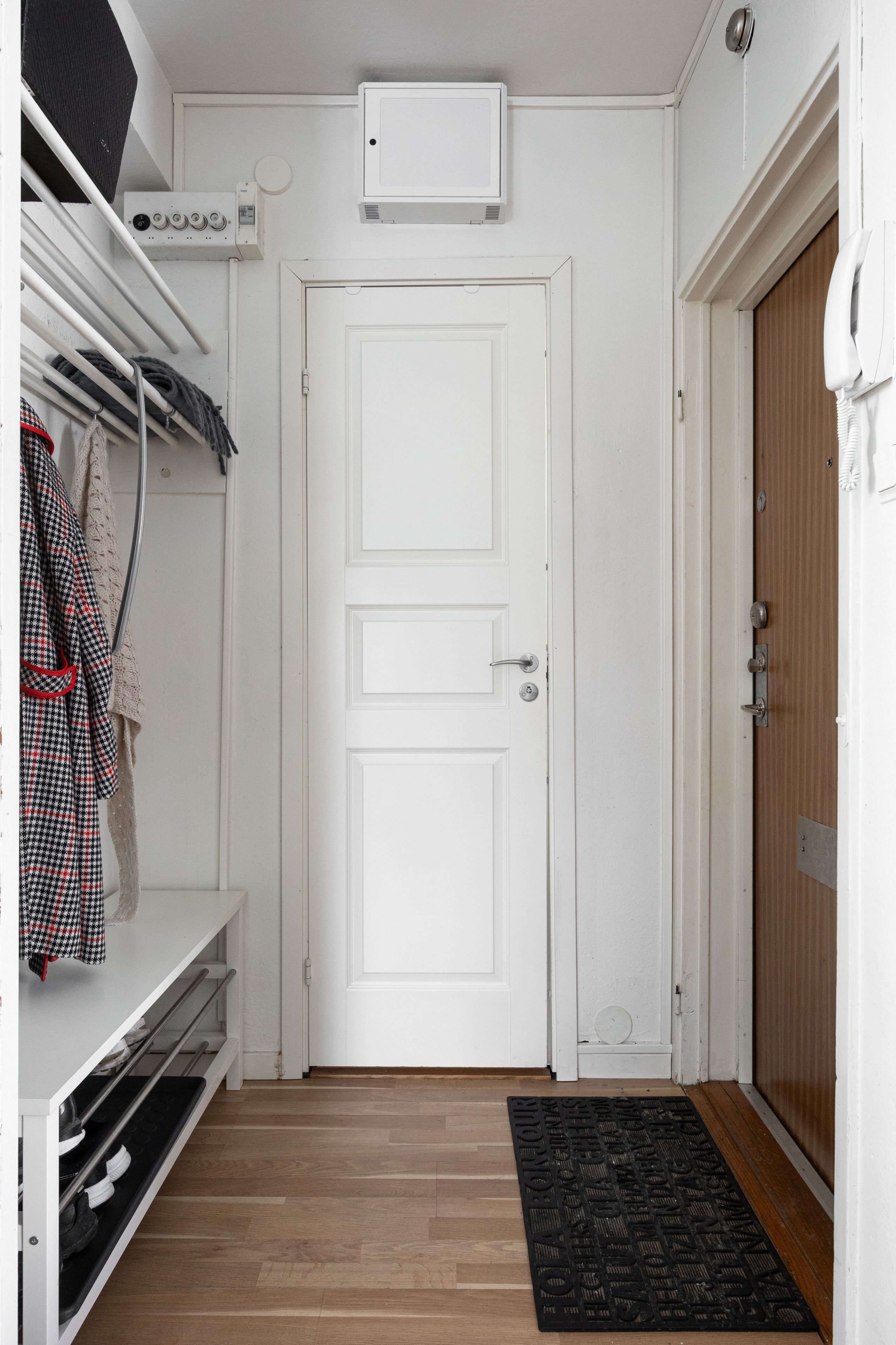 Badrummet är helkaklat och utrustat med bla. dusch och golvvärme. Entrén är praktisk med plats för avhängning och förvaring. En parkeringsplats om 150 kr/mån tillhandahålls till varje lägenhetsinnehavare,