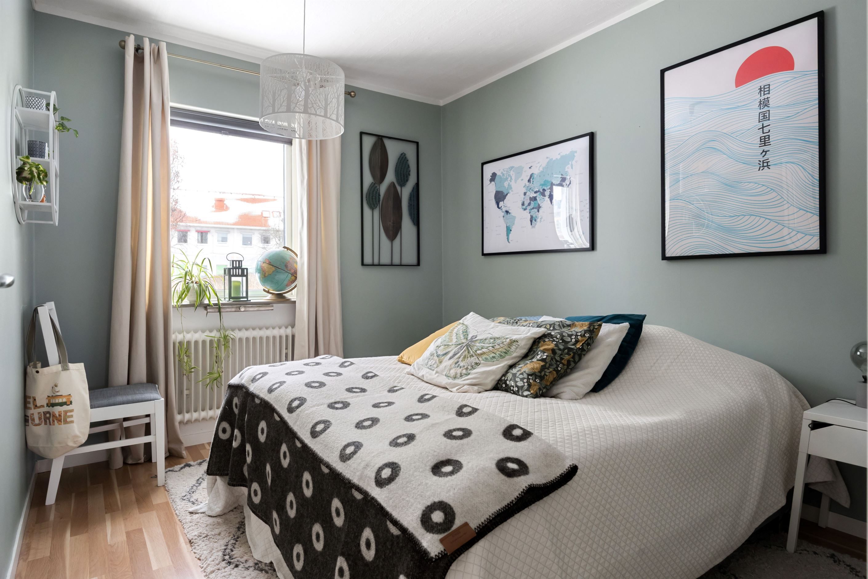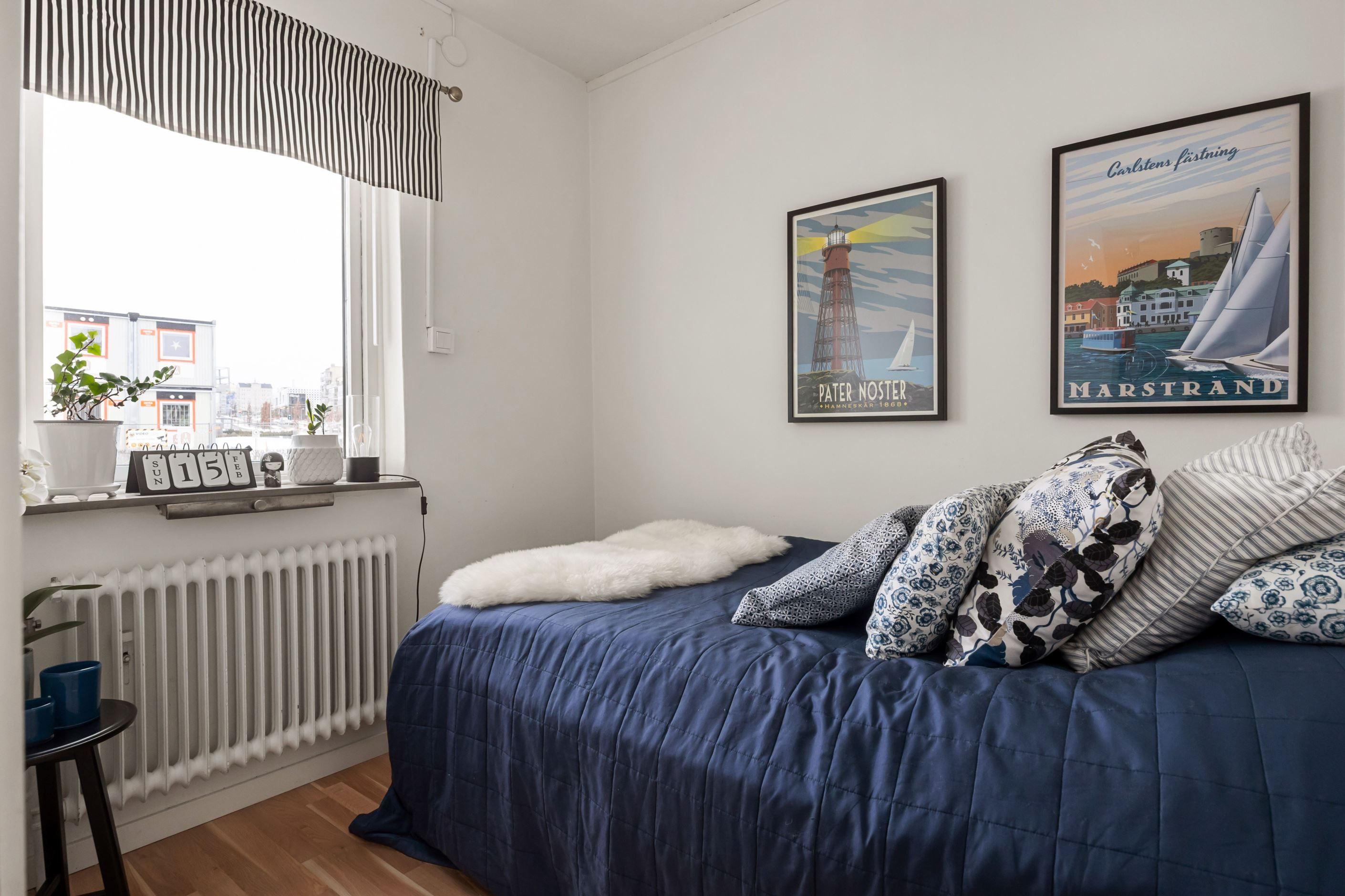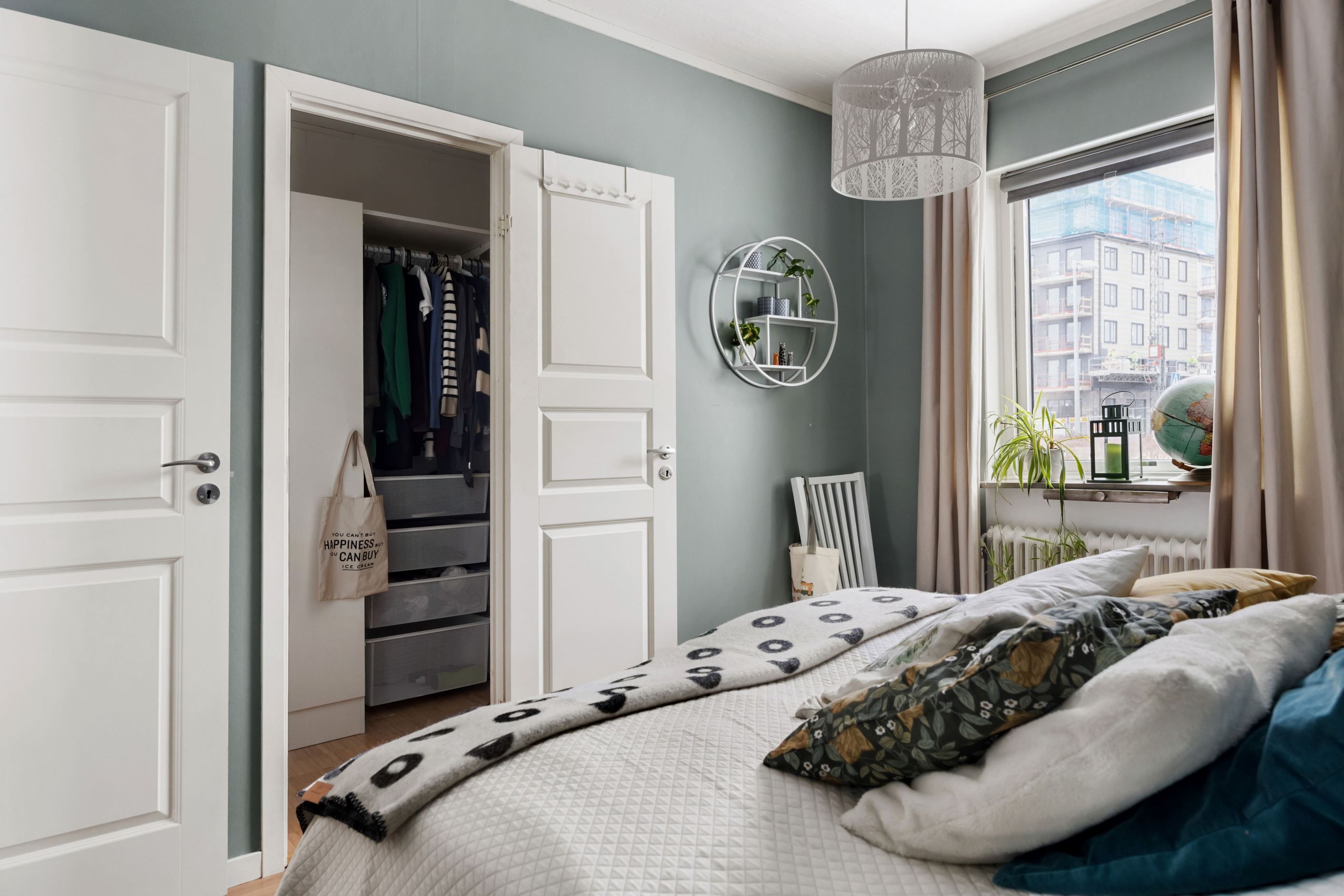 Bostaden erbjuder två sovrum. Det större sovrummet har en harmonisk färgsättning och direkt anslutning till en rymlig klädkammare som ger mycket goda förvaringsmöjligheter. Det mindre rummet fungerar utmärkt som barnrum, gästrum eller hemmakontor – ett flexibelt utrymme efter behov.