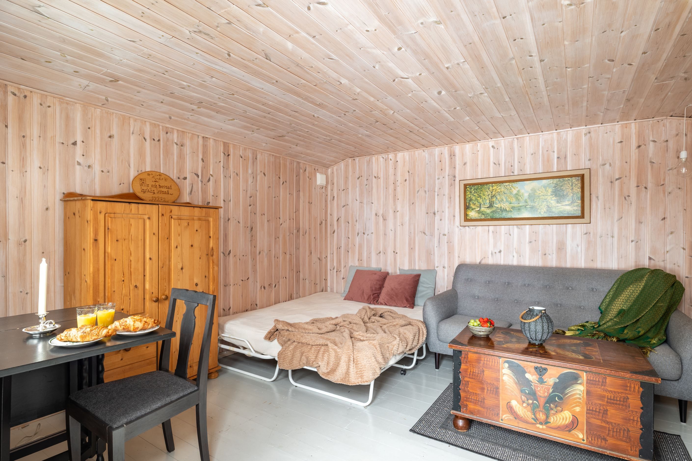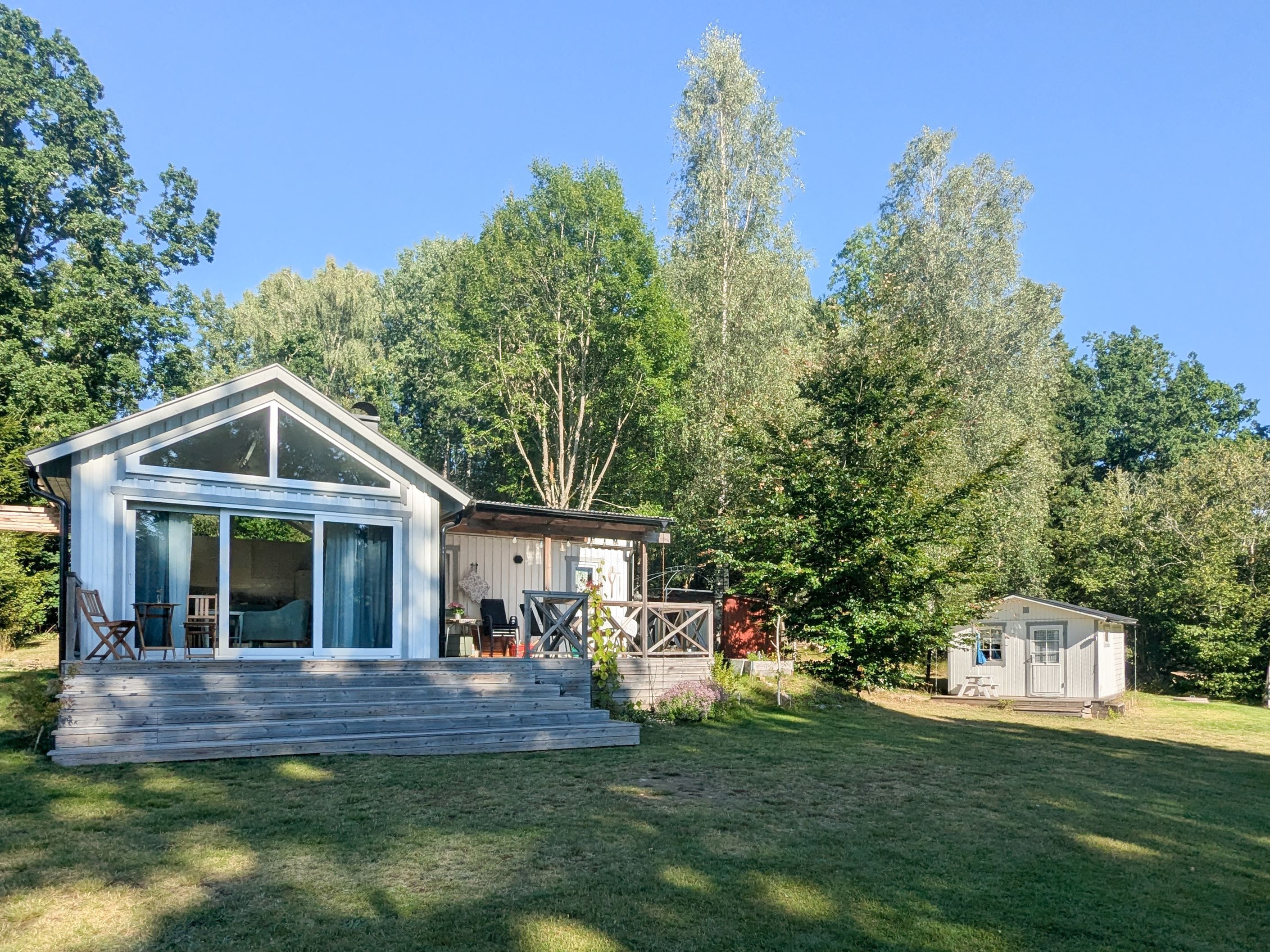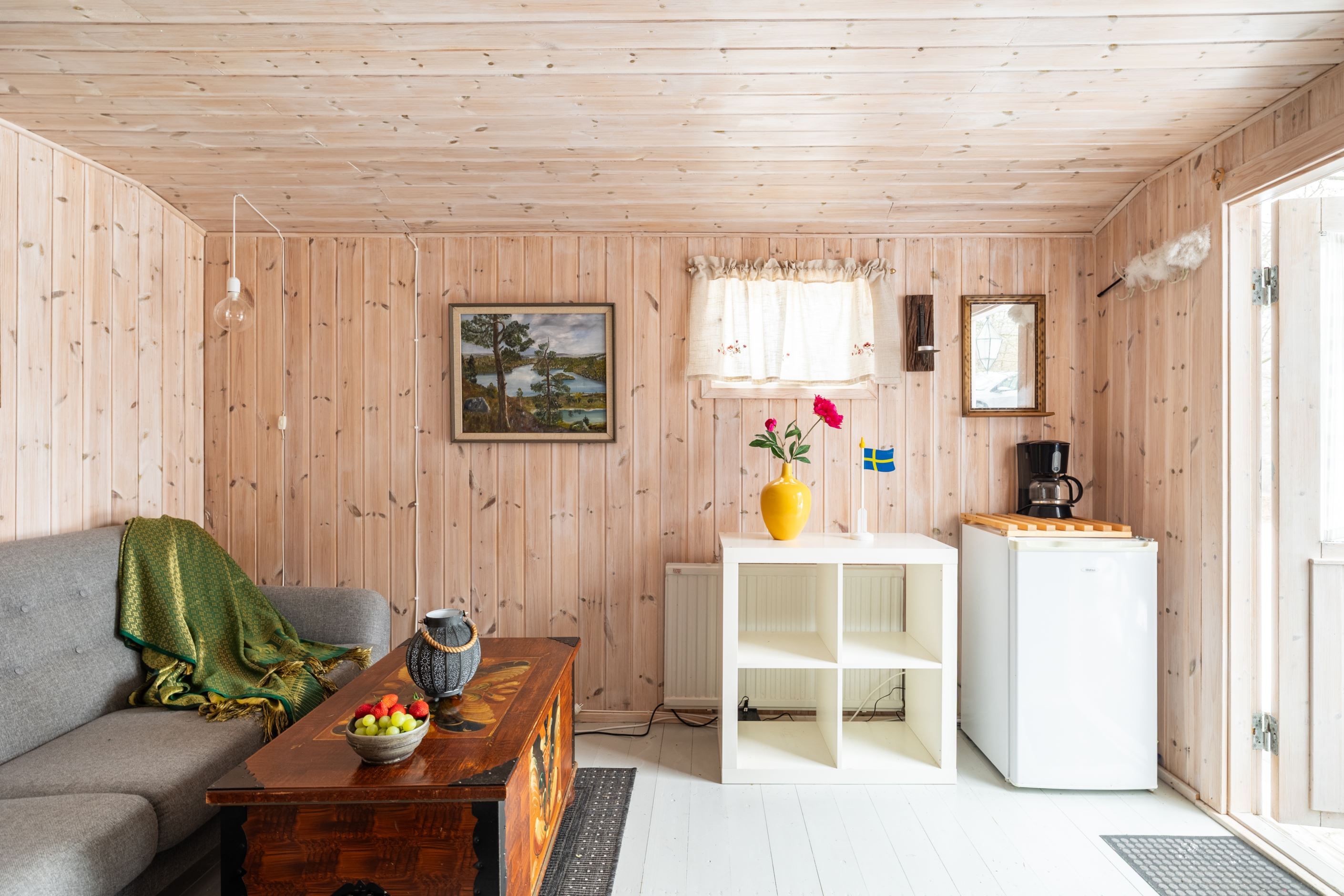 På tomten finns även en mysig gäststuga med plats för dubbelsäng och soffgrupp – perfekt för övernattande gäster eller som en avskild plats för lugn och ro.
