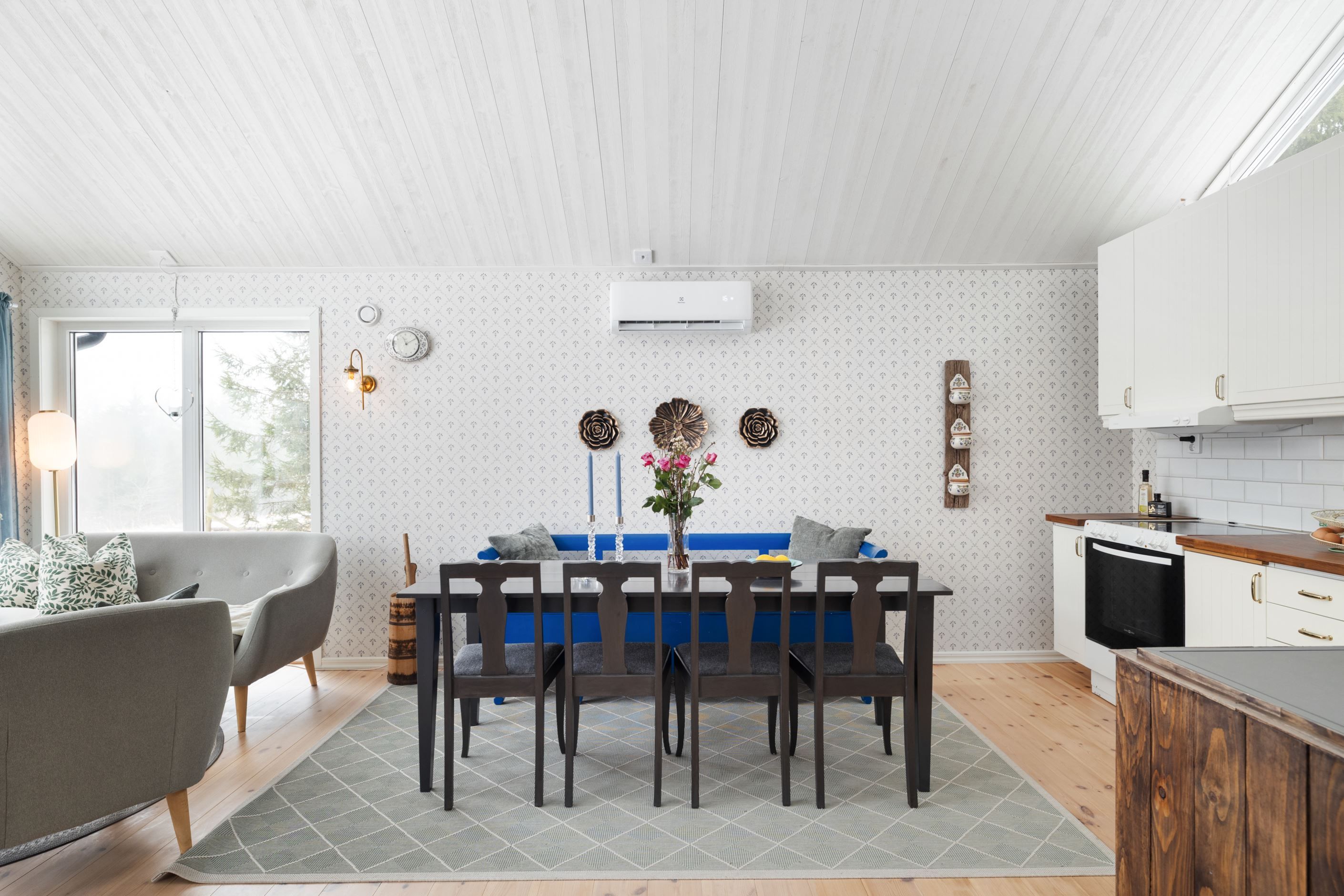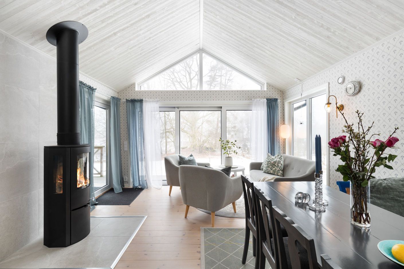Kök med matplats och vardagsrum samspelar i en trivsam planlösning. Från huset nås uteplats och trädgård som erbjuder gott om utrymme för umgänge, odling eller lek.