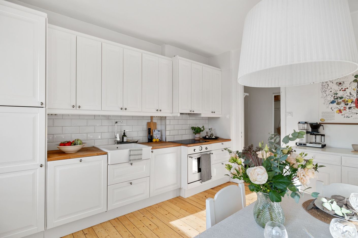 Köket erbjuder gott om arbetsytor och förvaring i en separat kökssektion, vilket gör matlagningen både praktisk och trivsam. Det rymliga vardagsrummet bjuder på plats för både större soffgrupp och matbord, och härifrån når du bostadens balkong där solen kan avnjutas större delen av dagen.