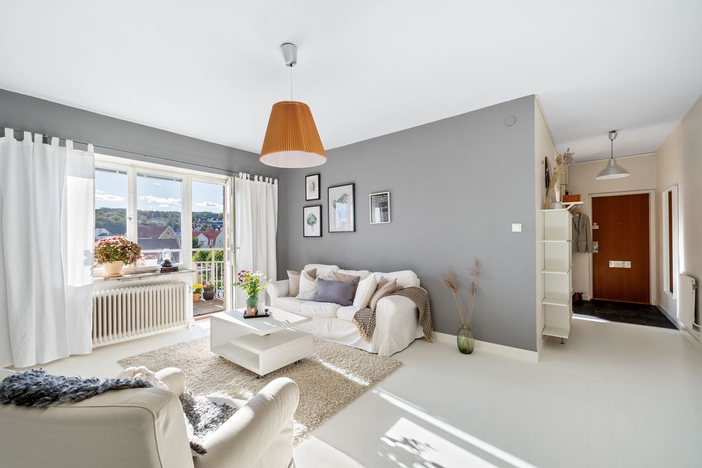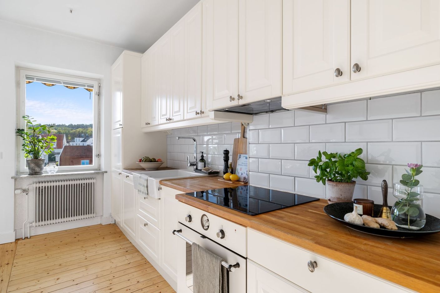 Köket erbjuder gott om arbetsytor och förvaring i en separat kökssektion, vilket gör matlagningen både praktisk och trivsam. Det rymliga vardagsrummet bjuder på plats för både större soffgrupp och matbord, och härifrån når du bostadens balkong där solen kan avnjutas större delen av dagen.