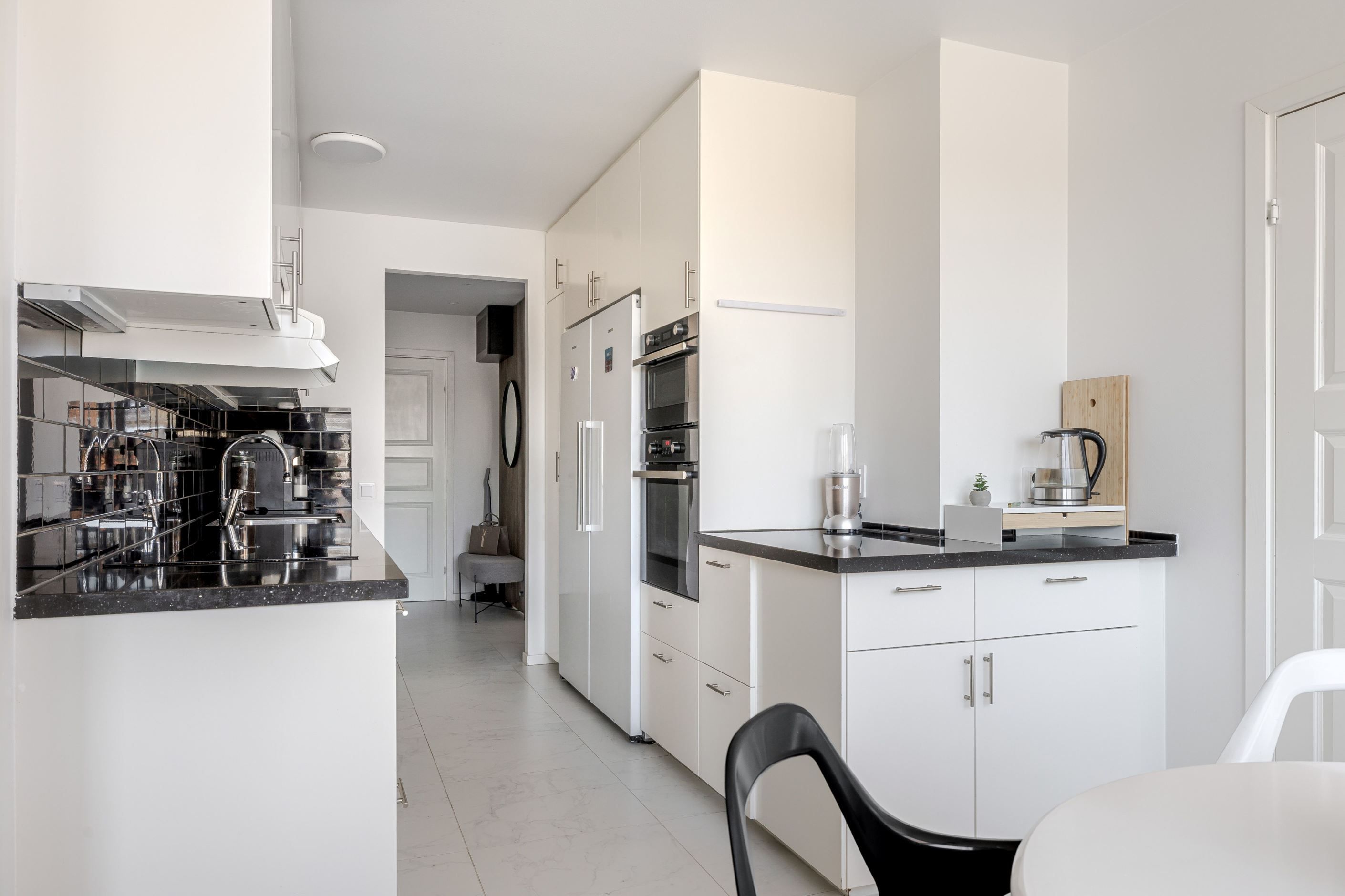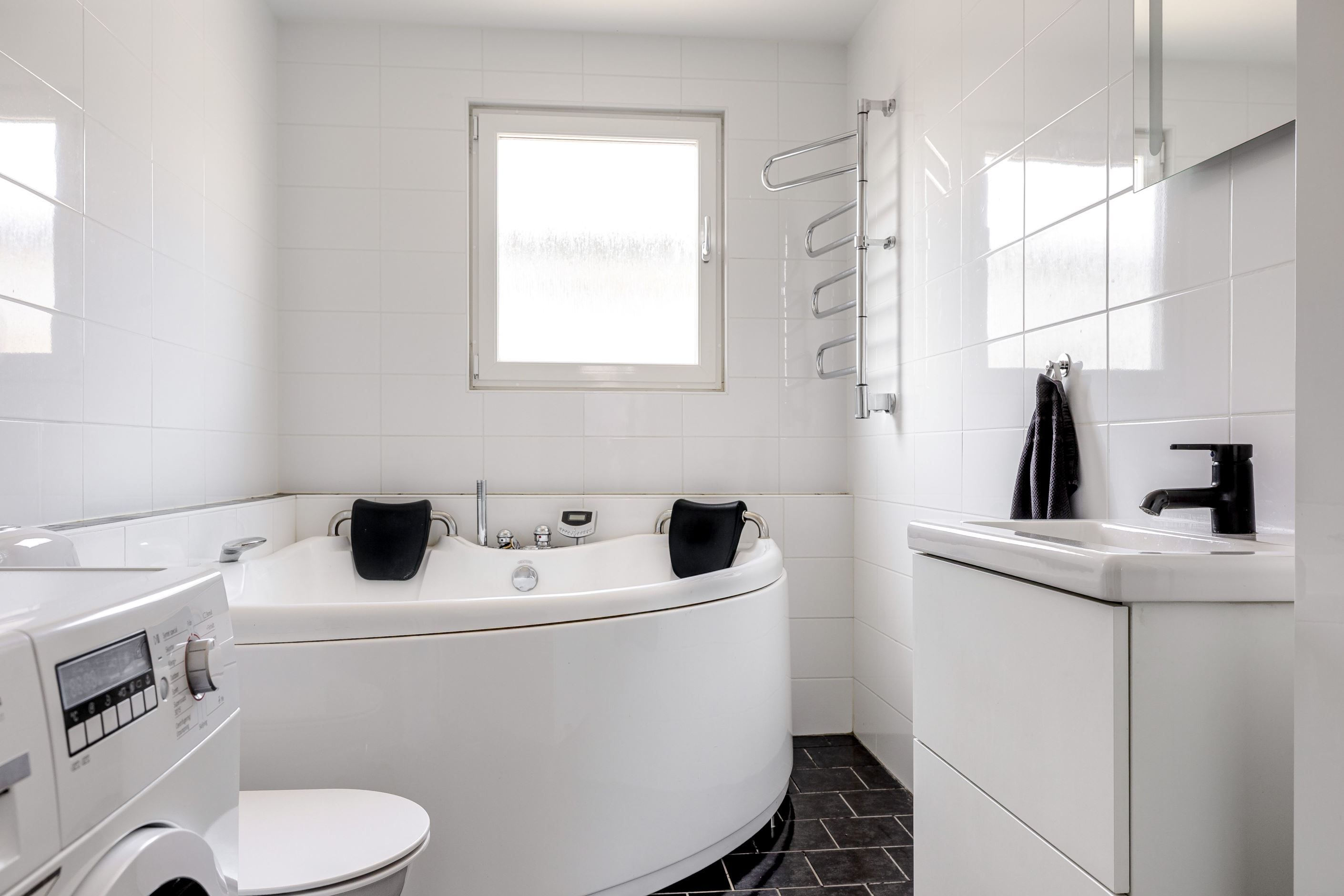 Bostaden har ett rymligt och inbjudande kök med gott om arbetsytor och bra förvaring. Vid det stora fönstret finns en naturlig plats för matbordet som skapar en trevlig matplats med fint ljusinsläpp. Badrummet är stilrent helkaklat och utrustat med tvättmaskin och bubbelbadkar. Utöver detta finns även en separat helkaklad gästtoalett som renoverades stilfullt under 2022.