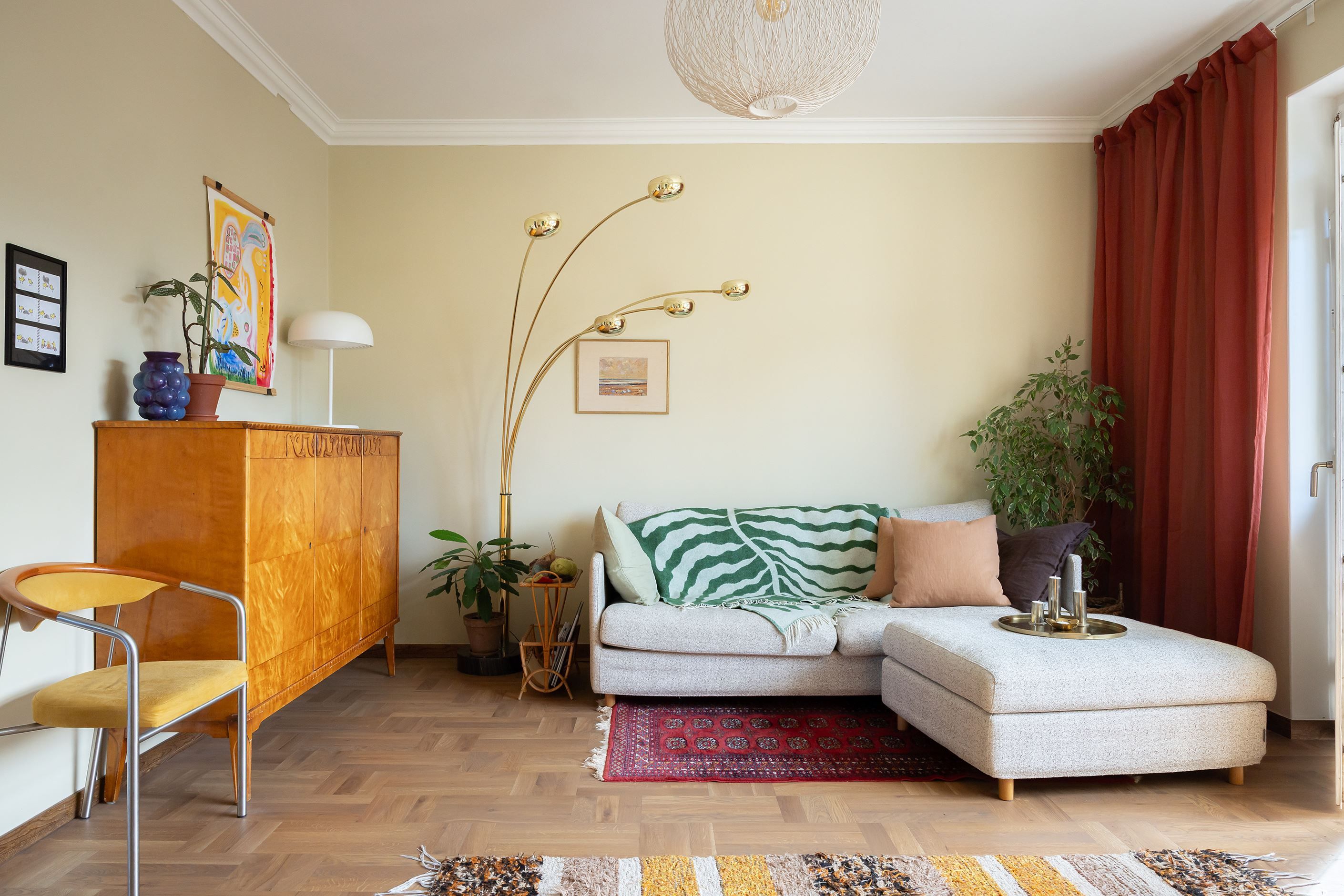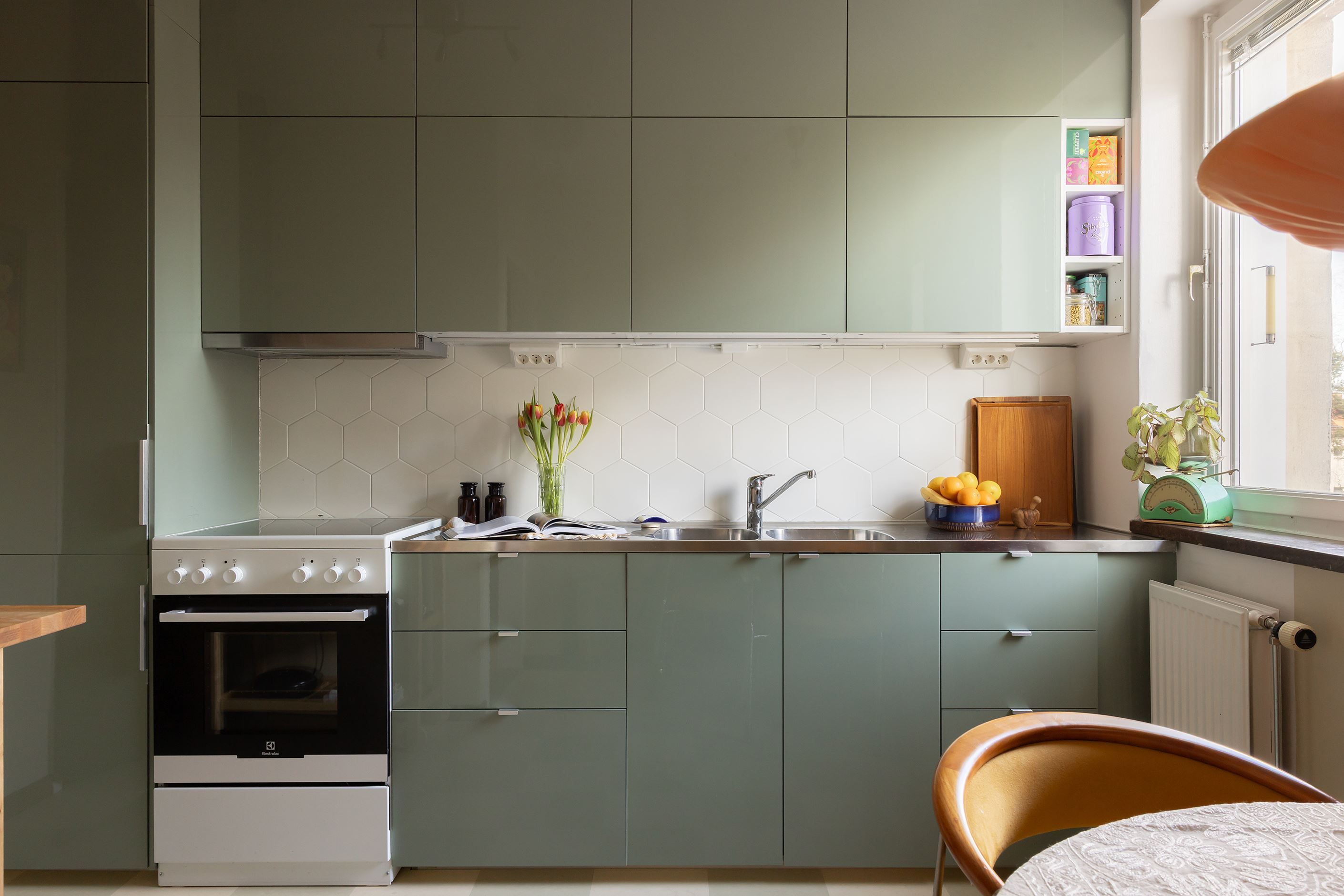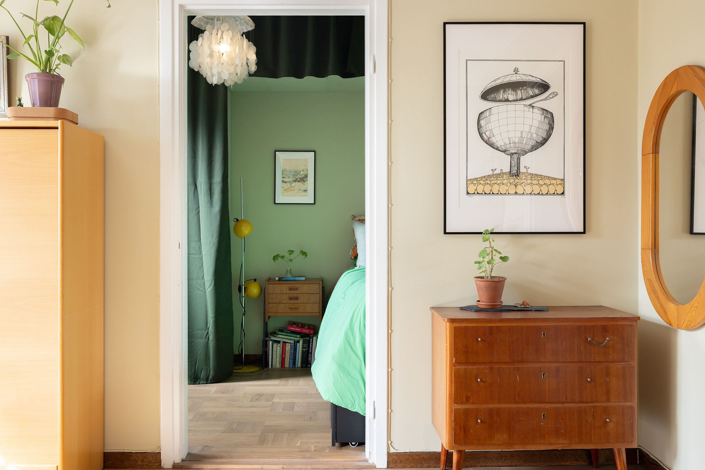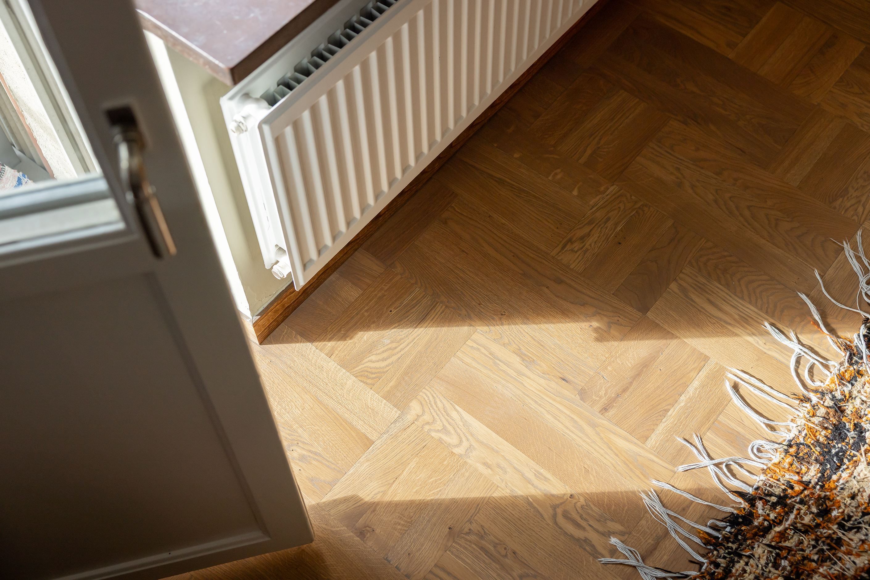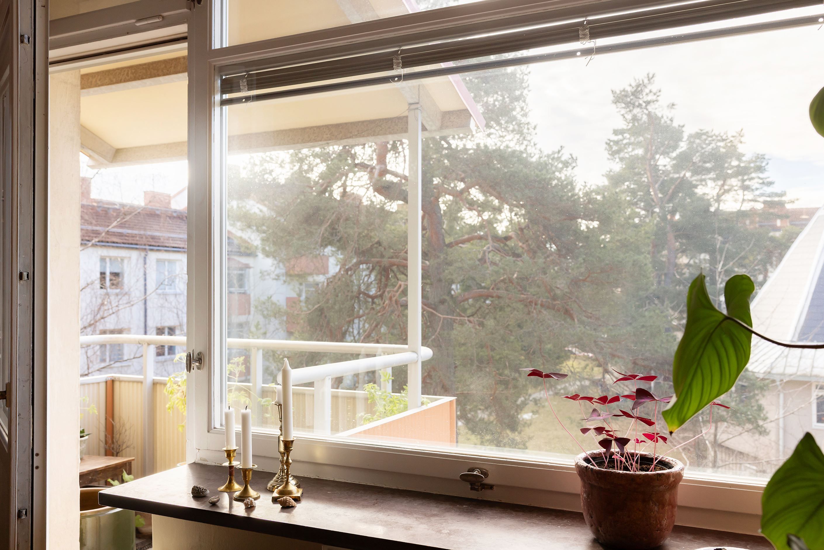 Detaljerna sätter verkligen stämningen här – vacker massiv parkett i hall, vardagsrum och sovrum (inlagd 2025), tidstypiska fönster med charmiga överljus och originalbeslag som skapar karaktär och själ. Från vardagsrummet blickar du ut över talltopparna och får en vy som skänker både rymd och lugn.