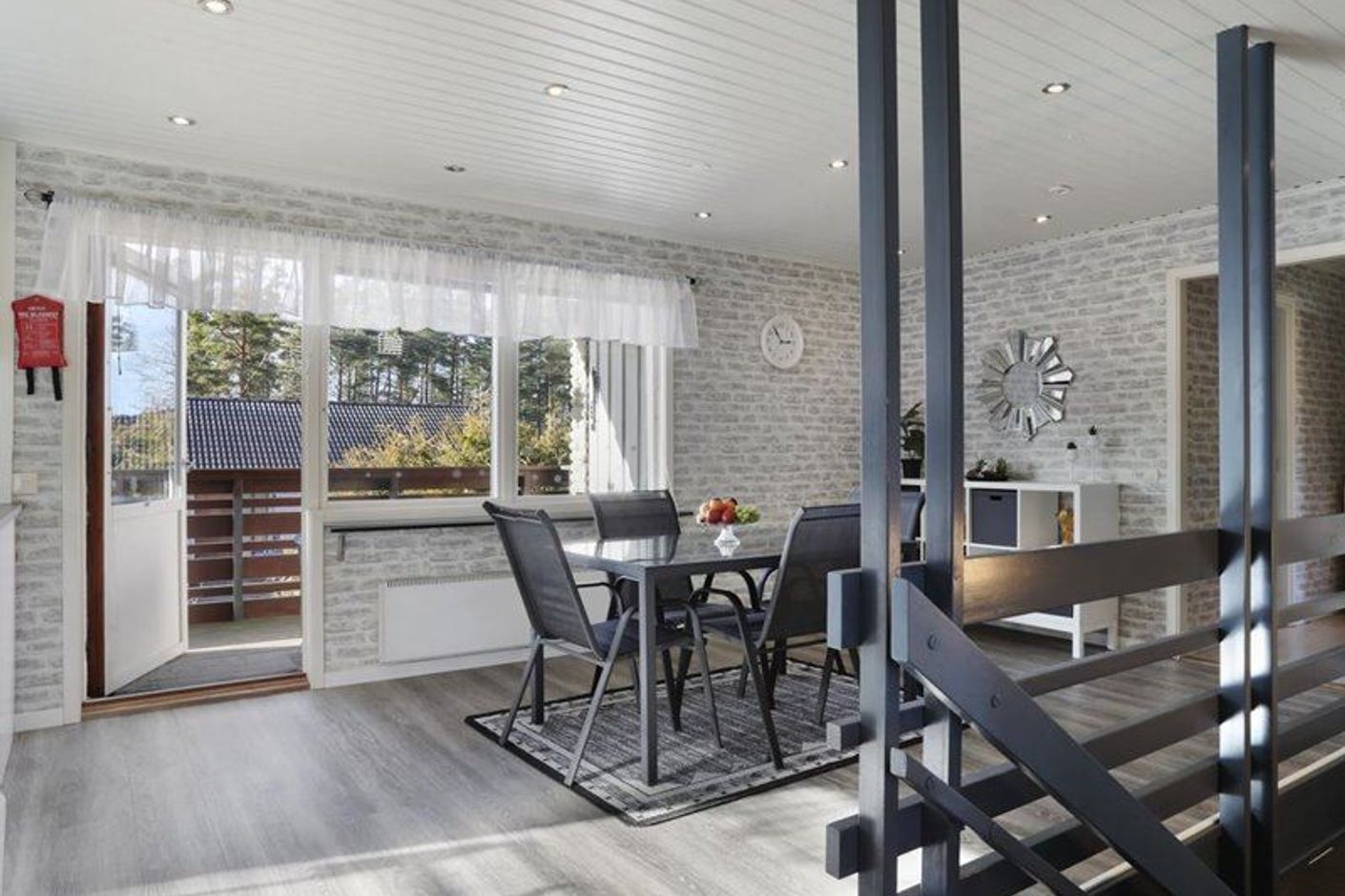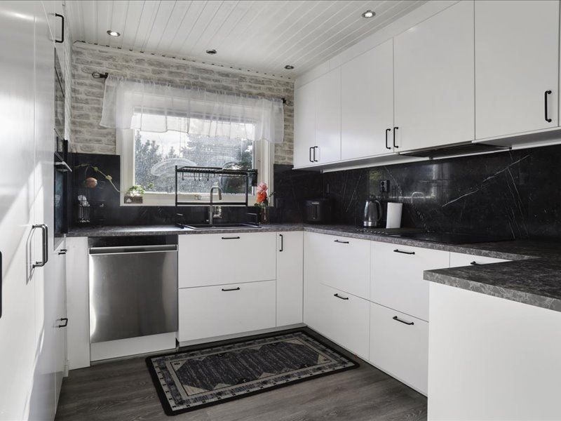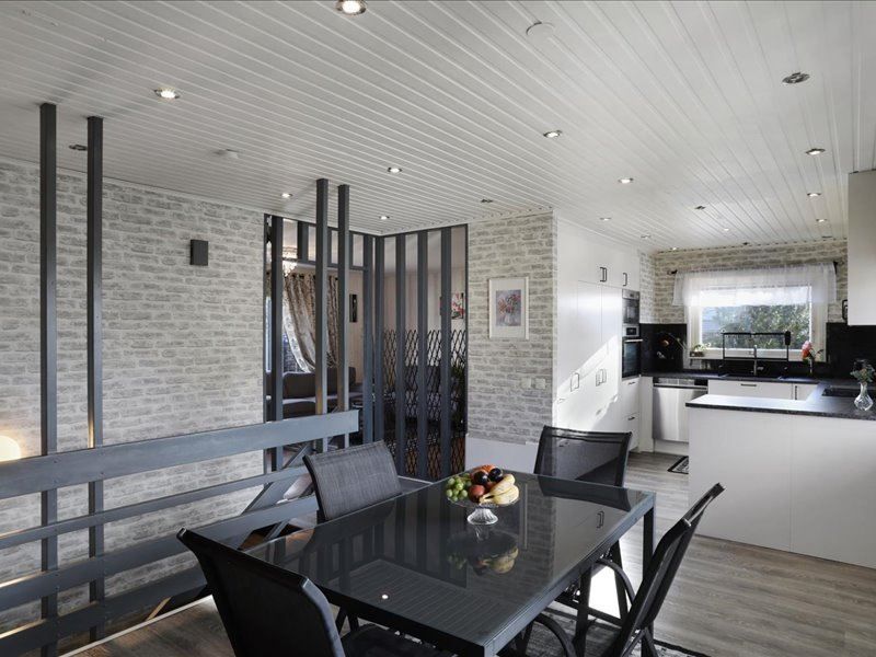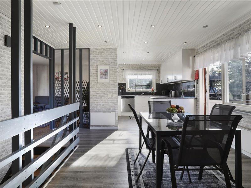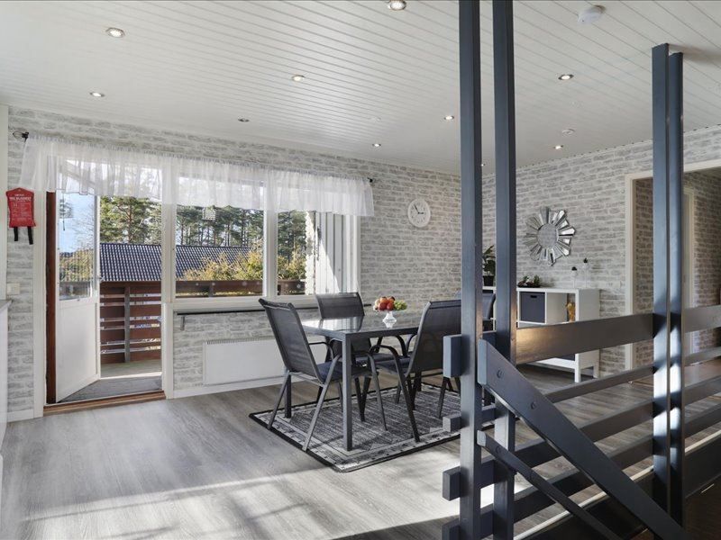 Huset bjuder på stora sociala ytor där vardagsrum och matplats naturligt samspelar och skapar en perfekt plats för både vardagsliv och festliga tillfällen. De generösa fönstrena släpper in rikligt med ljus och ger en härlig rymd i hemmet. Köket är välplanerat med goda arbetsytor och plats för hela familjen att samlas kring middagsbordet.