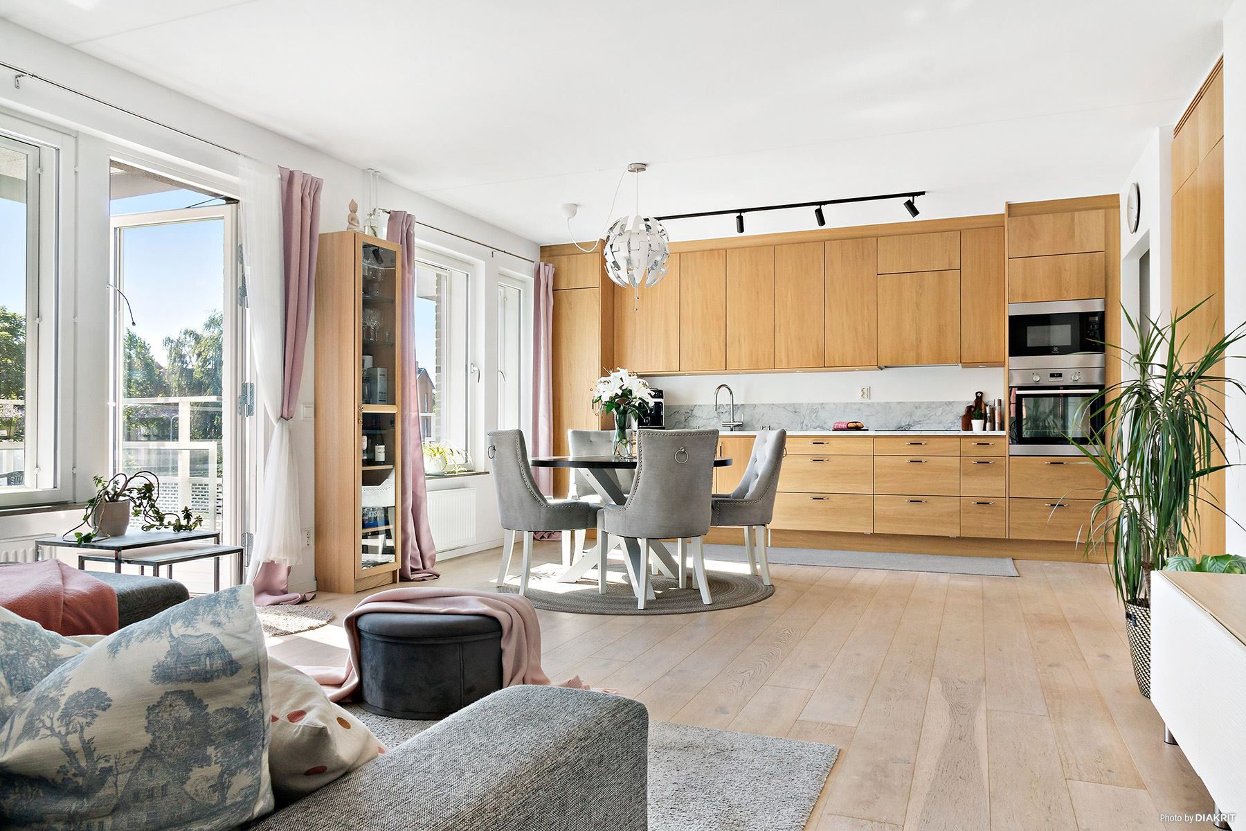 Öppen planlösning mellan kök, matplats och vardagsrum