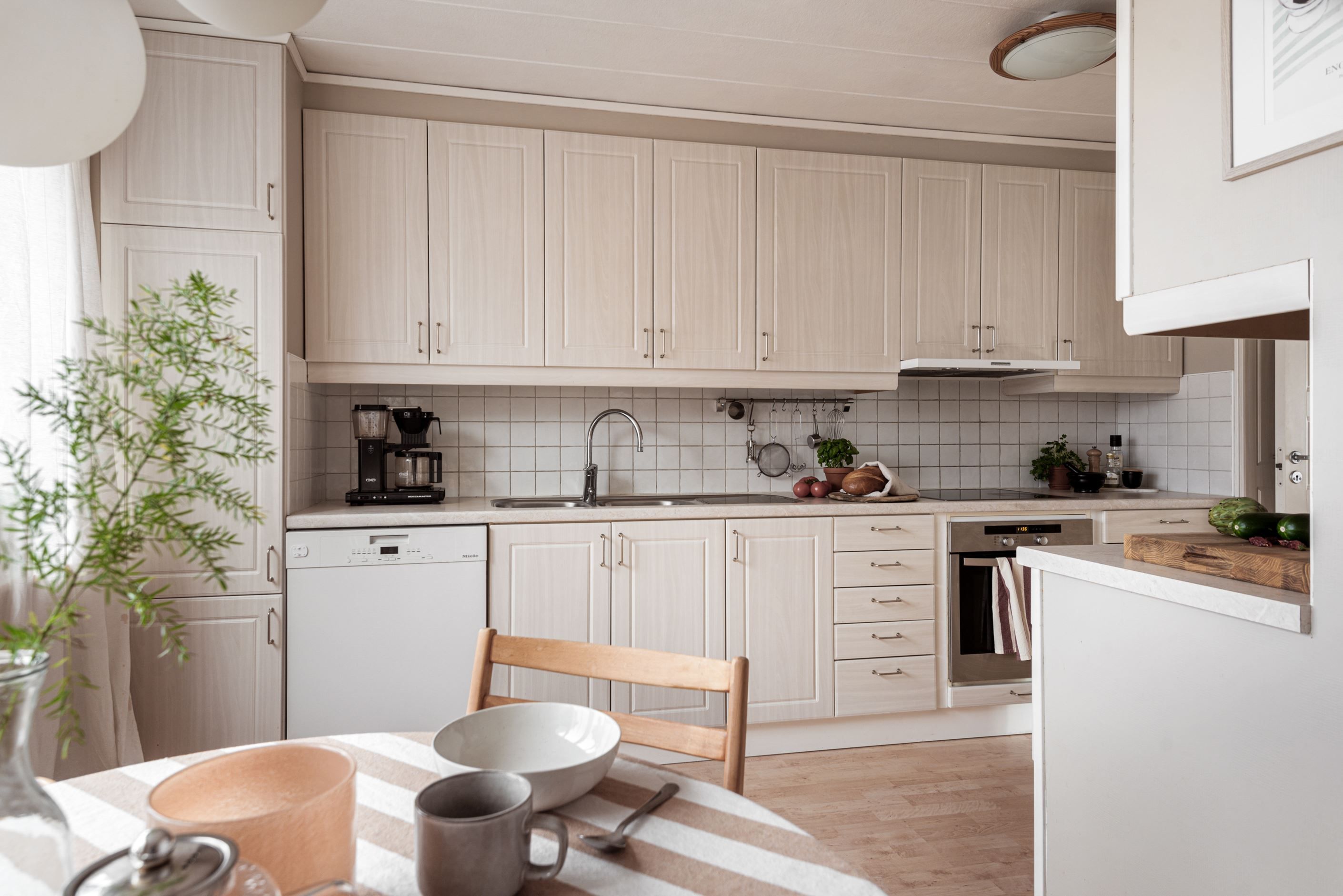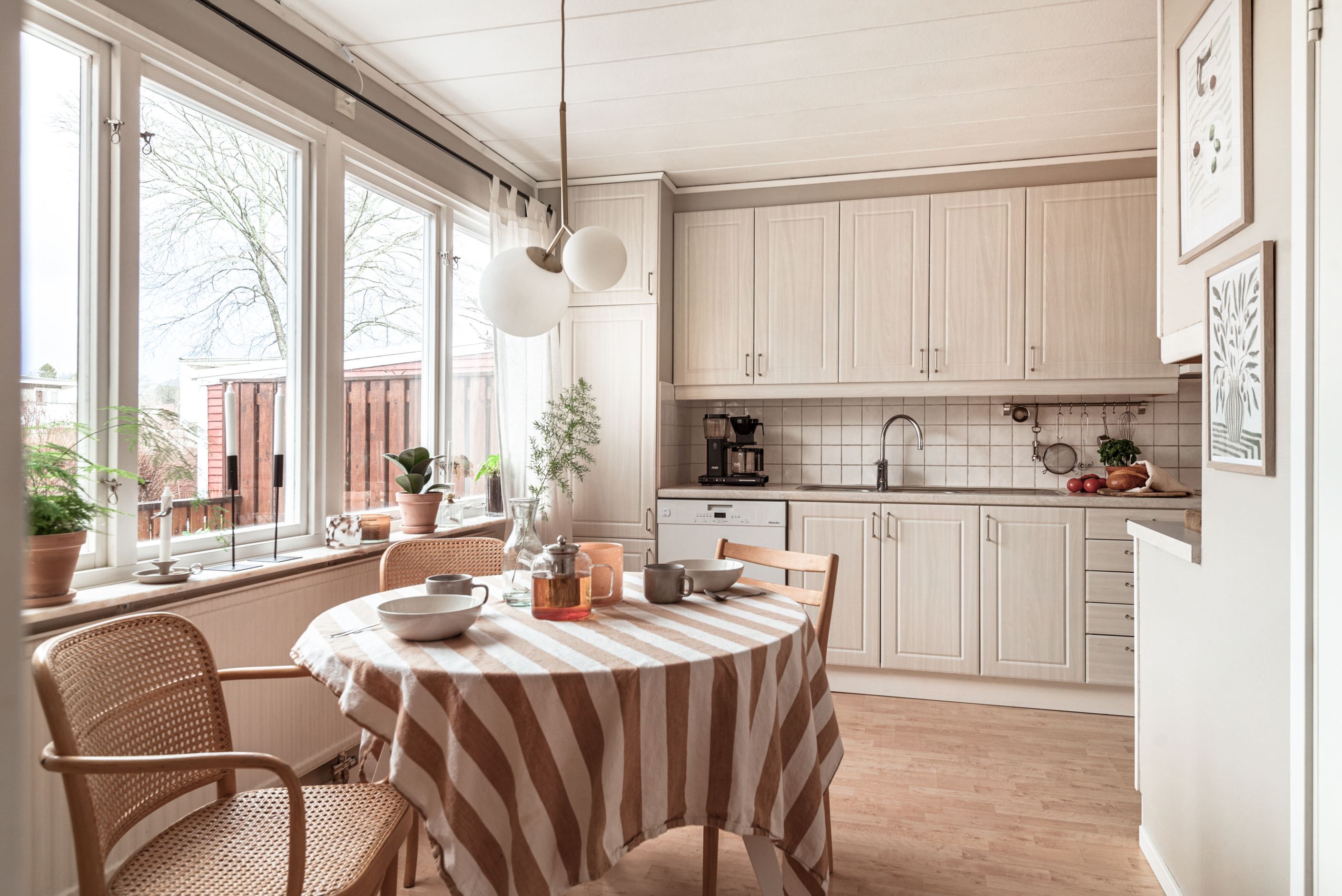 Hemmet är välplanerat i två våningsplan med hela fyra sovrum på det övre våningsplanet som enkelt kan göras till tre för den lite mindre familjen. På det övre våningsplanet finns också ett badrum med plastmatta samt utgång till balkongen från två av sovrummen. Här finns dessutom bra med förvaring i en klädkammare och en stor garderobsvägg med mycket förvaring. Entréplanet disponeras i en välkomnande entréhall med en anslutande wc med klinkergolv. Det praktiska vinkelköket erbjuder också en rymlig matplats som ansluter till en tvättstuga med tvättmaskin och torktumlare från Miele.