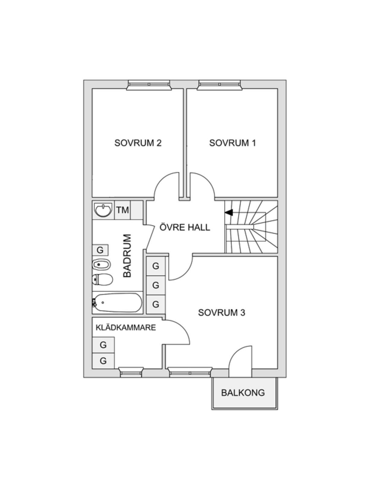 På övervåningen är de tre sovrummen placerade, varav det ena med access till en stor klädkammare. På båda våningarna finns badrum varav det på övervåningen är med kombinerad tvättstuga.