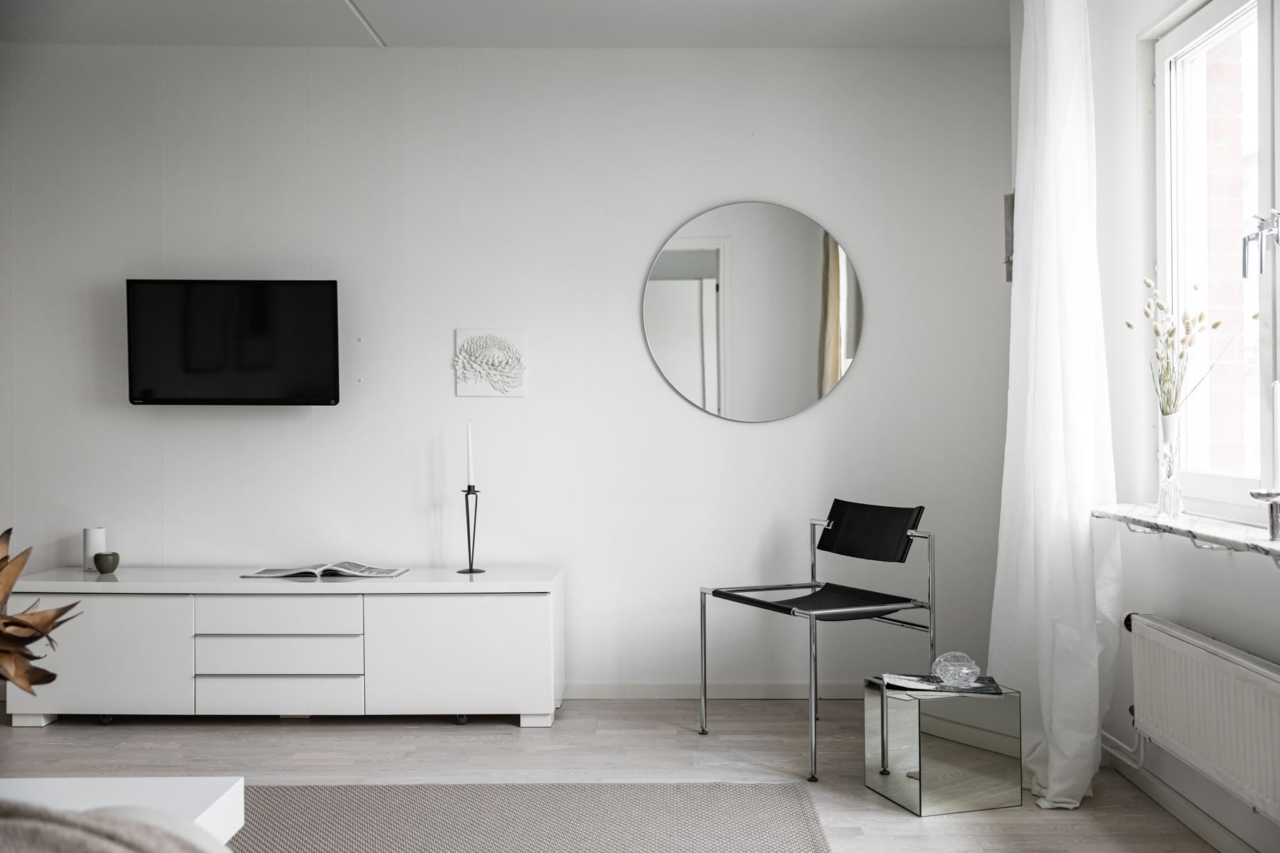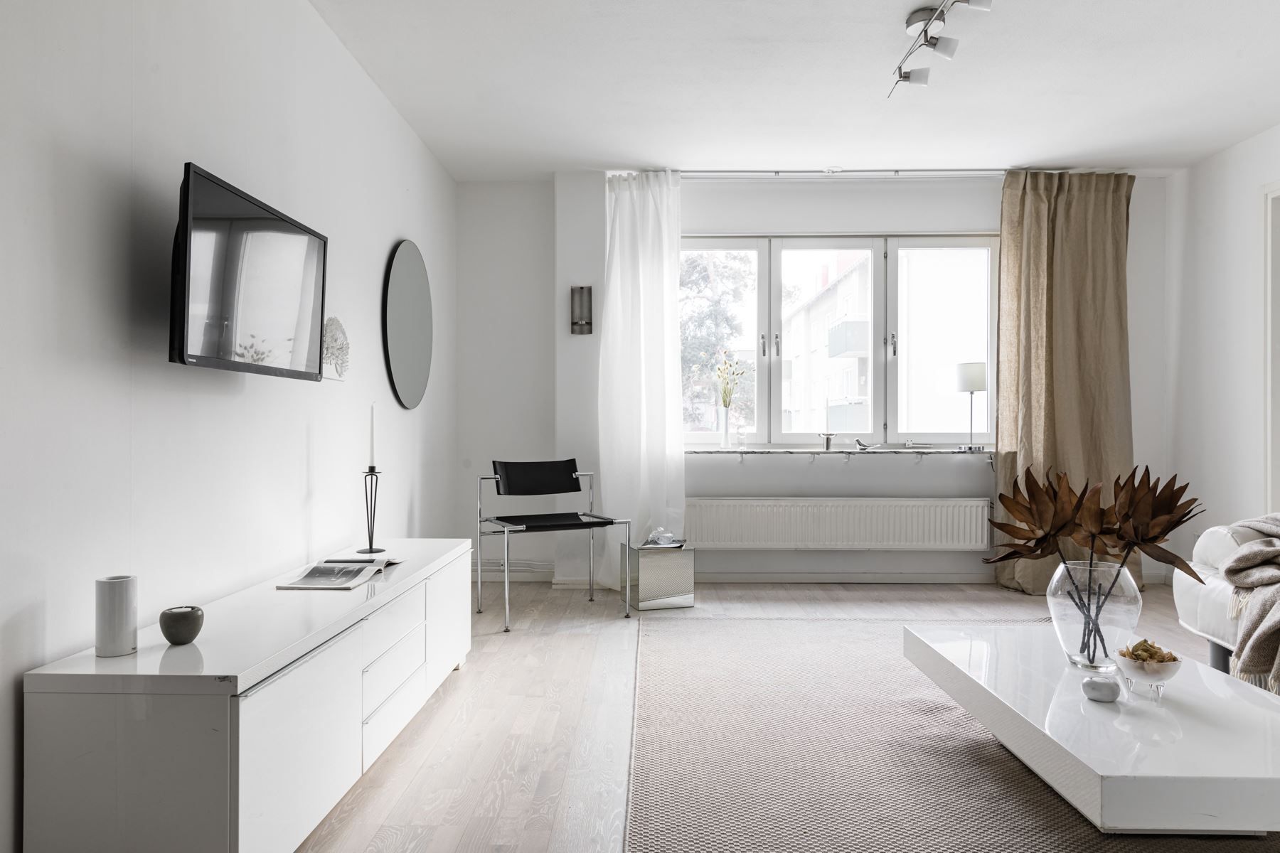Vardagsrummet upplevs ombonat och inbjudande med stora fönsterpartier som ger ett fint och naturligt ljusinsläpp.