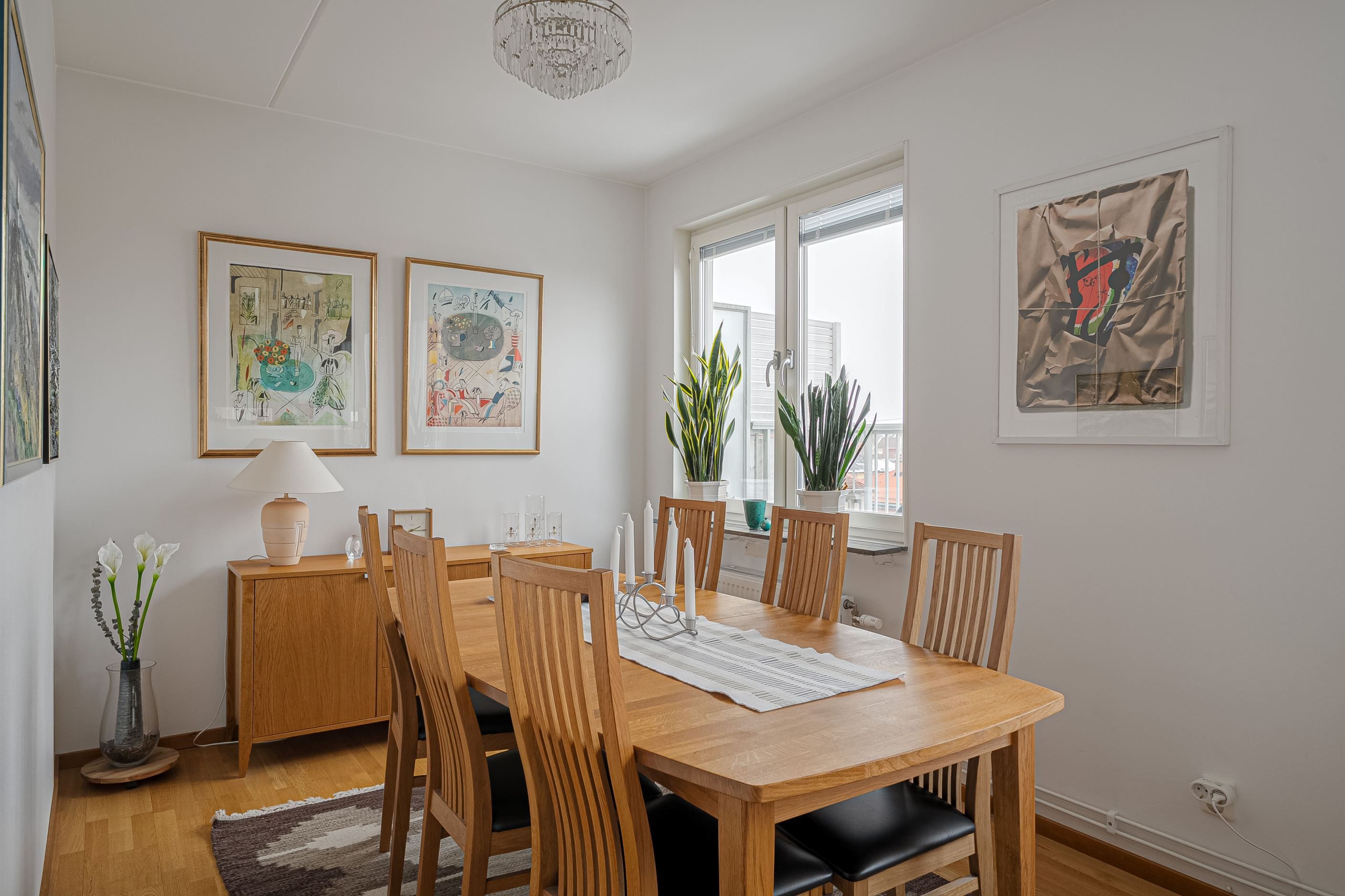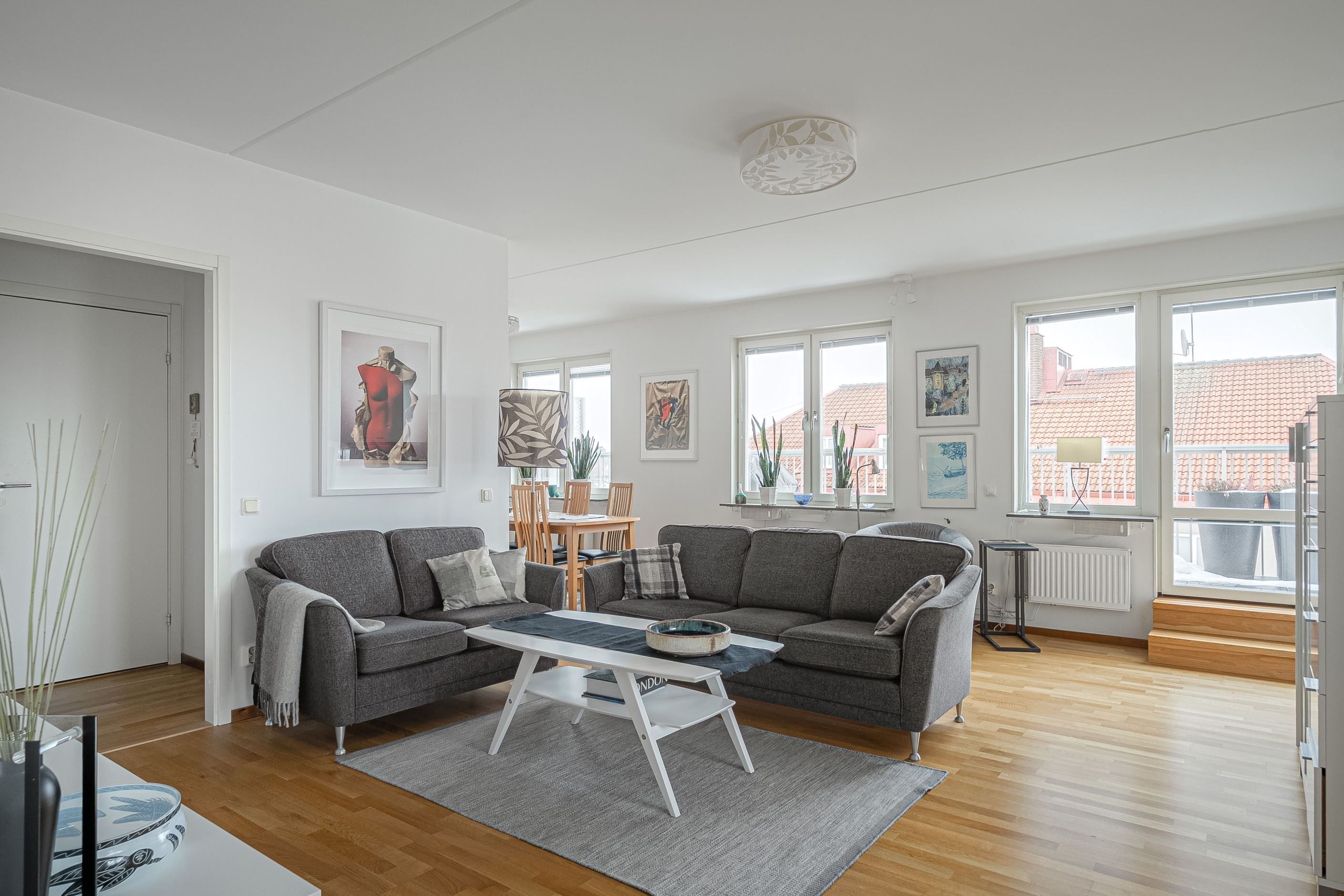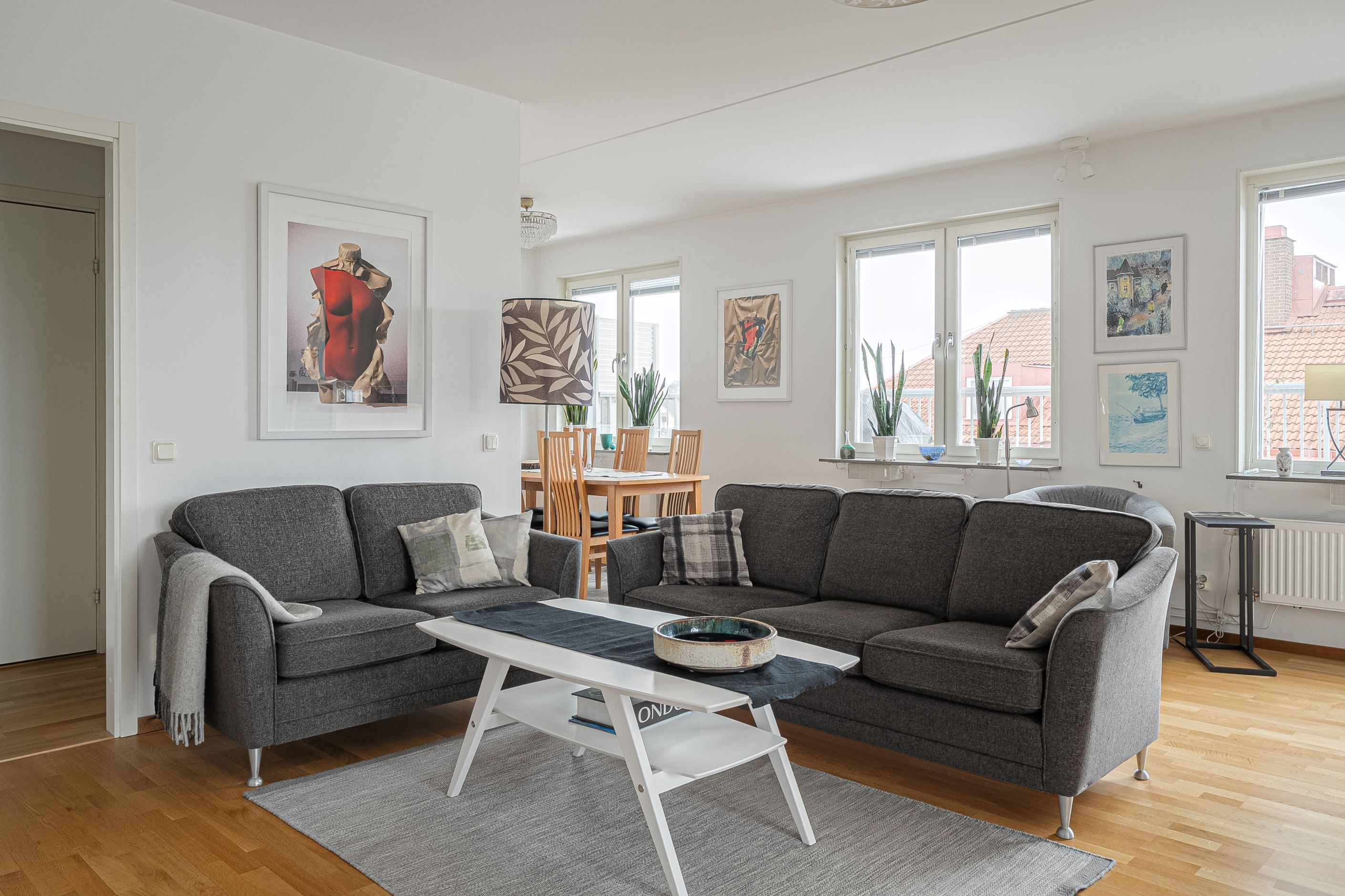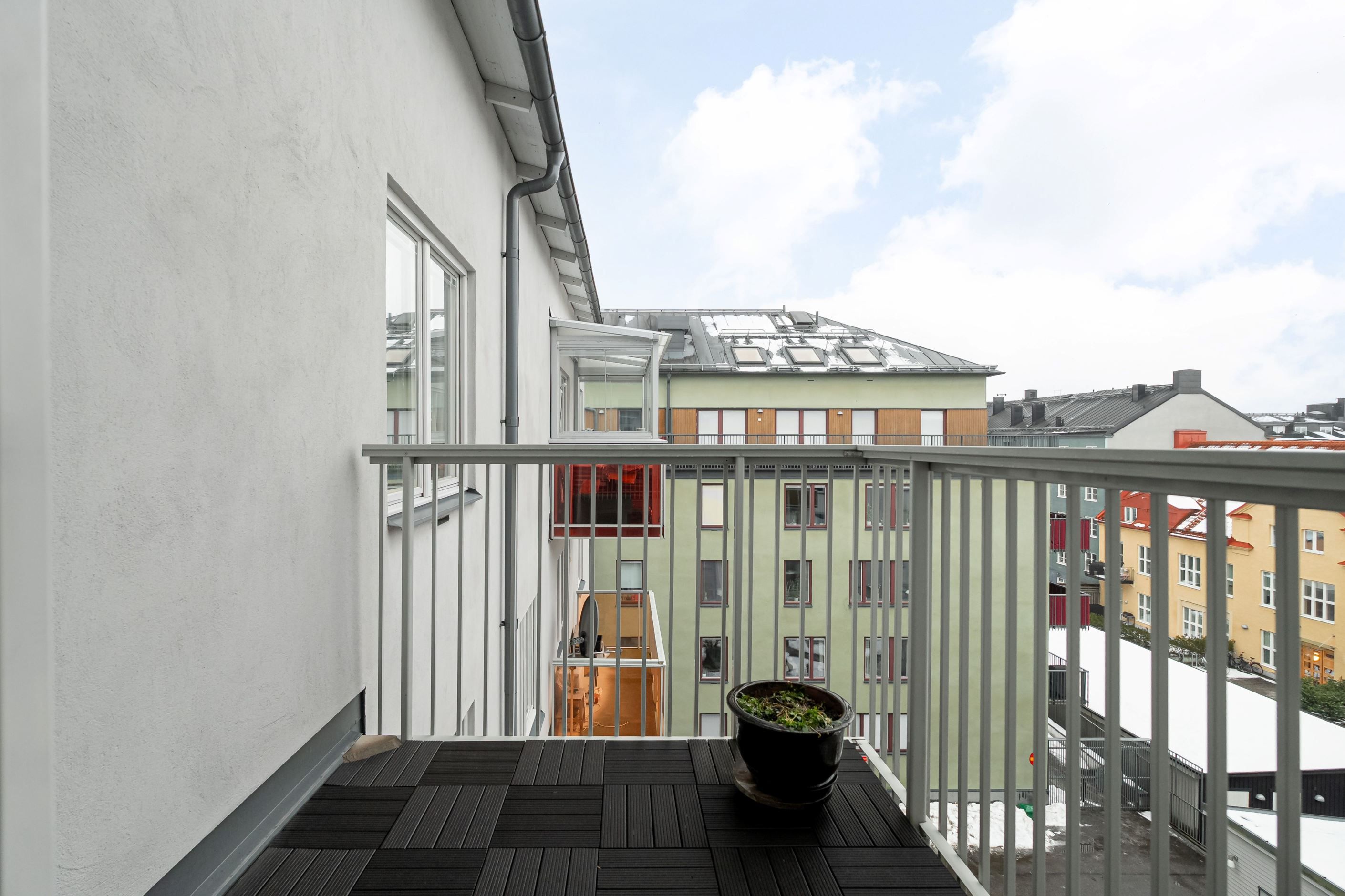 98 kvm boarea där du möts av ett fantastiskt ljusflöde genom hela bostaden som kan stoltsera med hela fyra väderstreck. För dig som är en soldyrkare eller älskar att grilla eller odla, så har du en fantastisk takterrass om 46 kvm. Som om det är inte är nog finns även en balkong om 3 kvm mot rogivande innergård och gör att du kan följa solen från upp- till nedgång. Social och öppen planlösning samt tre sovrum som kan bli fyra vid behov. Här kan du njuta av sociala tillställningar i glada vänners lag i en exklusiv och privat känsla högst upp i huset. Badrummet är fräscht och väldigt stort, utrustat med dusch, wc, tvättmaskin samt torktumlare. Dessutom finns en extra gäst-wc. Tre sovrum i olika storlekar, där ena är rejält om ca 11 kvm med både en klädkammare och balkong i anslutning. Du kan vid behov göra ett fjärde sovrum. Genomgående fina ytskikt och väl bevarad.