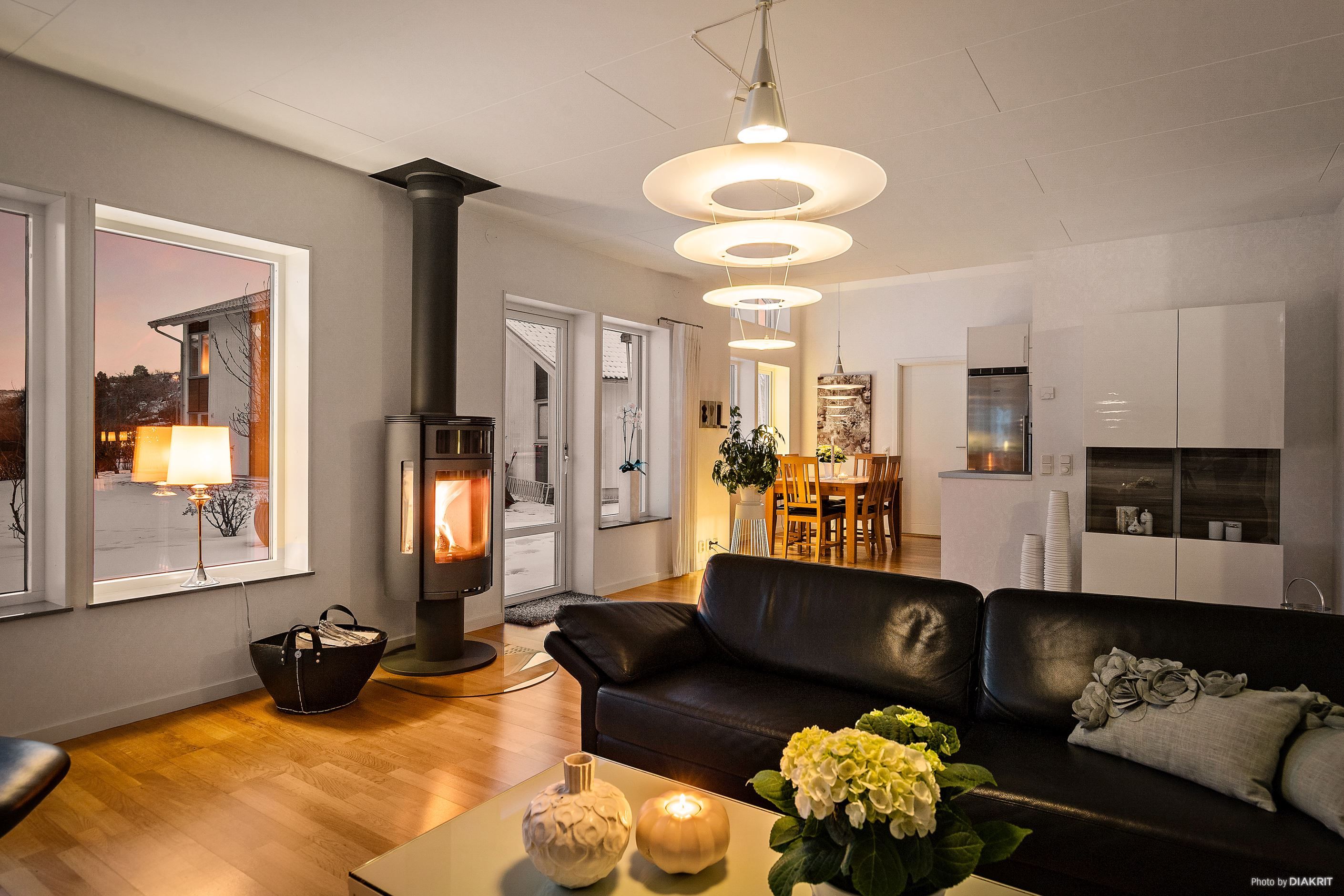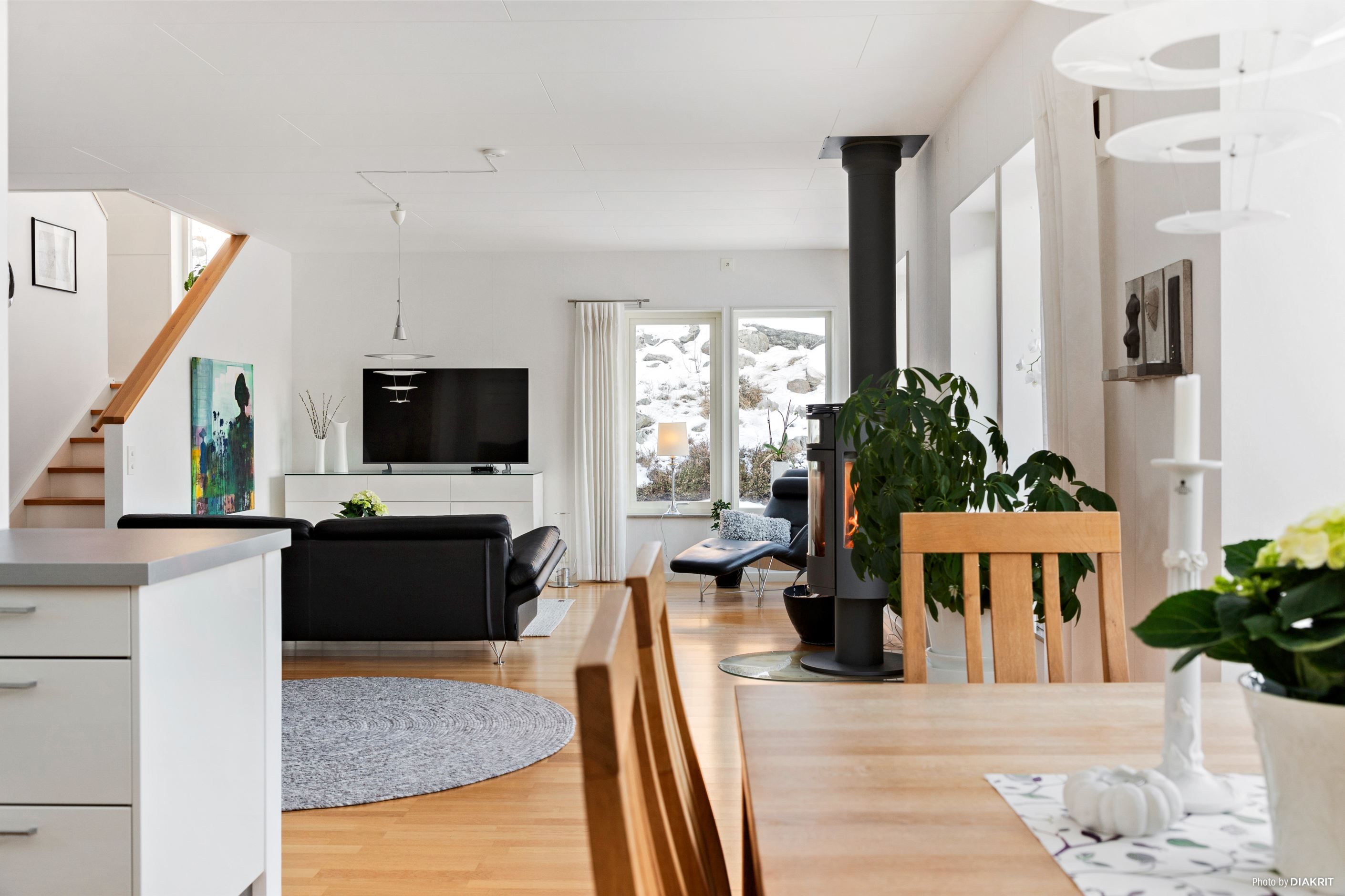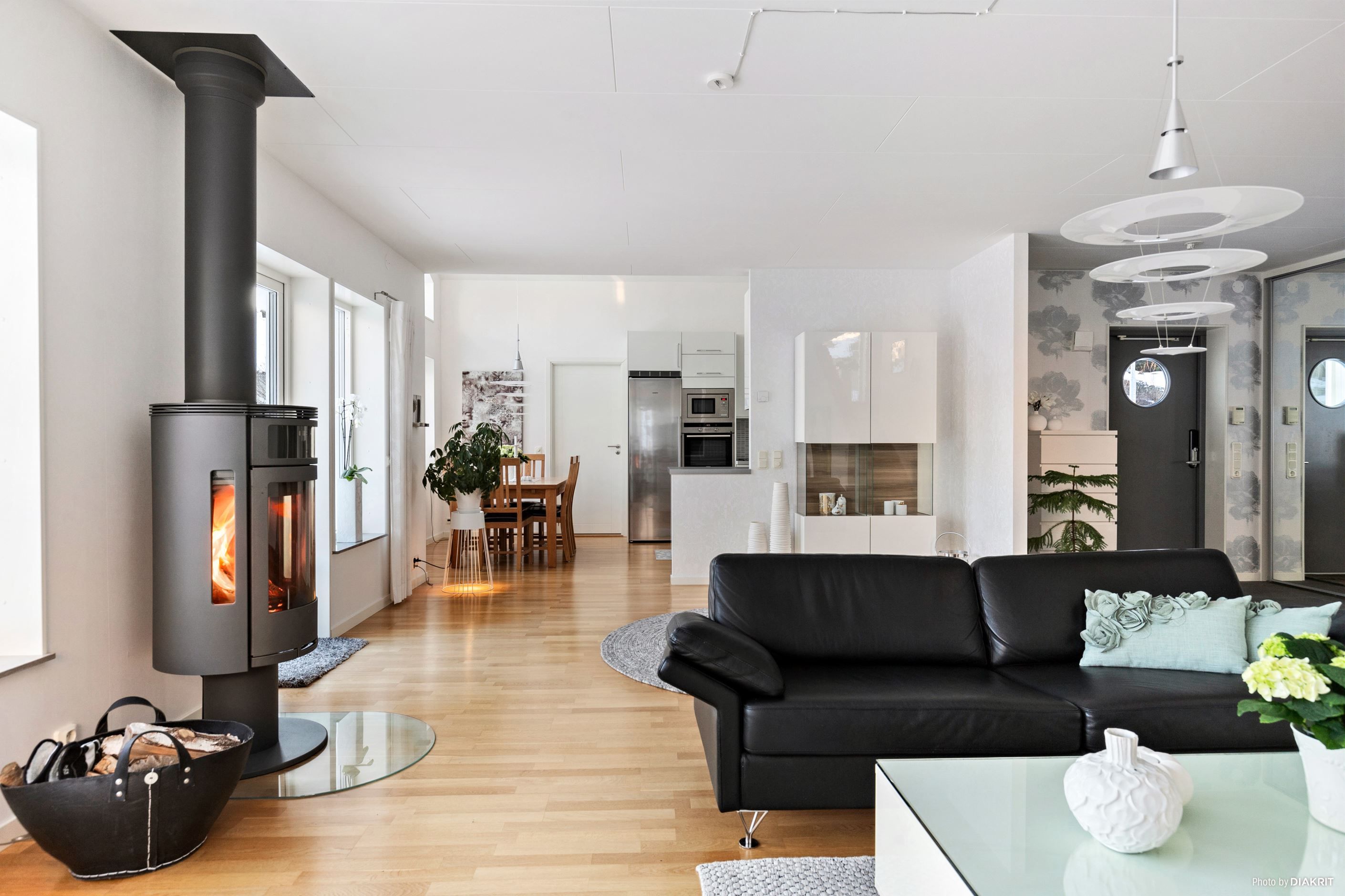 Bostaden om 160 kvm är fördelad över två plan med genomgående ekparkett och stora fönsterpartier som skapar ett härligt ljusinsläpp. Entréplanet erbjuder en öppen och social planlösning mellan kök och vardagsrum med generösa ytor för både större middagsbord och soffgrupp. Braskaminen blir en naturlig samlingspunkt och bidrar med både värme och atmosfär året runt. Härifrån nås även den privata uteplatsen och trädgården i skyddat läge.