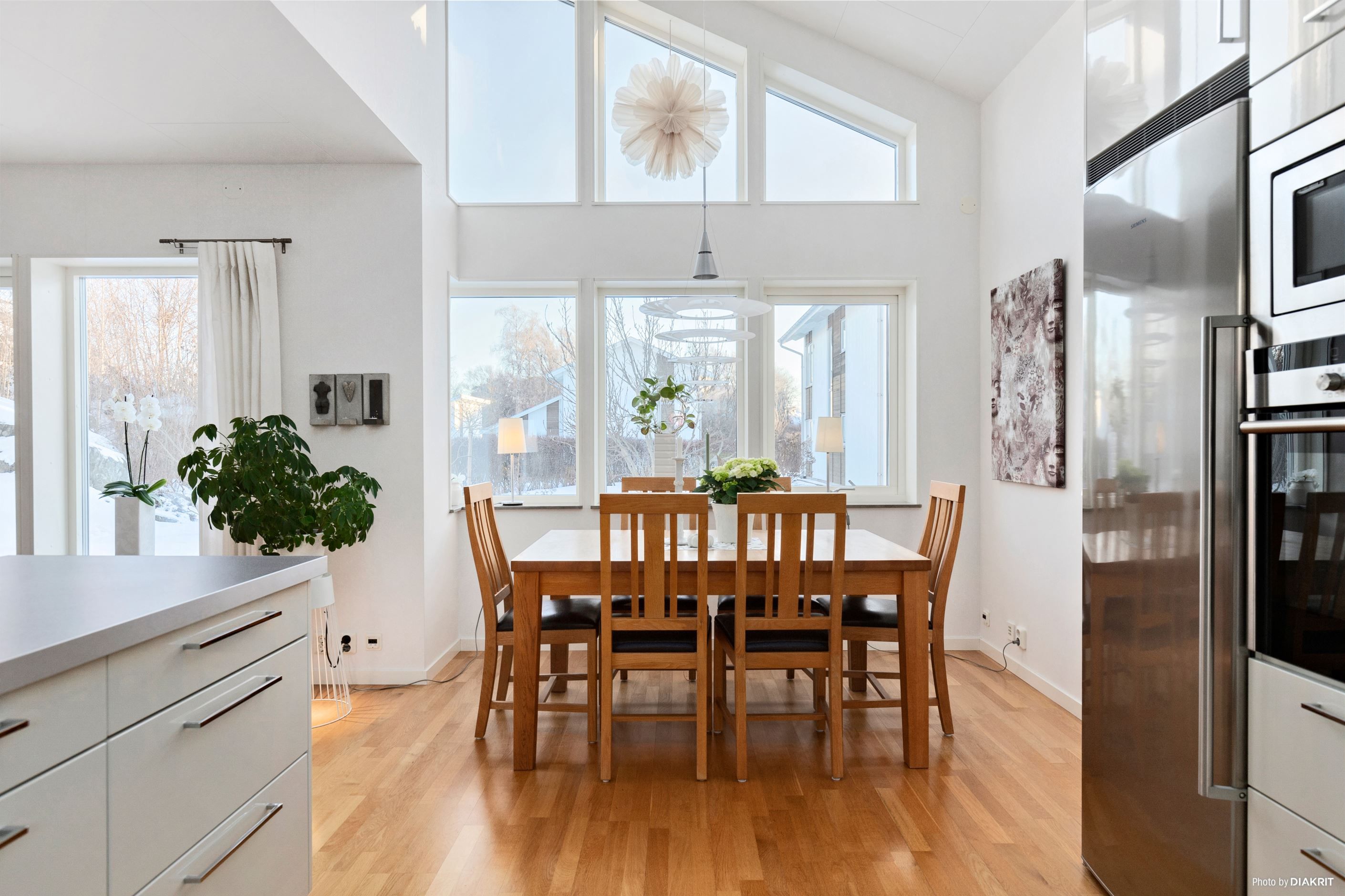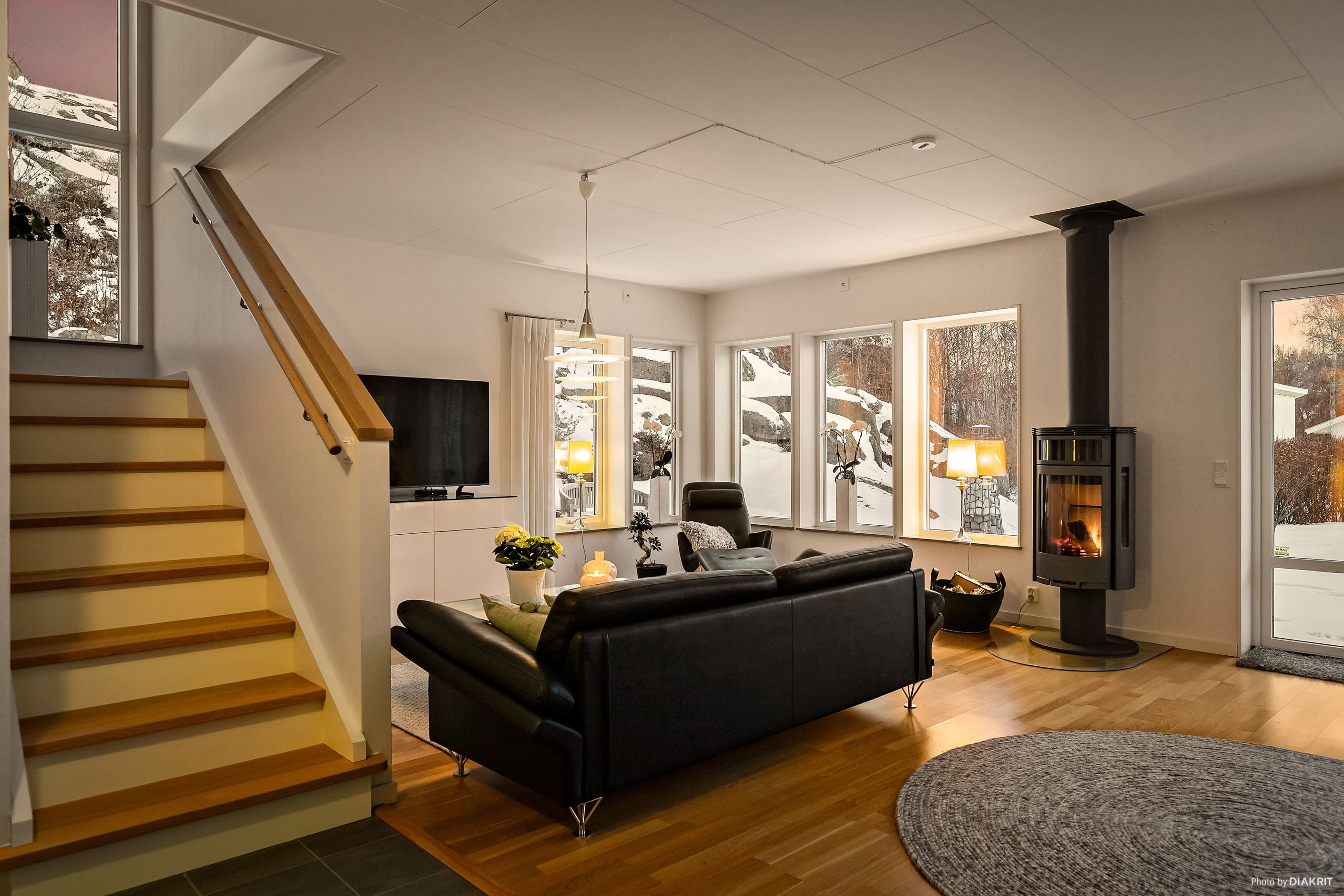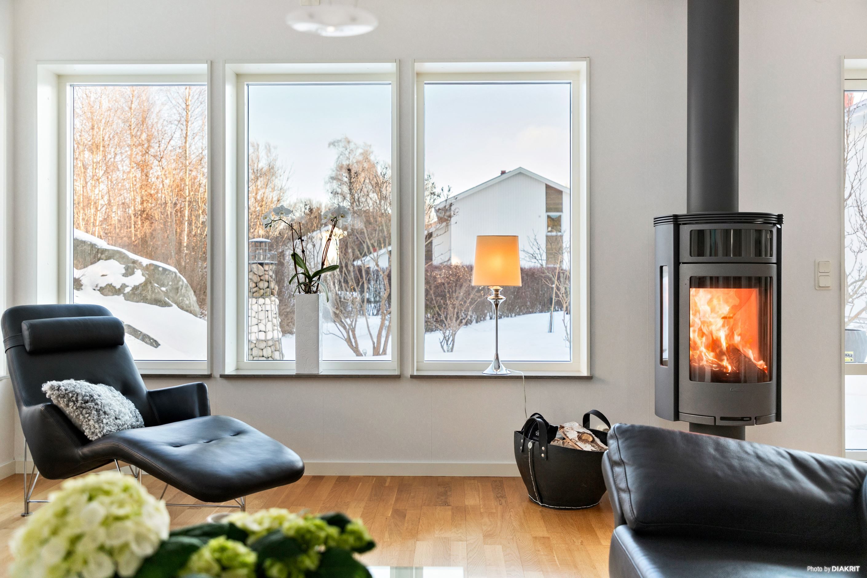 Bostaden om 160 kvm är fördelad över två plan med genomgående ekparkett och stora fönsterpartier som skapar ett härligt ljusinsläpp. Entréplanet erbjuder en öppen och social planlösning mellan kök och vardagsrum med generösa ytor för både större middagsbord och soffgrupp. Braskaminen blir en naturlig samlingspunkt och bidrar med både värme och atmosfär året runt. Härifrån nås även den privata uteplatsen och trädgården i skyddat läge.