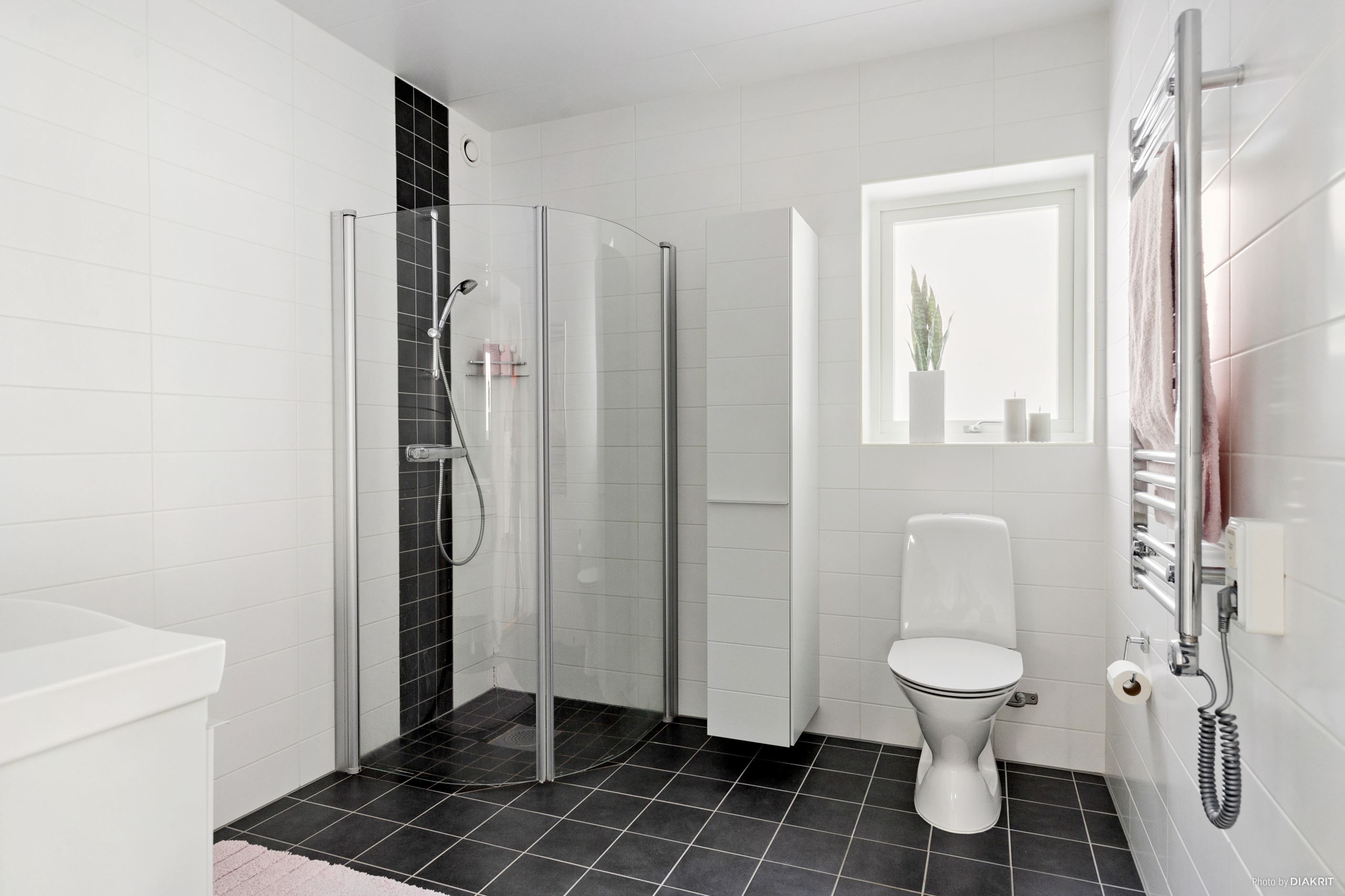 På övre plan finns två rymliga sovrum samt möjlighet att enkelt skapa ytterligare ett. Två helkaklade badrum – ett på varje våning – ger komfort i vardagen.