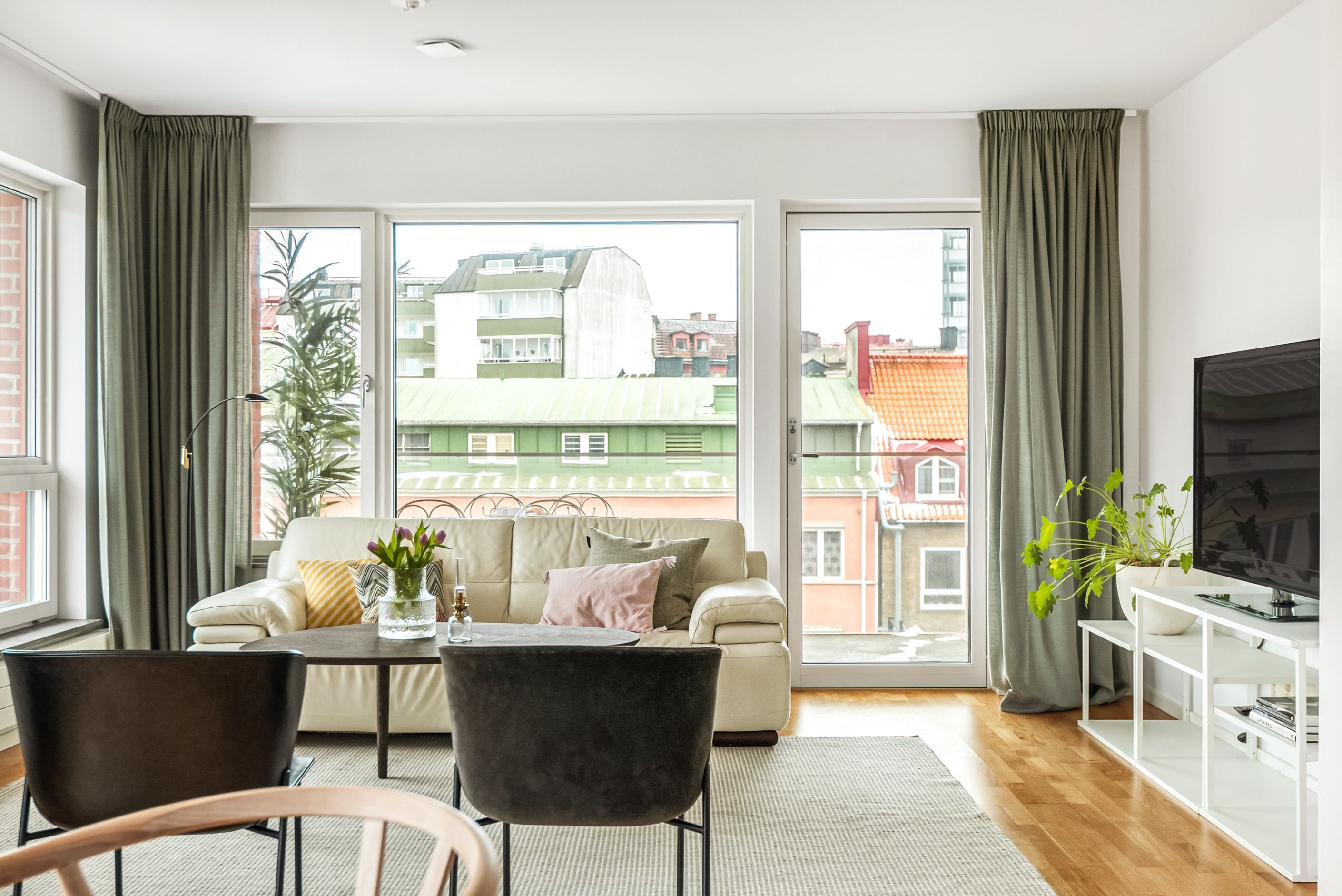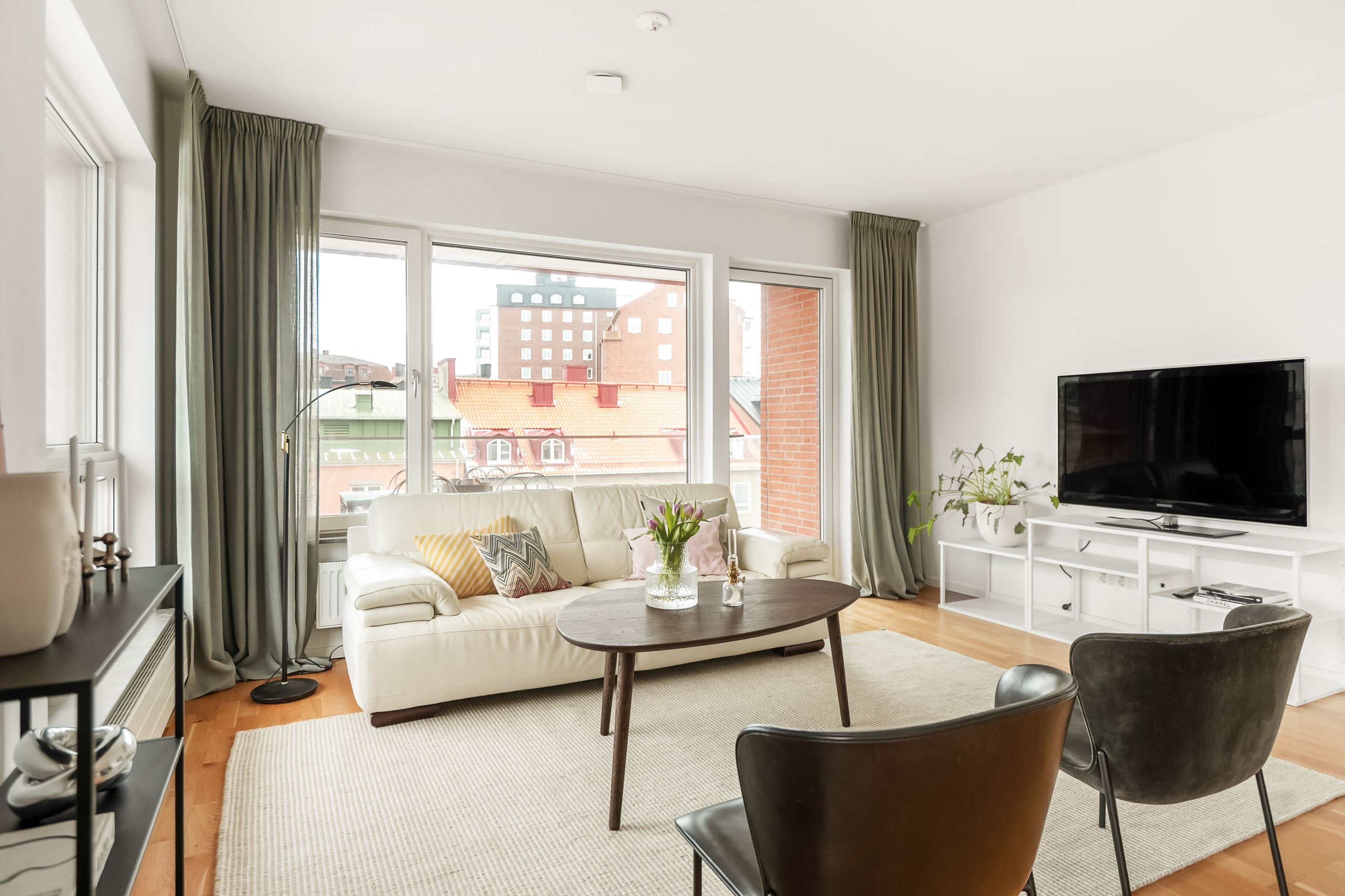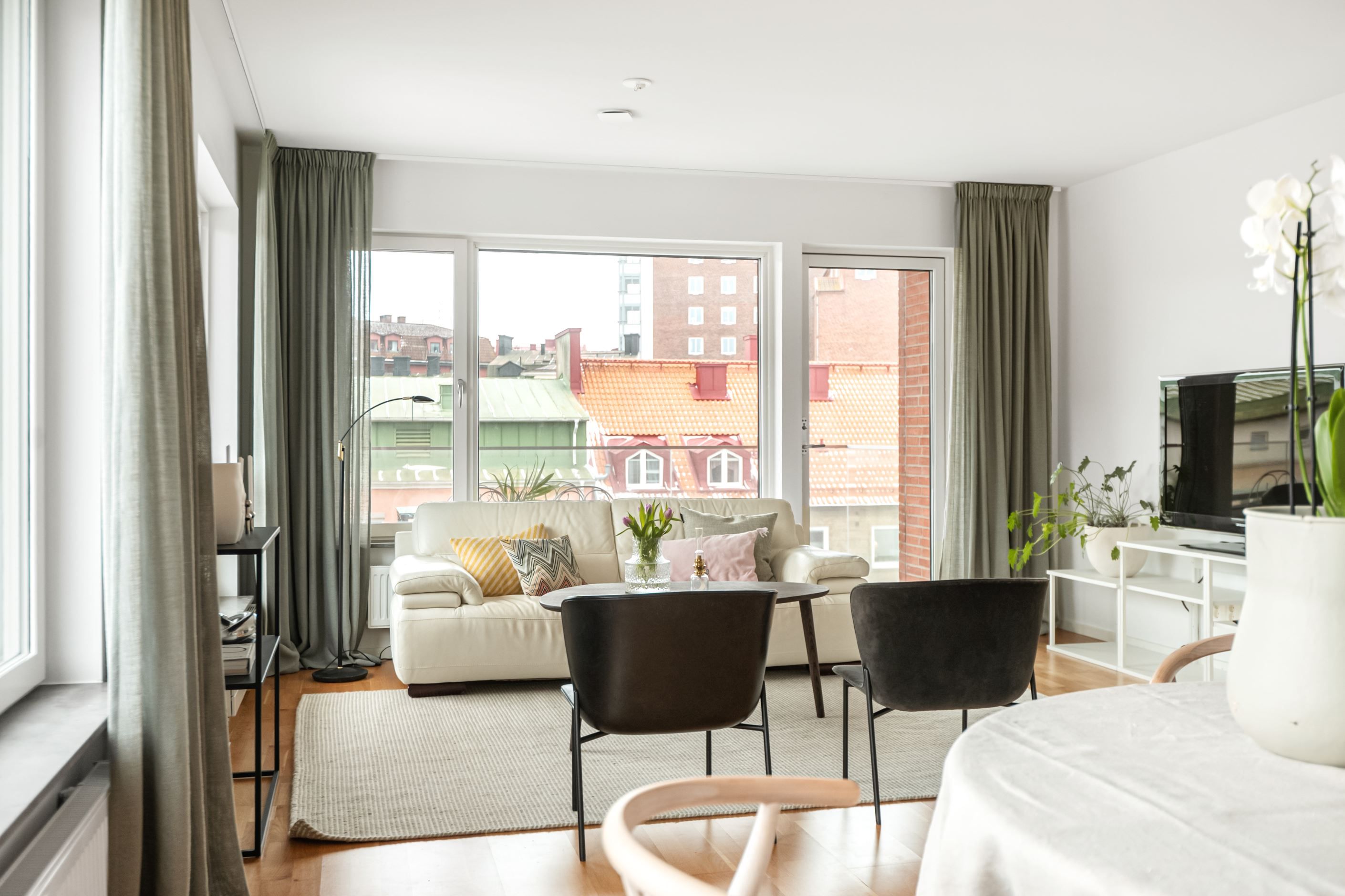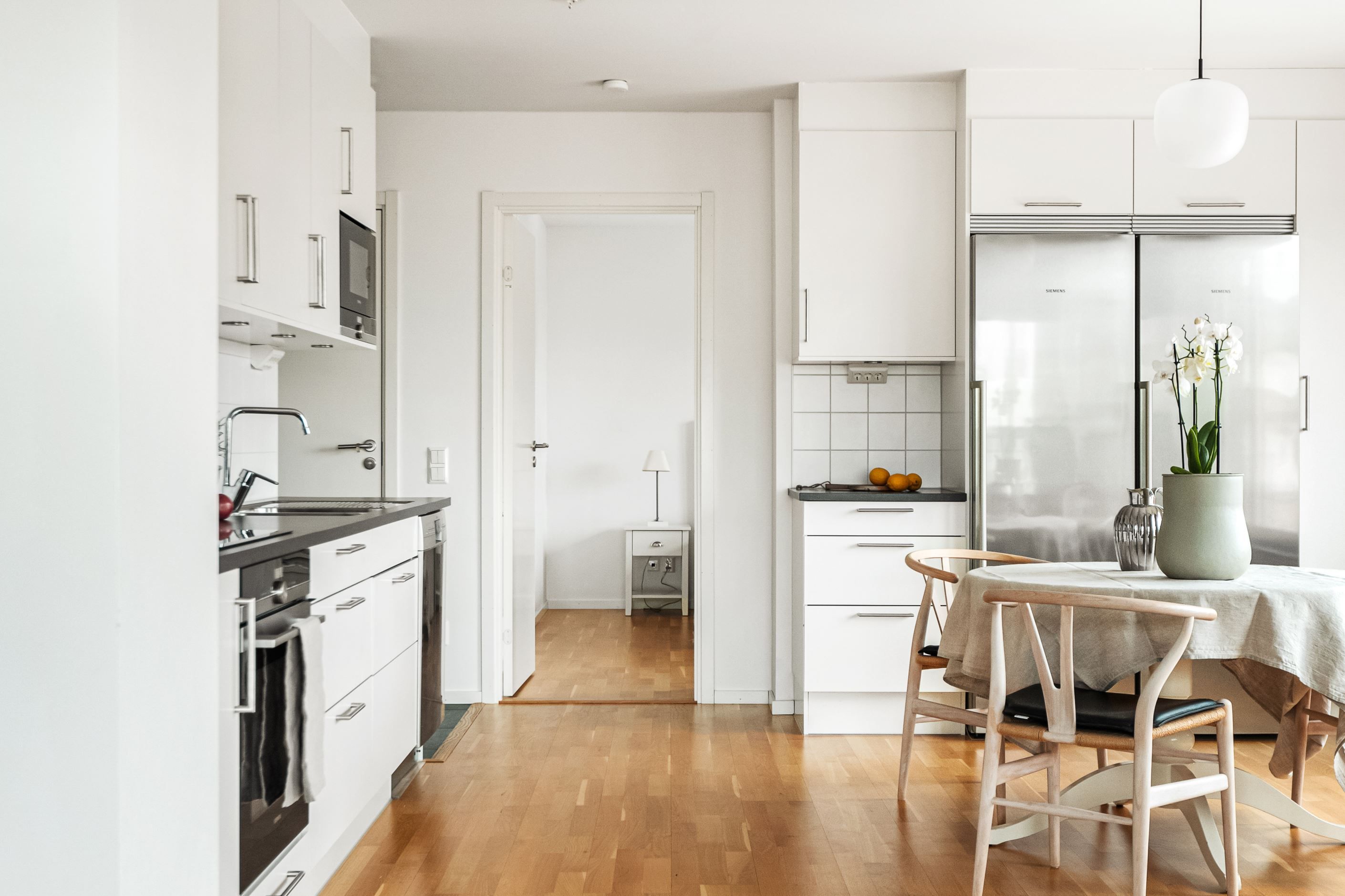 Bostaden präglas av ljusa ytskikt och fina golvval. Det öppna allrummet med kök skapar en social och inbjudande miljö med gott om plats för både soffgrupp och matbord. Från rummet nås den stora balkongen på cirka 12 kvm, perfekt för avkoppling, umgänge och middagar utomhus.