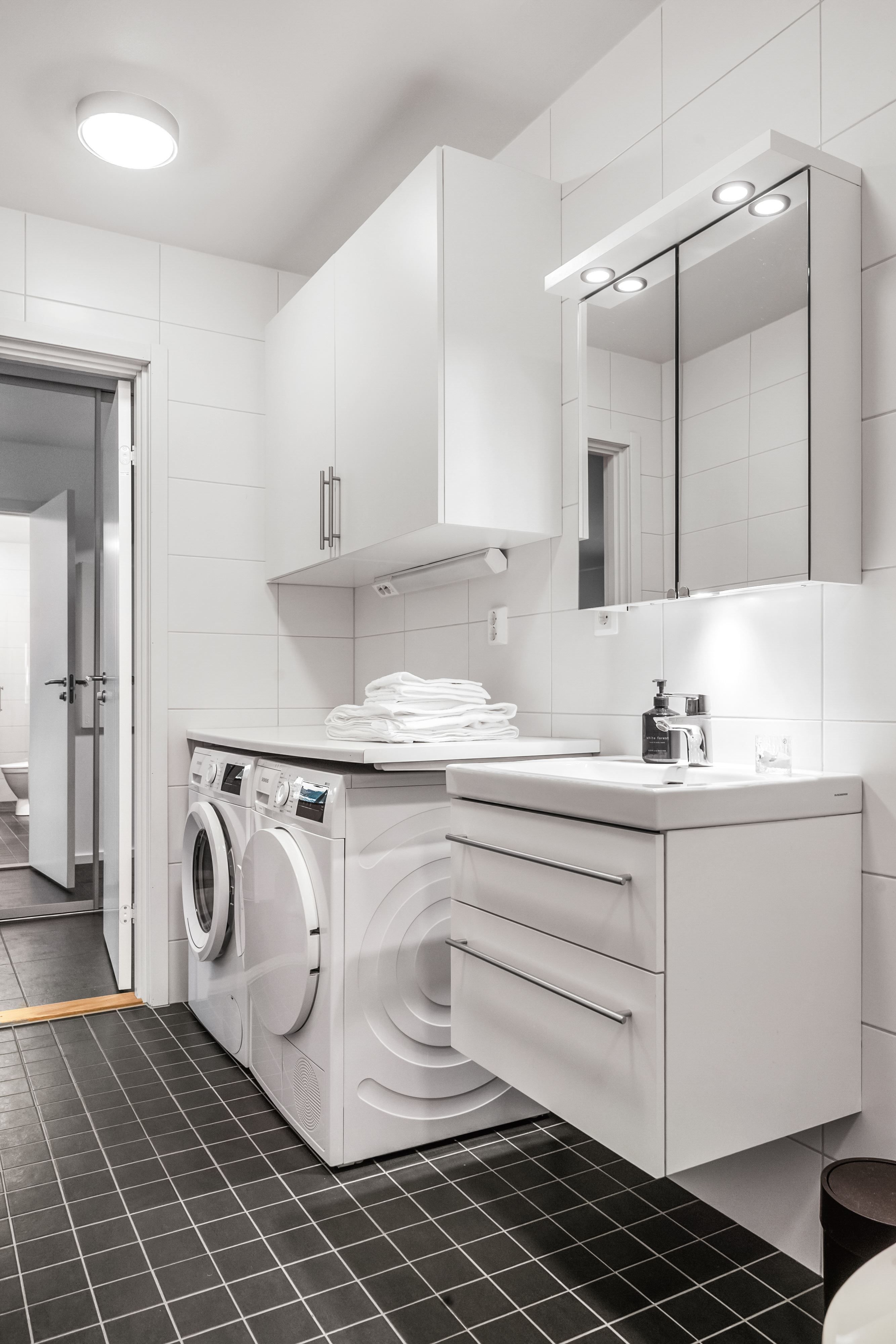 I hallen finns spegeldörrsgarderob som ger goda förvaringsmöjligheter. Det helkaklade WC/duschutrymmet är praktiskt utformat med både tvättmaskin och torktumlare, vilket underlättar vardagen.