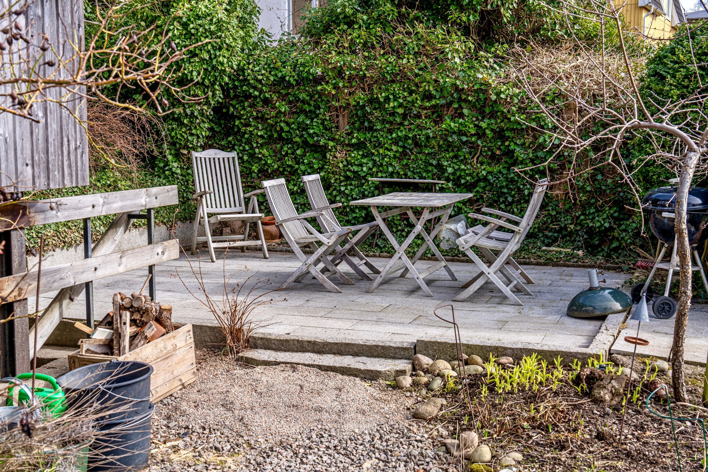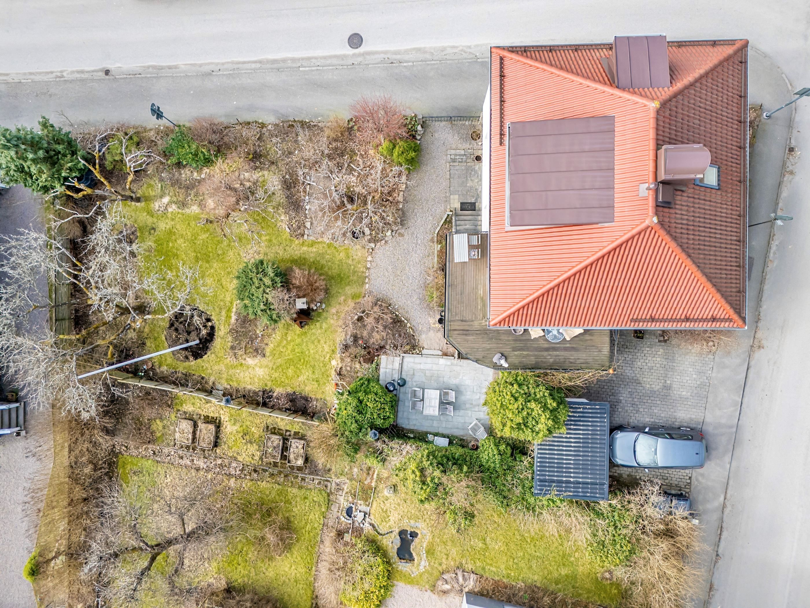 Tomten om cirka 497 kvm är lättskött och kompletteras av en friggebod som ger praktisk förvaring eller möjlighet till vidare utveckling.
