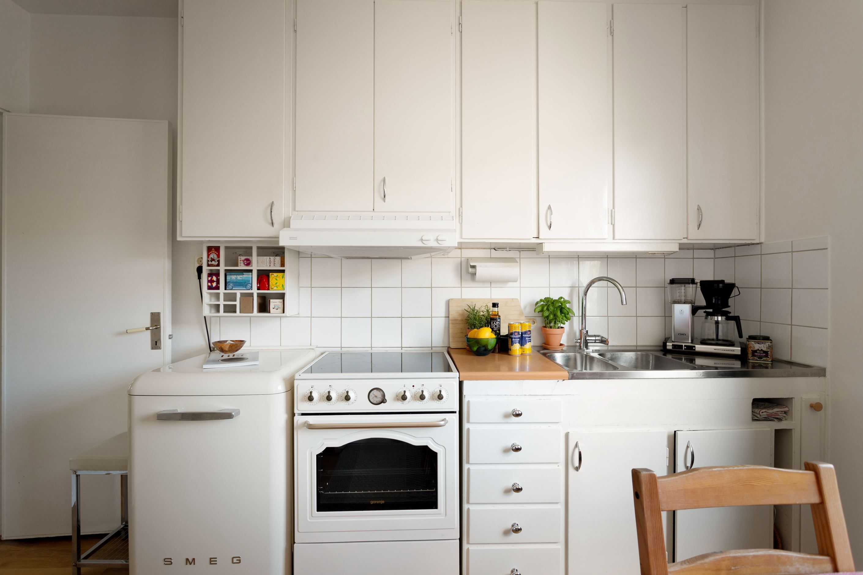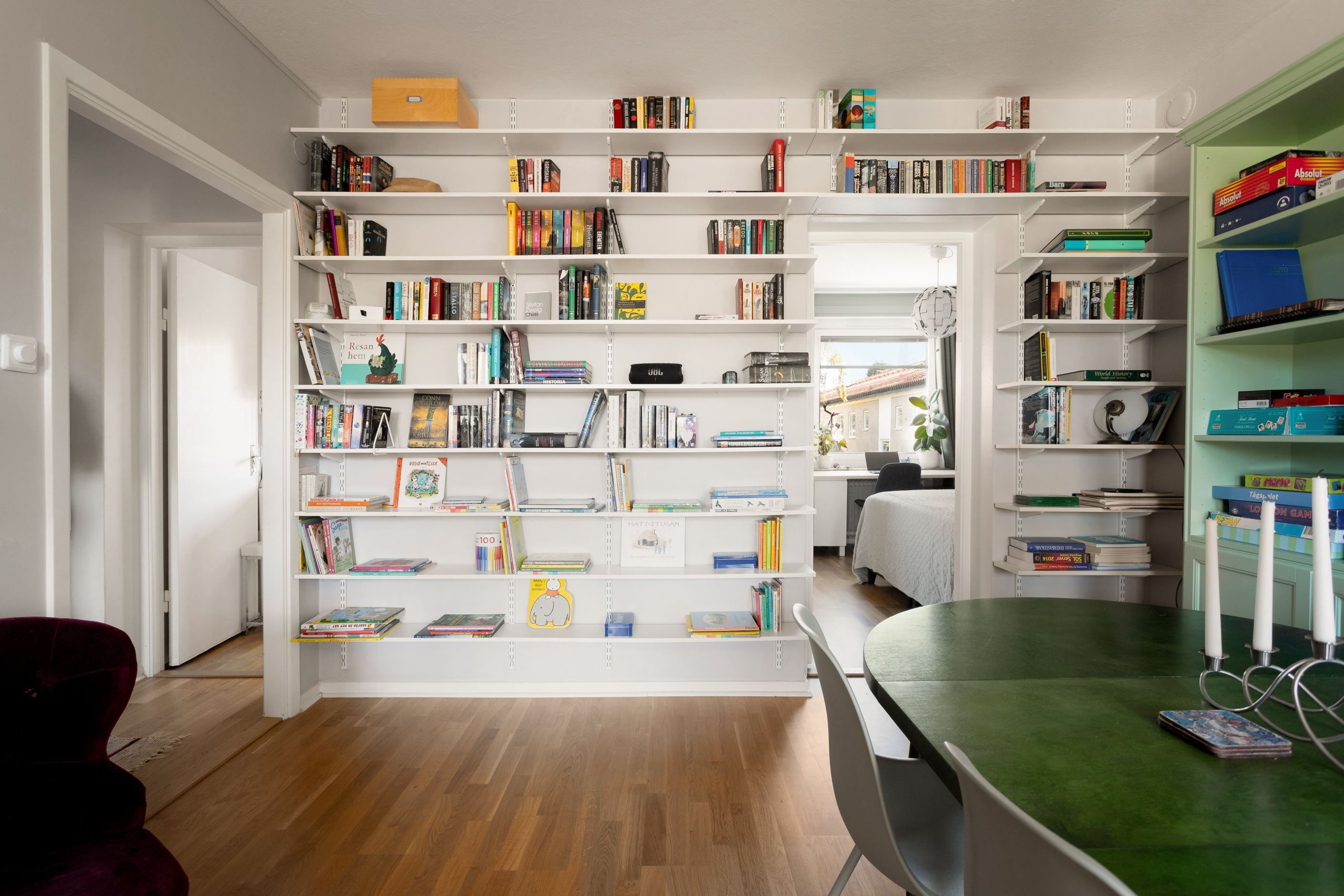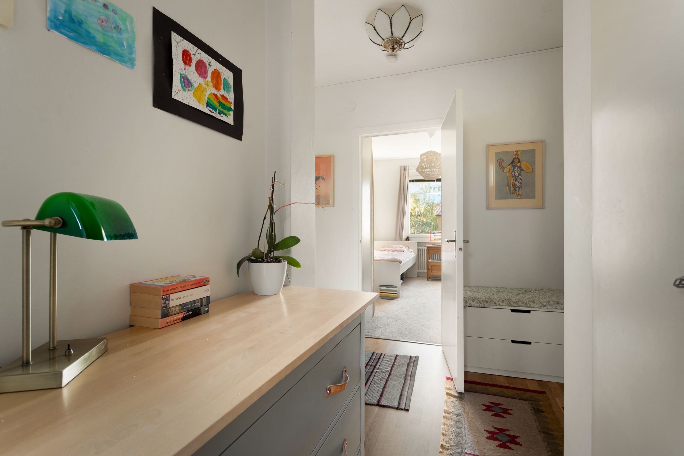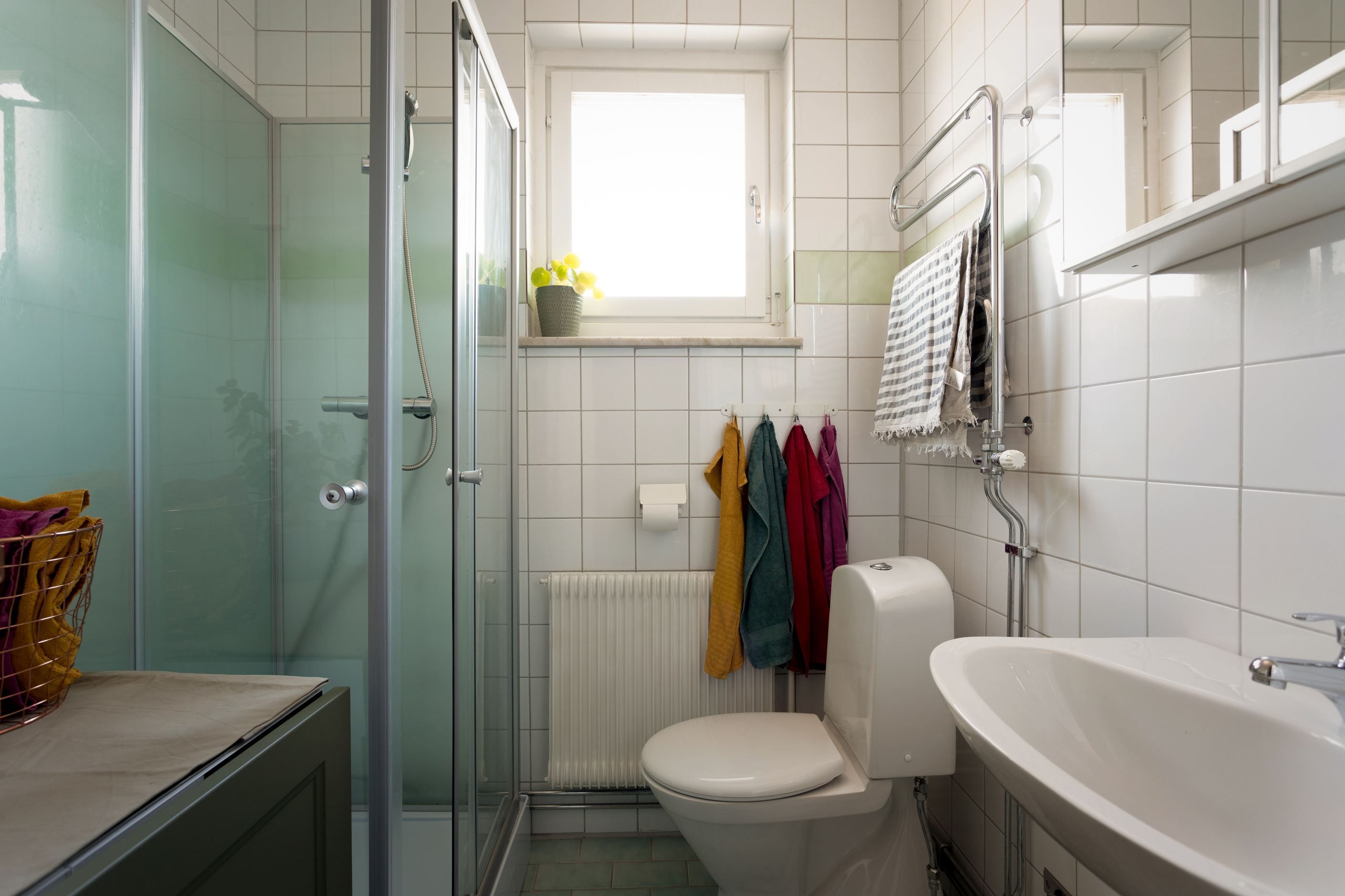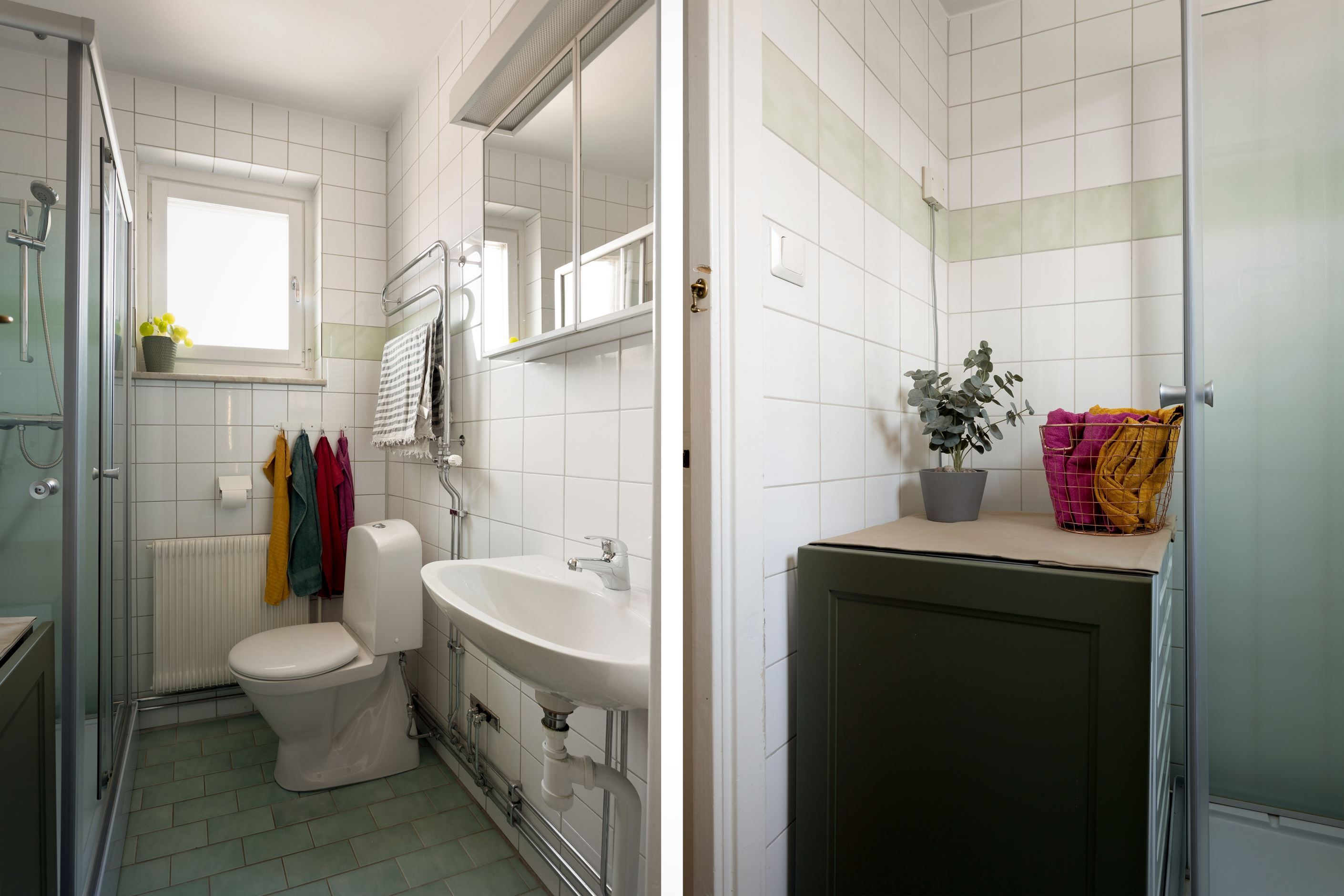 Badrummet är helkaklat, utrustat med kombimaskin (med tvätt- och torkfunktion) och i den möblerbara hallen finns gott om platsbyggda originalgarderober med mycket generösa förvaringsutrymmen.