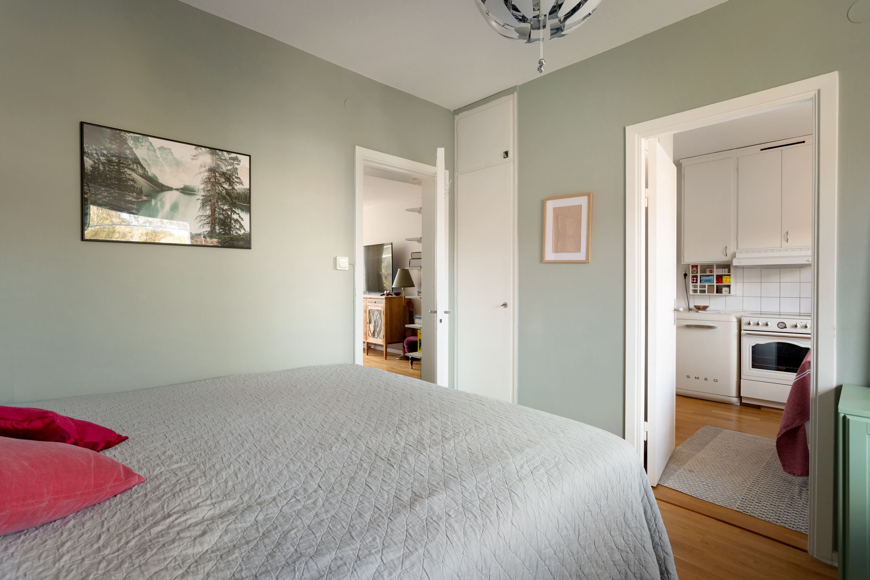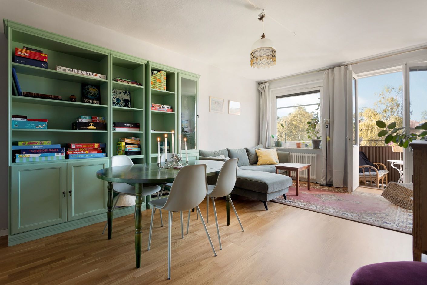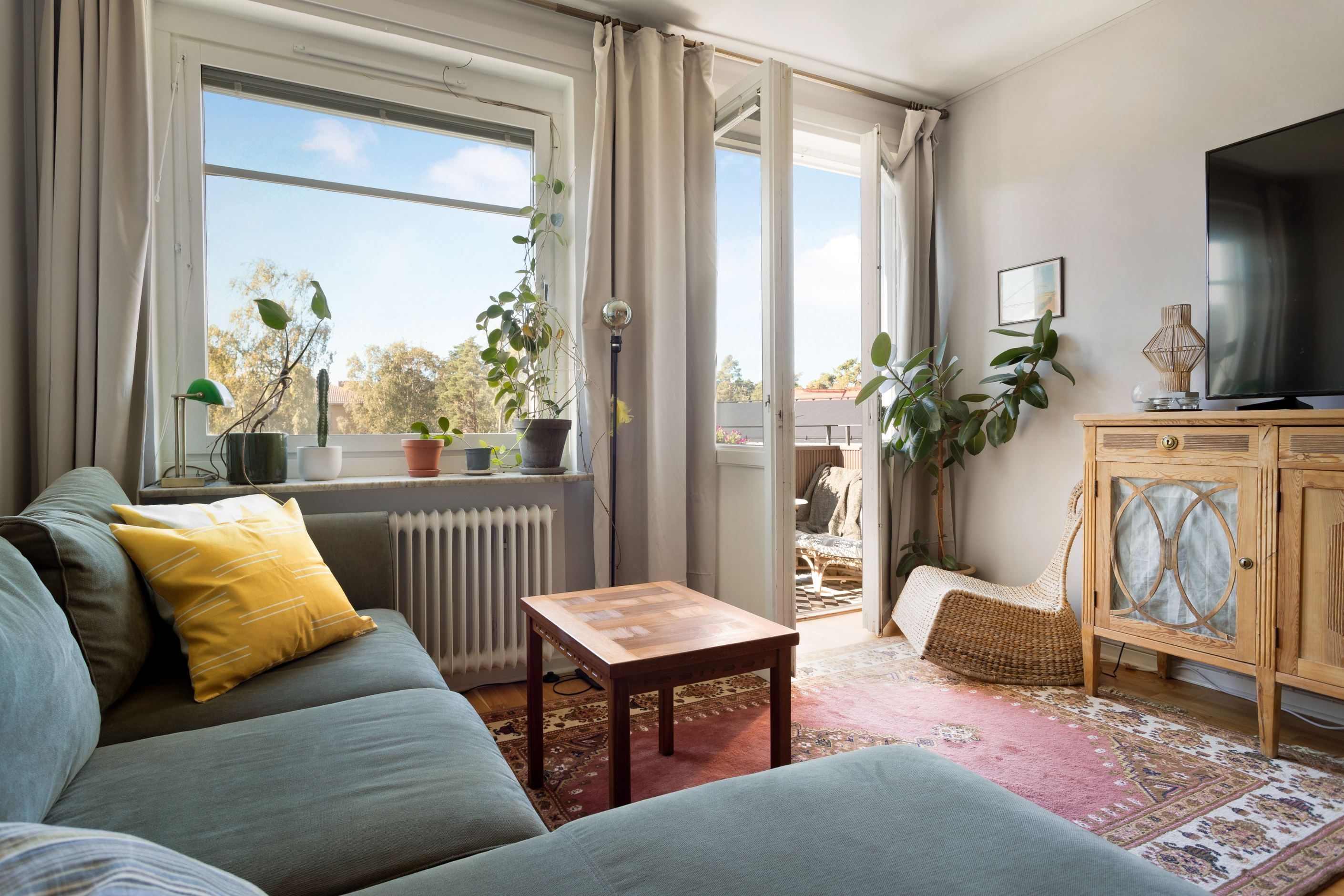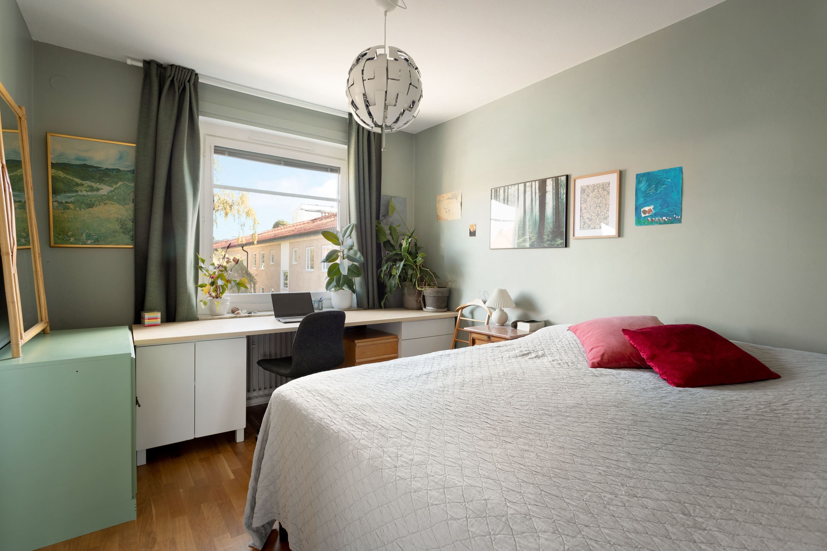 Lägenheten ligger högst upp i huset med flera rejäla fönsterpartier i två väderstreck och en balkong i sydväst. Vidare finns två rymliga sovrum med utrymme för ett komplett sovrumsmöblemang och i det öppna vardagsrummet ryms både en större soffgrupp, TV-möbler liksom ett större matbord och bokhyllor, m.m.