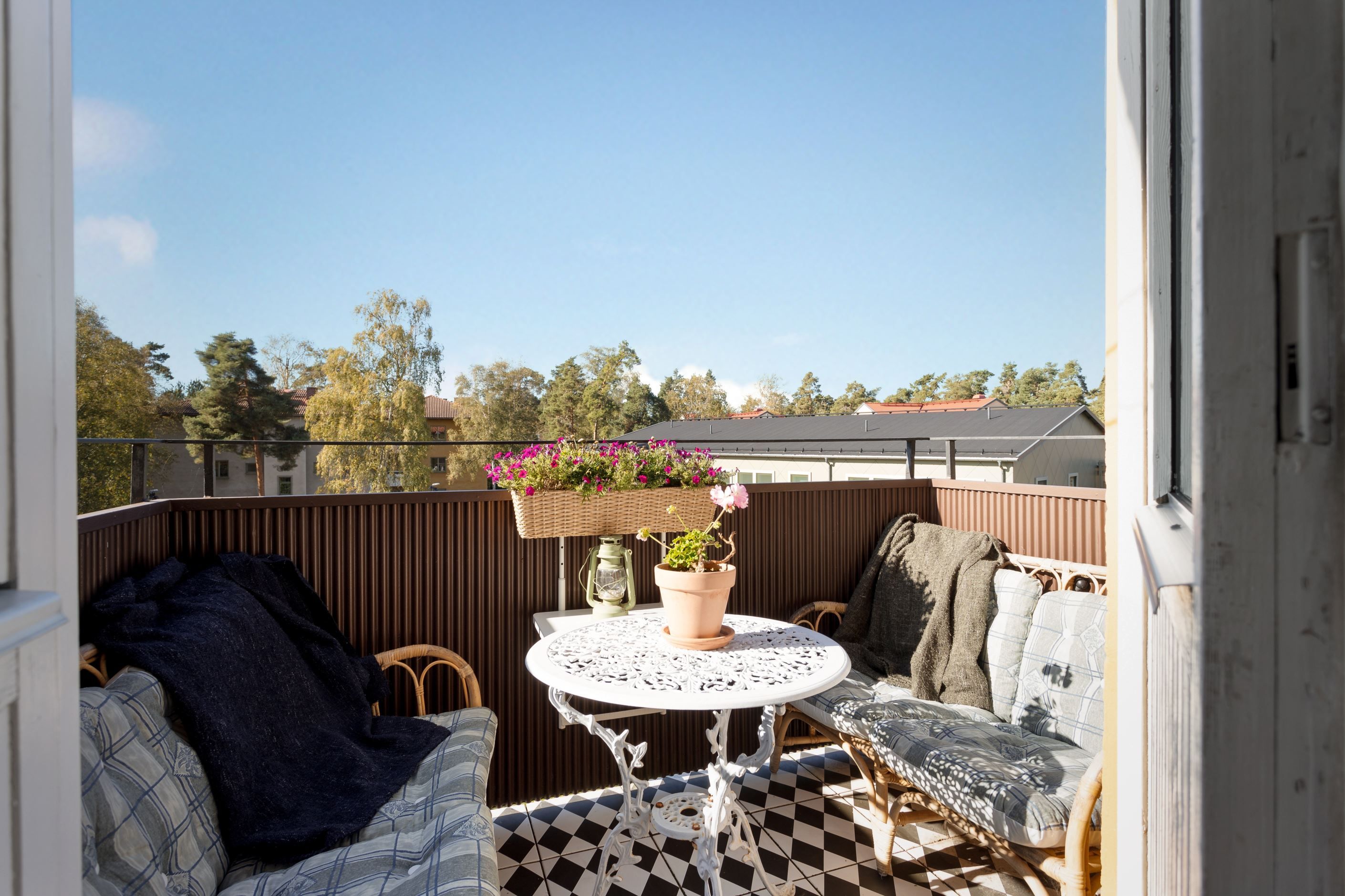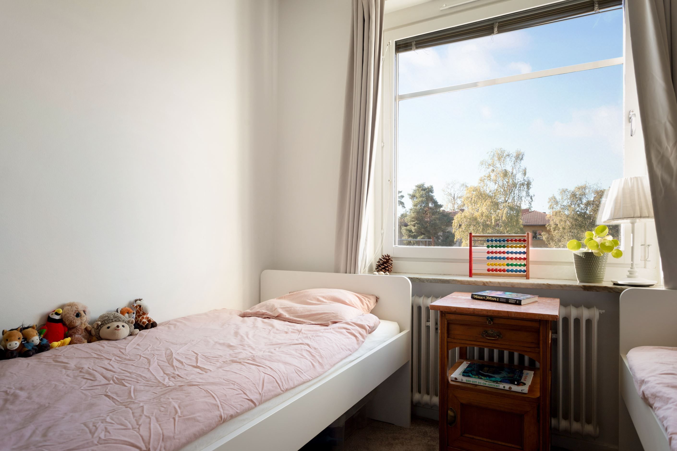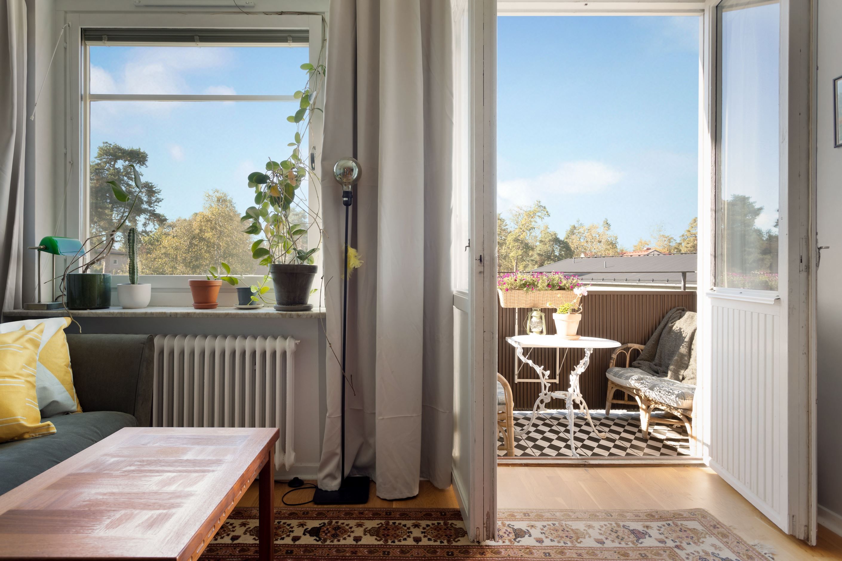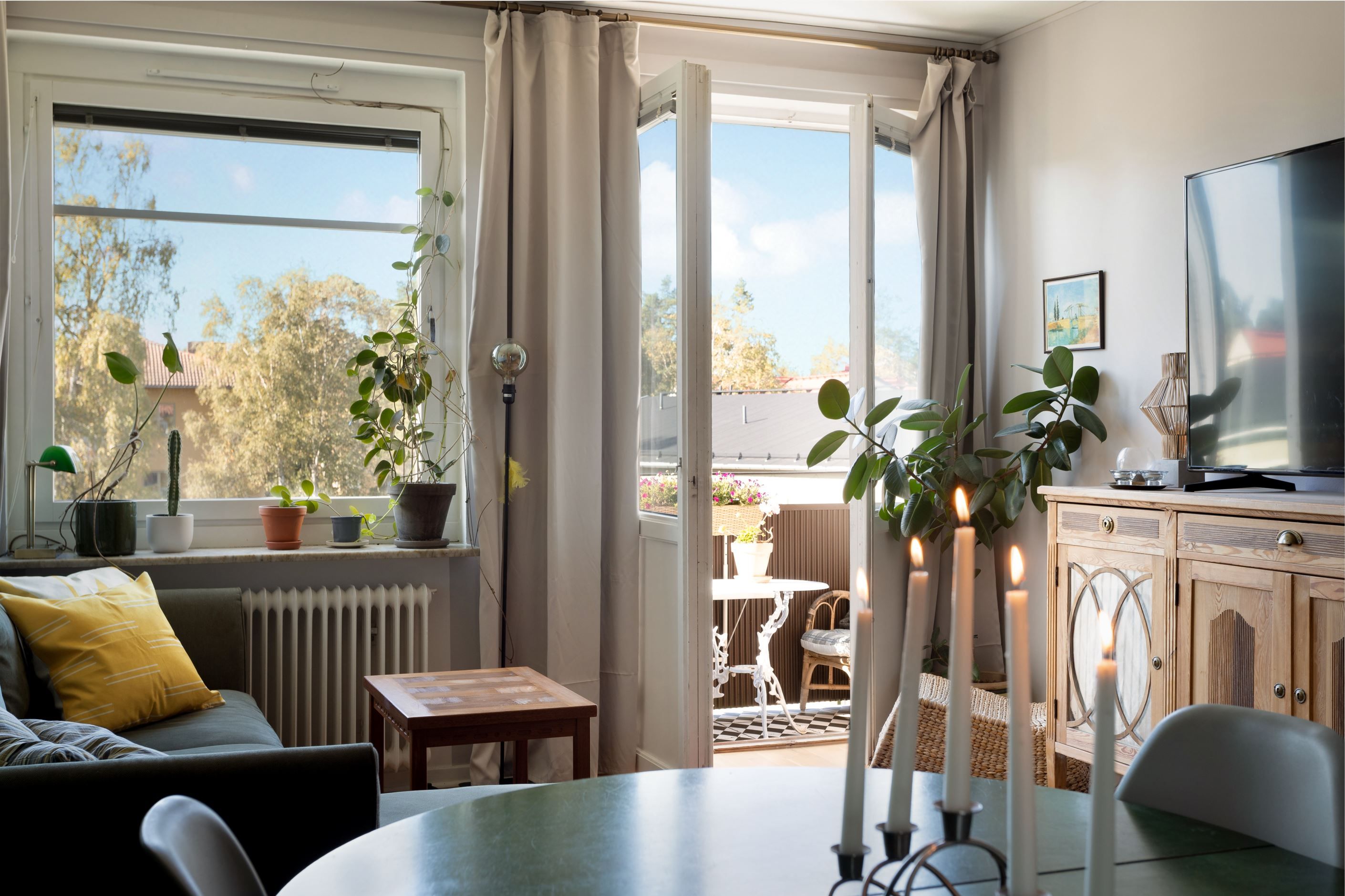 Lägenheten ligger högst upp i huset med flera rejäla fönsterpartier i två väderstreck och en balkong i sydväst. Vidare finns två rymliga sovrum med utrymme för ett komplett sovrumsmöblemang och i det öppna vardagsrummet ryms både en större soffgrupp, TV-möbler liksom ett större matbord och bokhyllor, m.m.