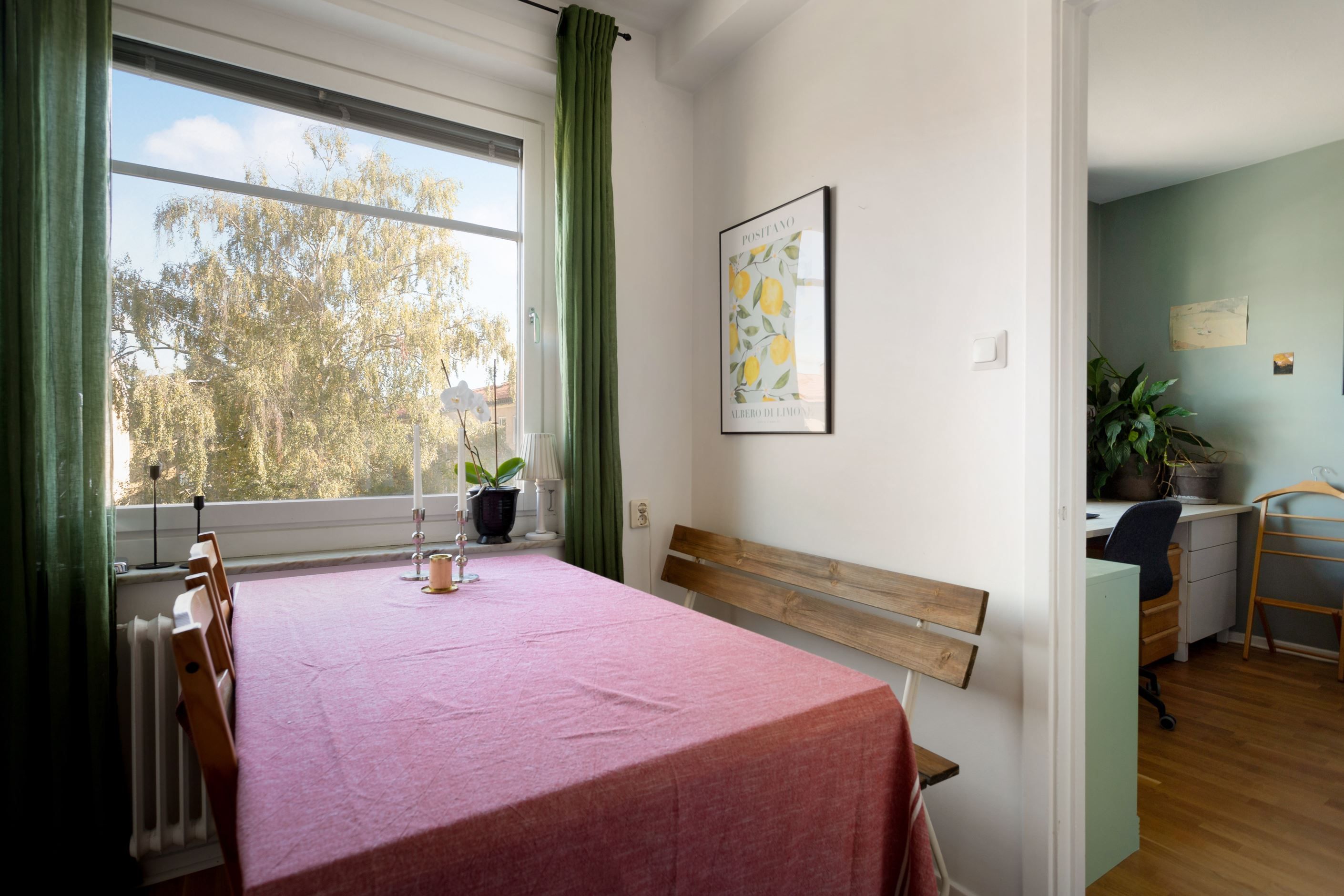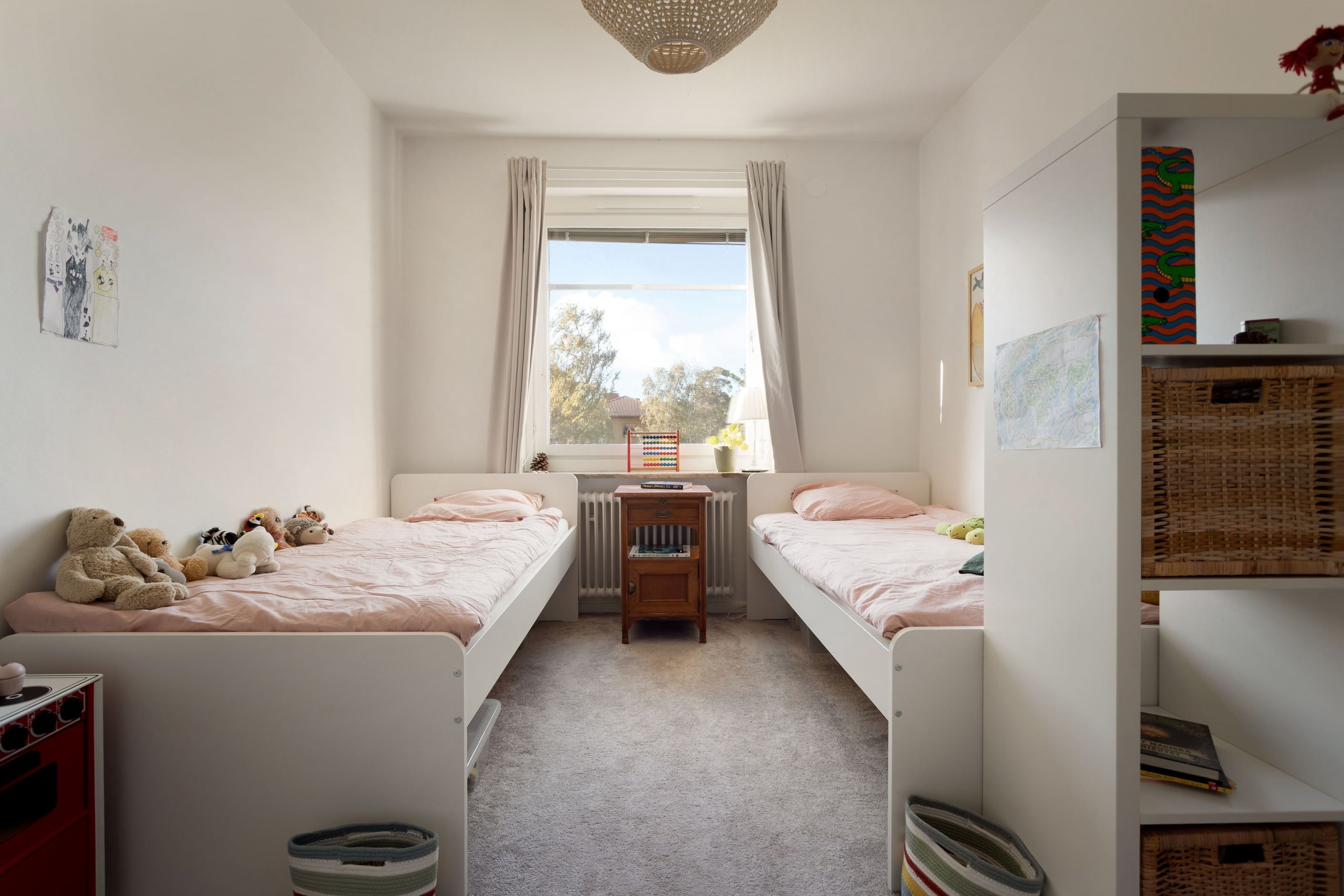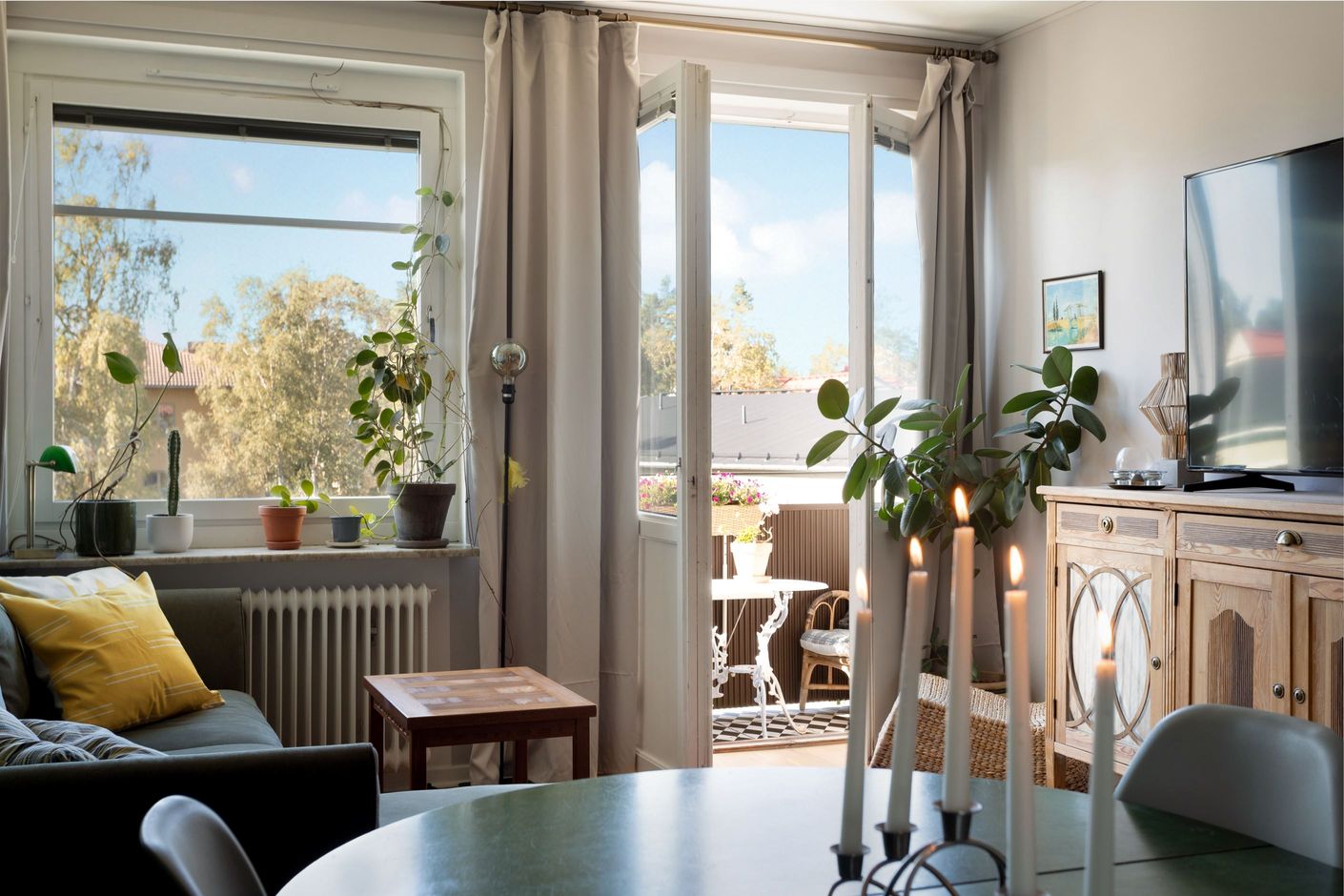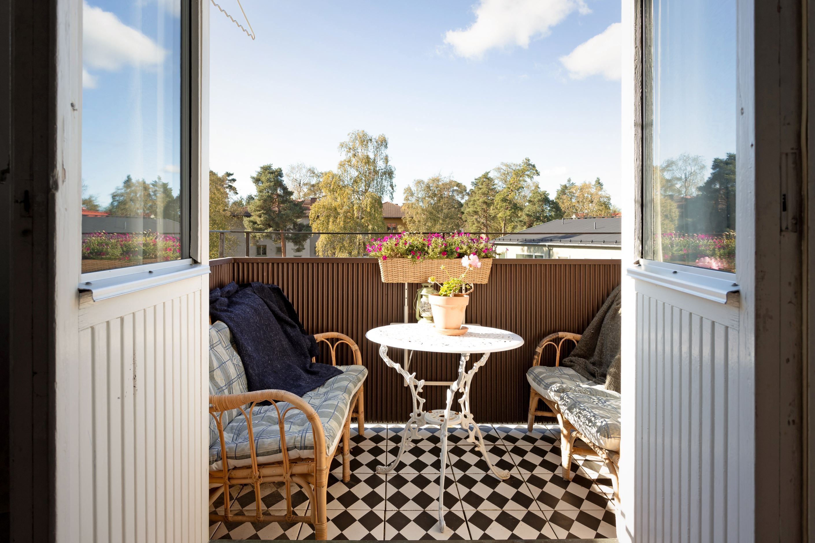 Lägenheten ligger högst upp i huset med flera rejäla fönsterpartier i två väderstreck och en balkong i sydväst. Vidare finns två rymliga sovrum med utrymme för ett komplett sovrumsmöblemang och i det öppna vardagsrummet ryms både en större soffgrupp, TV-möbler liksom ett större matbord och bokhyllor, m.m.