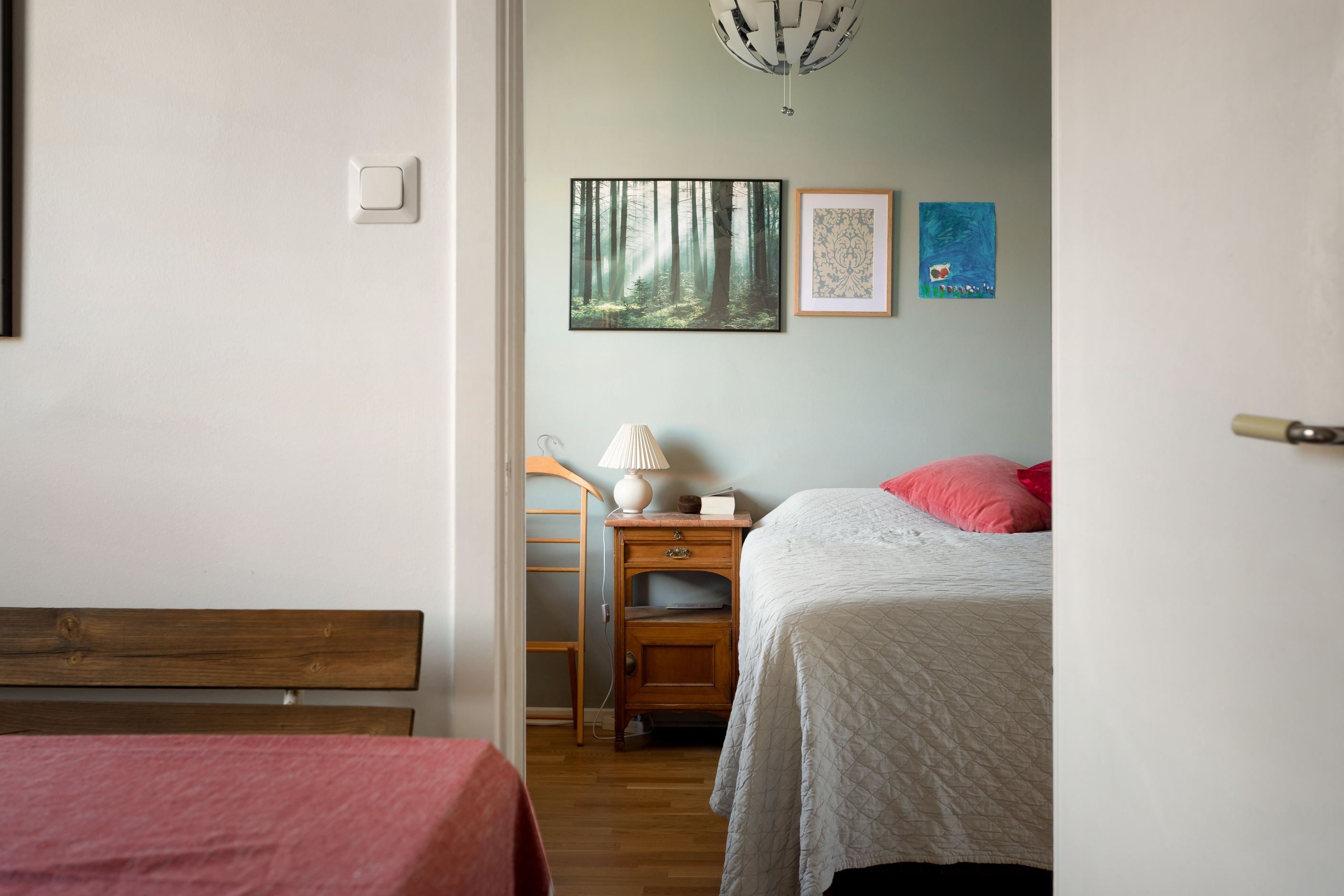 Lägenheten är belägen knappt 2-minuter från T-bana och närmsta livsmedelsaffär ligger knappt en minut bort då lilla torget ligger precis runt hörnet.