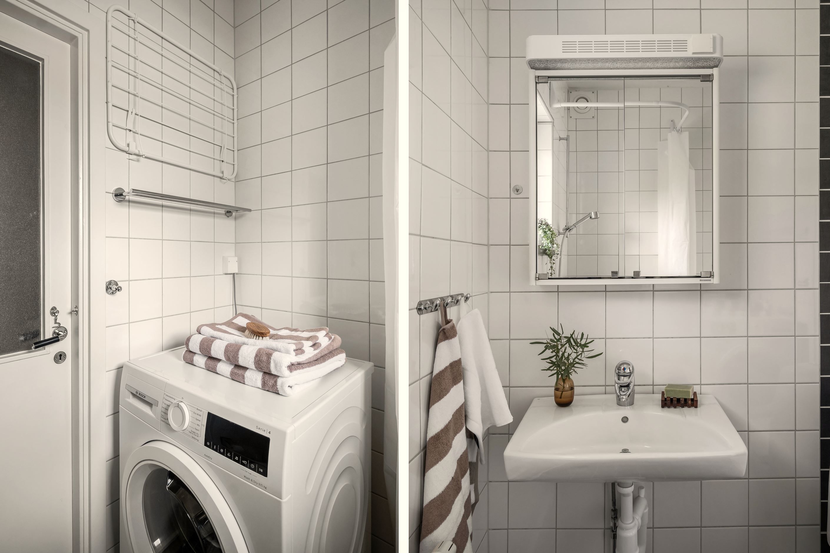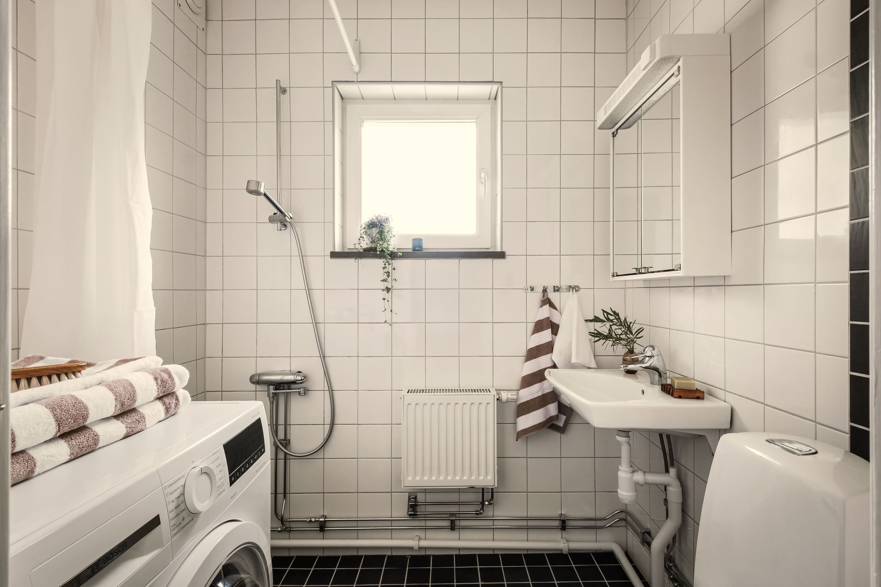 Badrummet är stilrent helkaklat i klassiskt vitt och grått. Här finns bekvämligheter som golvvärme och en praktisk kombimaskin (tvätt/tork) samt ett stort vädringsfönster som skänker ett härligt naturligt ljus.
