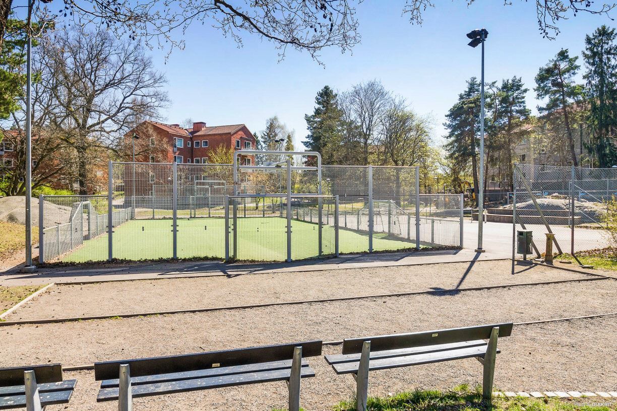 Läget är optimalt – endast en minuts promenad till centrum med ett brett serviceutbud och tunnelbana, samtidigt som bostaden ligger helt avskärmat och tyst. På fem minuter når du skogens lugn och vackra motionsspår. I närområdet finns dessutom flera bra för- och grundskolor.