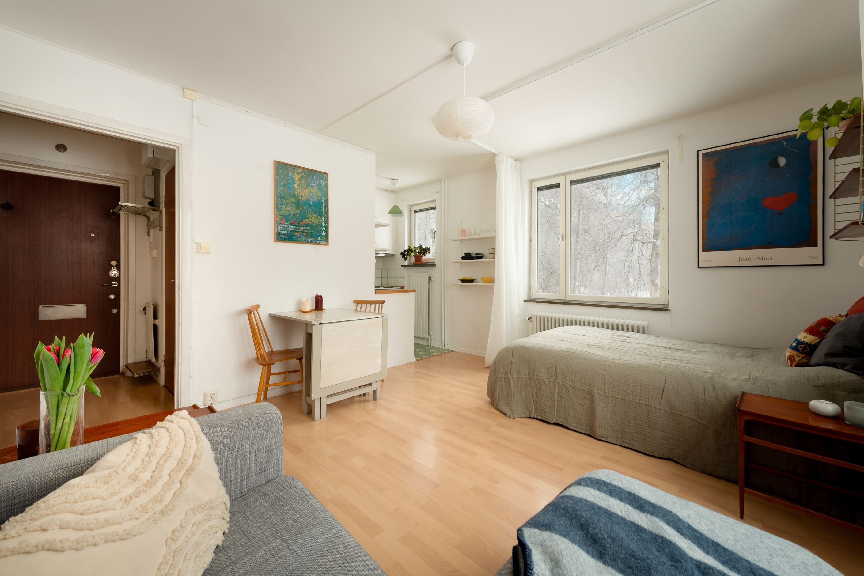 Den yteffektiva planlösningen gör lägenheten både luftig och lättmöblerad med plats för bred säng, soffa och matbord. Välplanerad hall med gott om förvaringsutrymme.