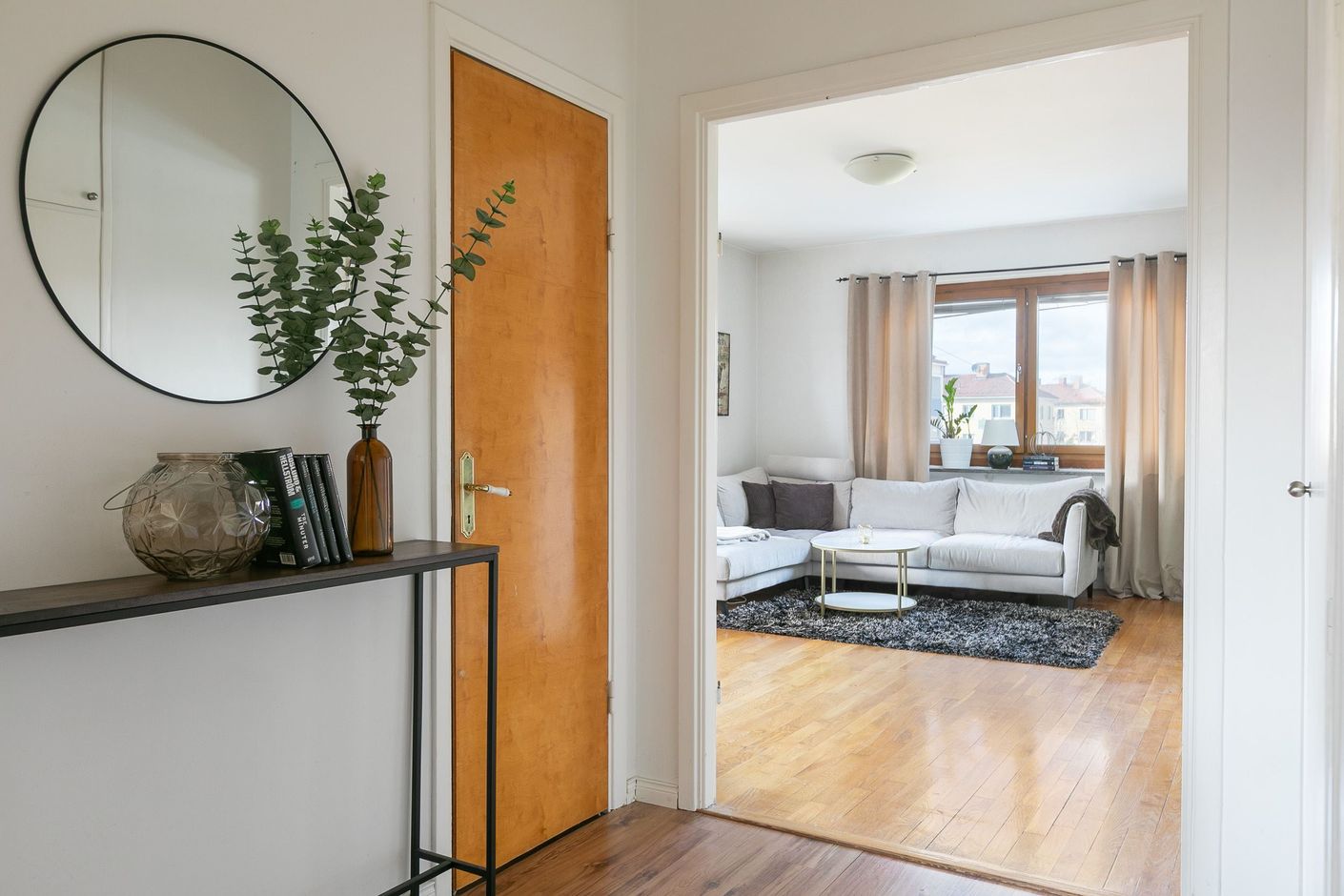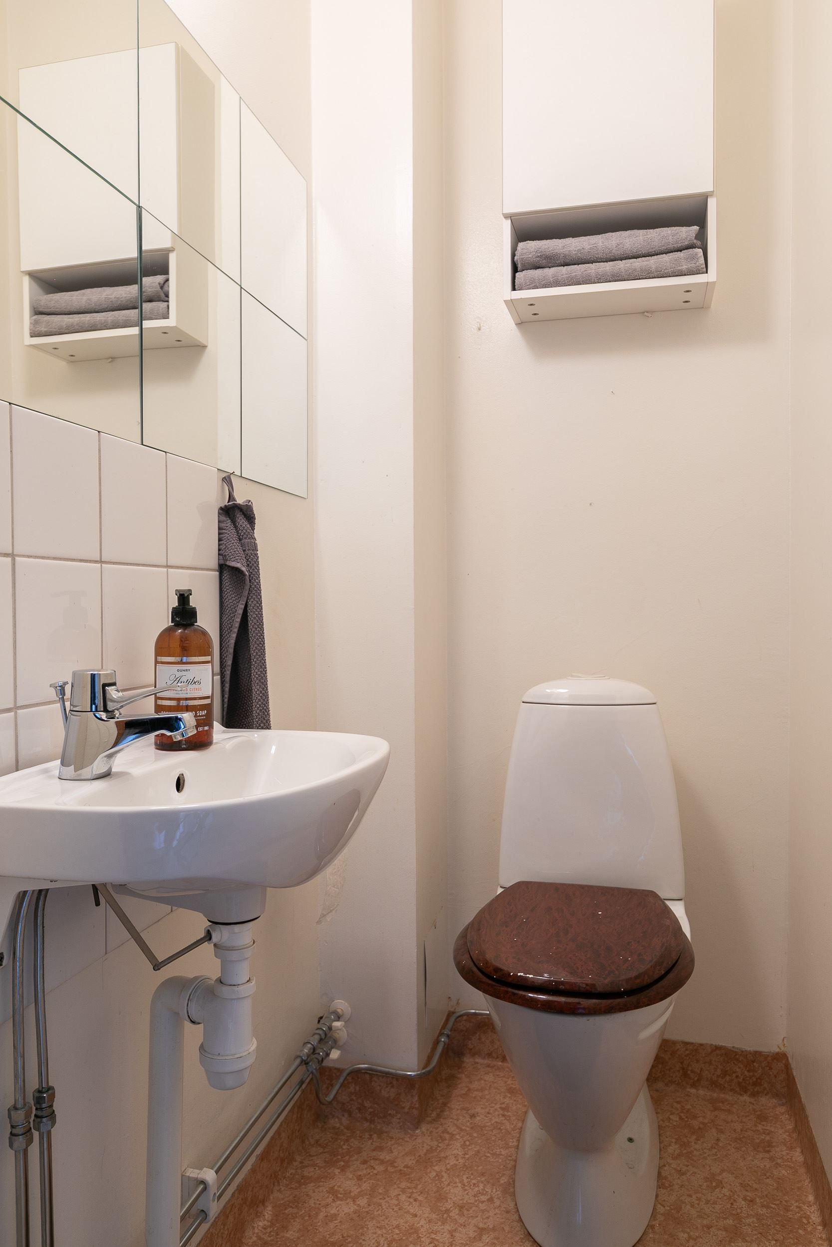Lägenheten erbjuder en väl genomtänkt planlösning med två separata ingångar, vilket ger extra flexibilitet – perfekt för exempelvis ett tonårsbarn, ett hemmakontor eller som en möjlighet till uthyrning. Bostaden har dessutom ett badrum och en separat gäst-WC, vilket bidrar till både bekvämlighet och funktion i vardagen. I badrummet finns möjlighet till tvättmaskin.