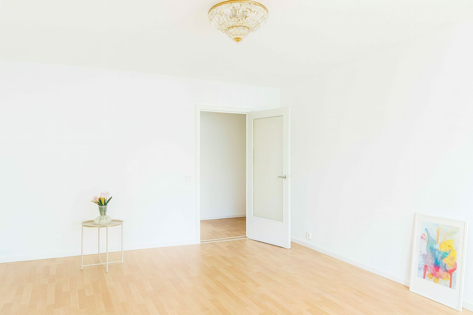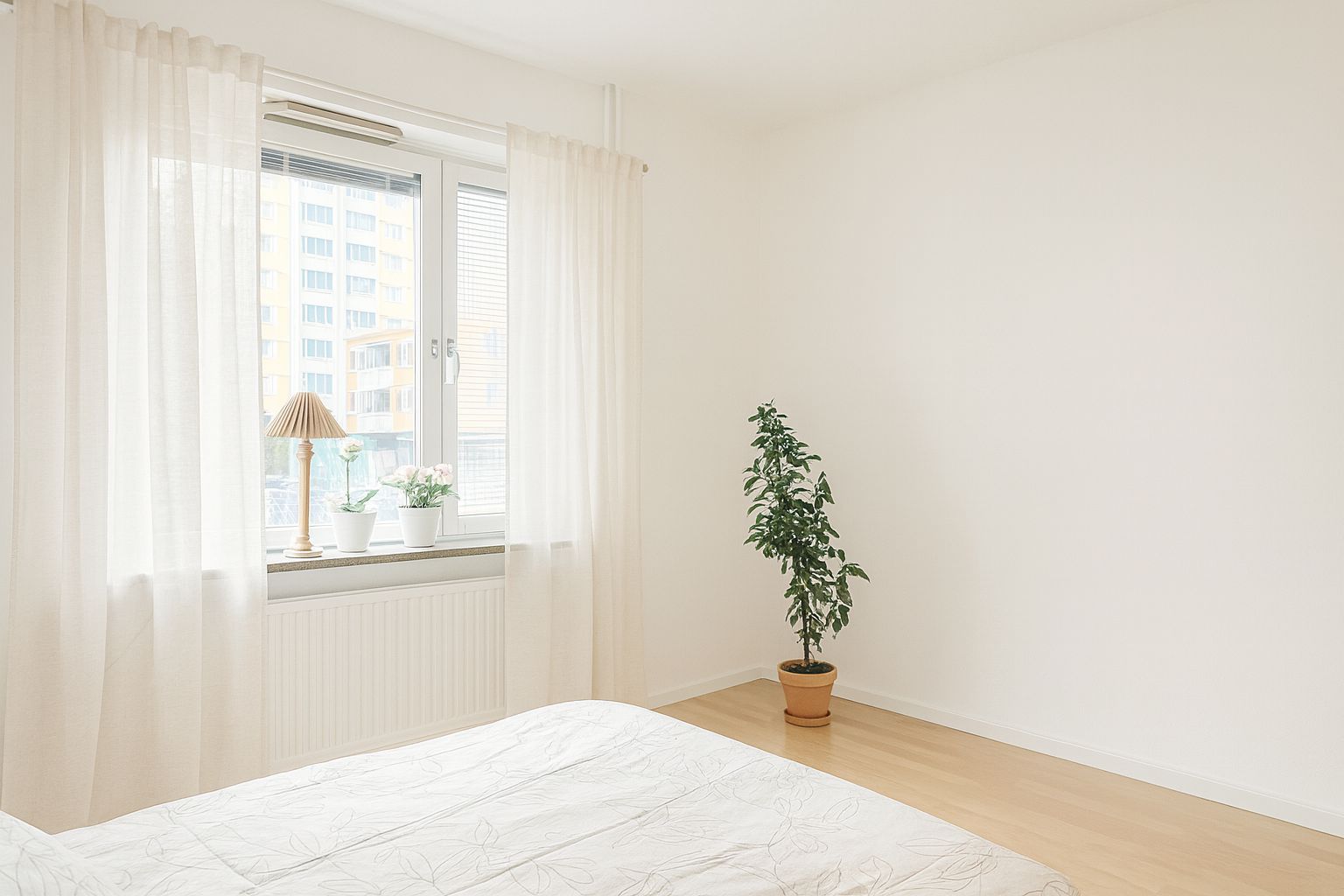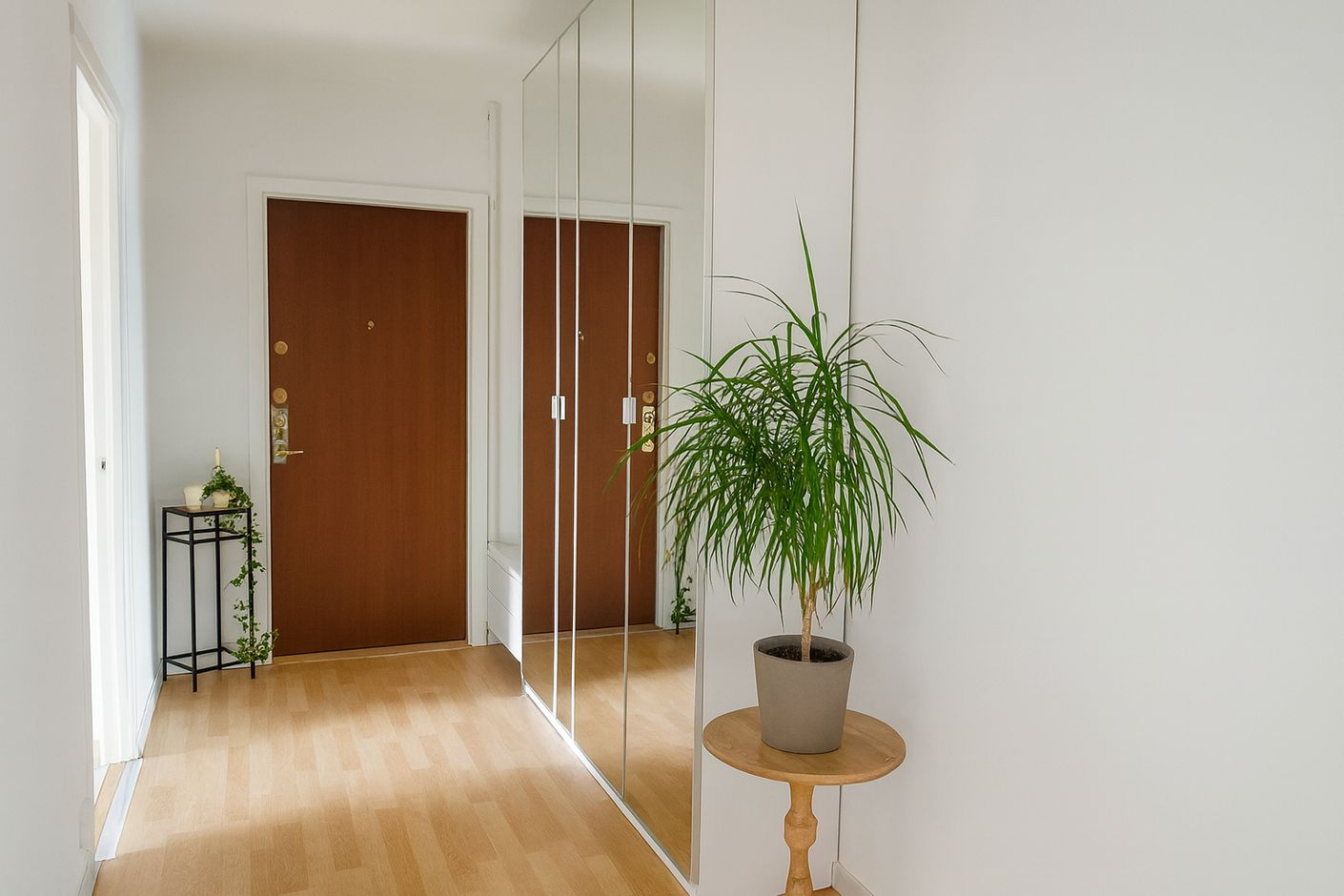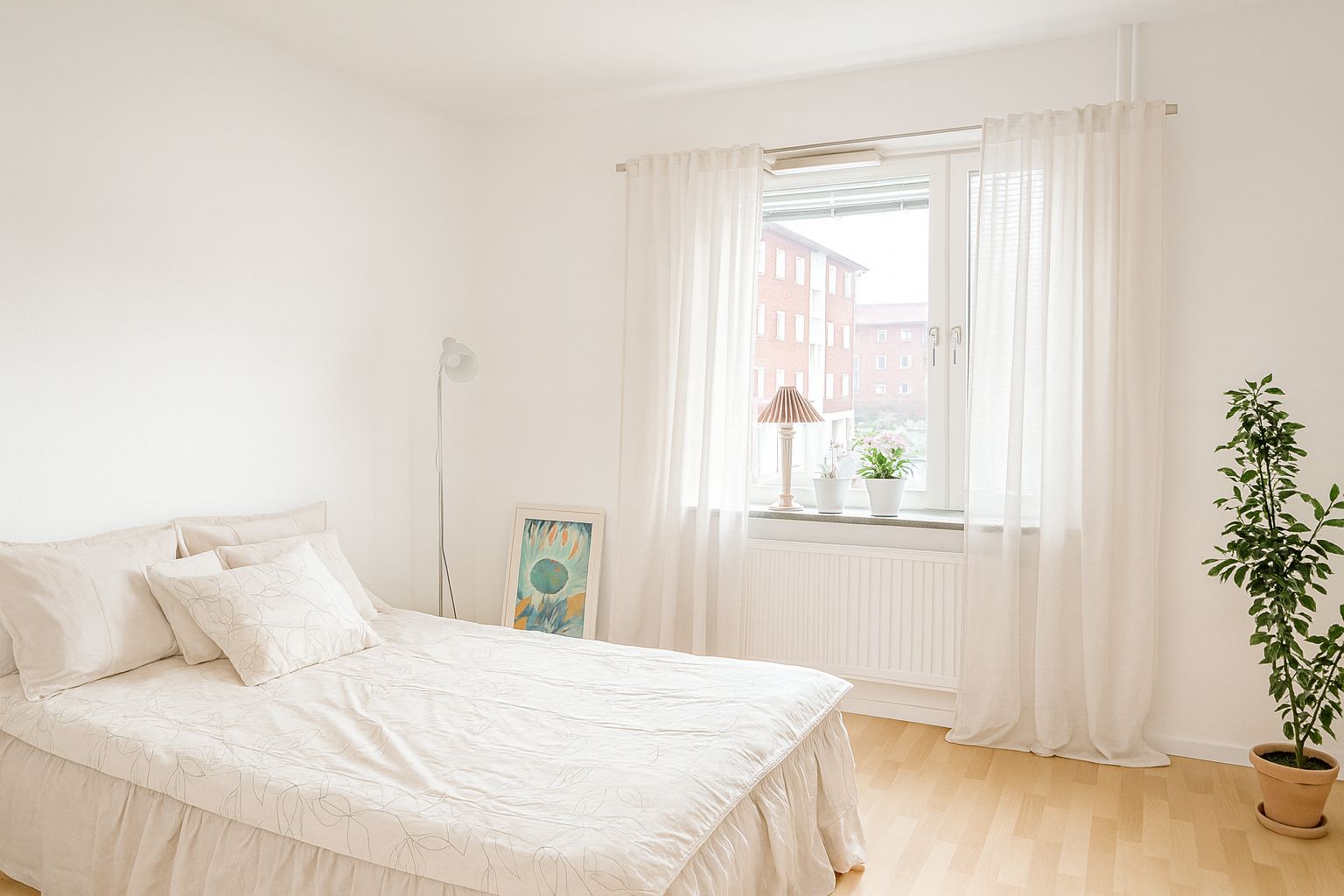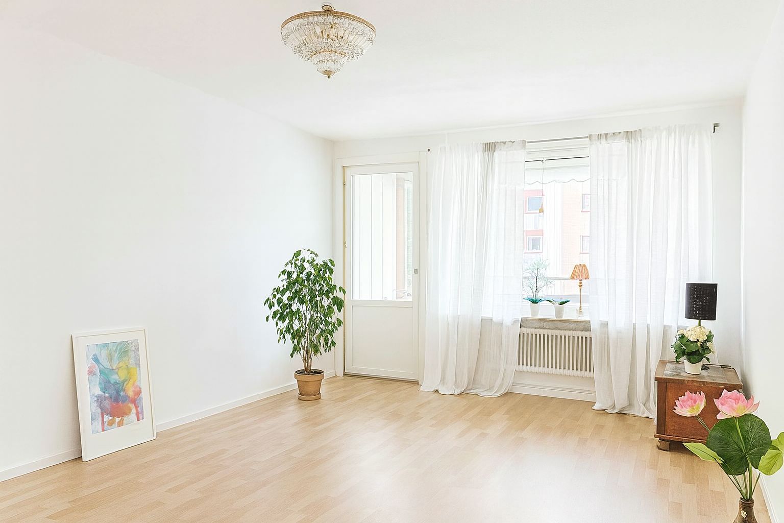 Bostaden har ett fint ljusinsläpp från stora fönster och en planlösning som känns både luftig och lätt att möblera. Ljusa väggar och golv skapar en harmonisk känsla som gör att bostaden känns inbjudande redan när man kliver in.