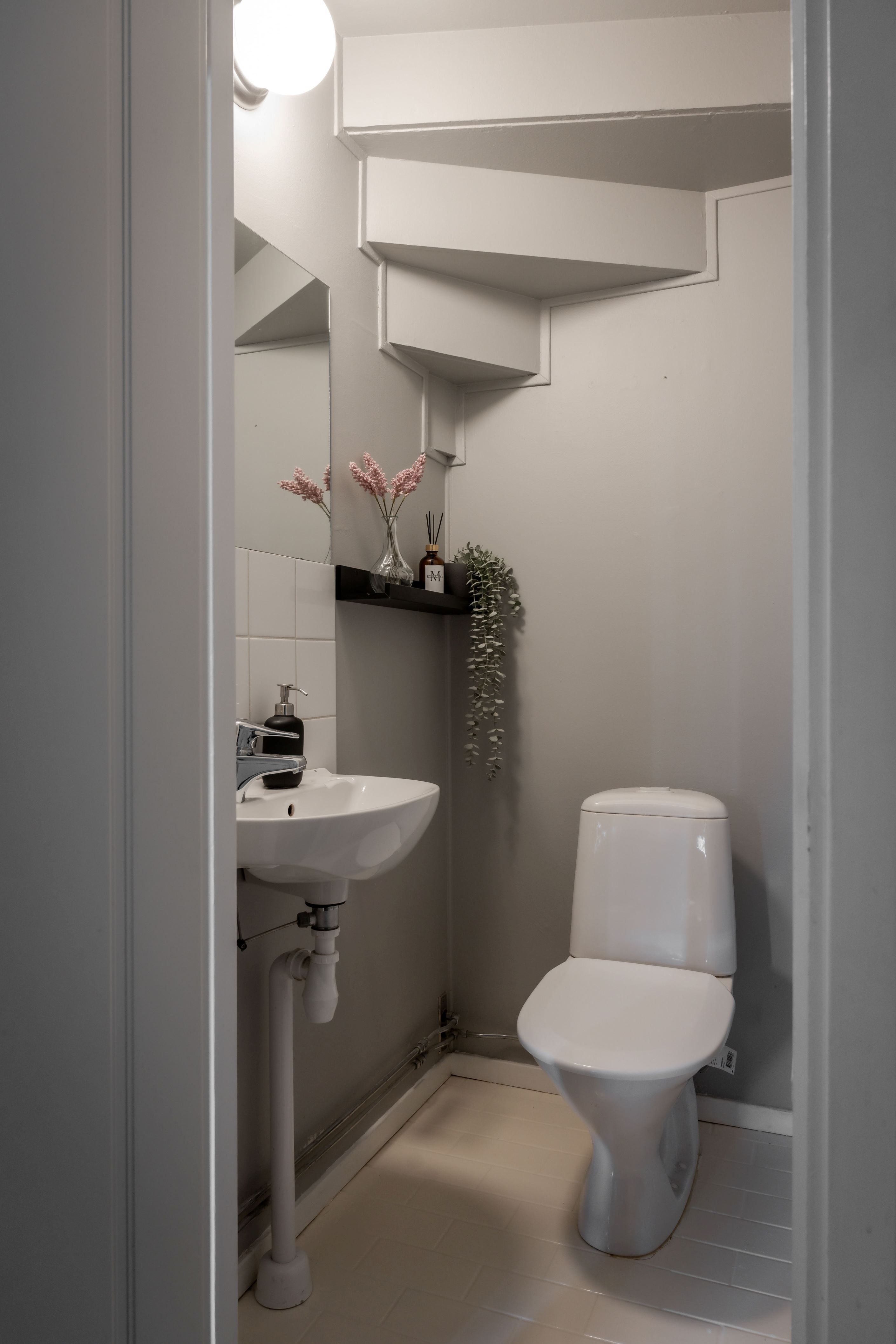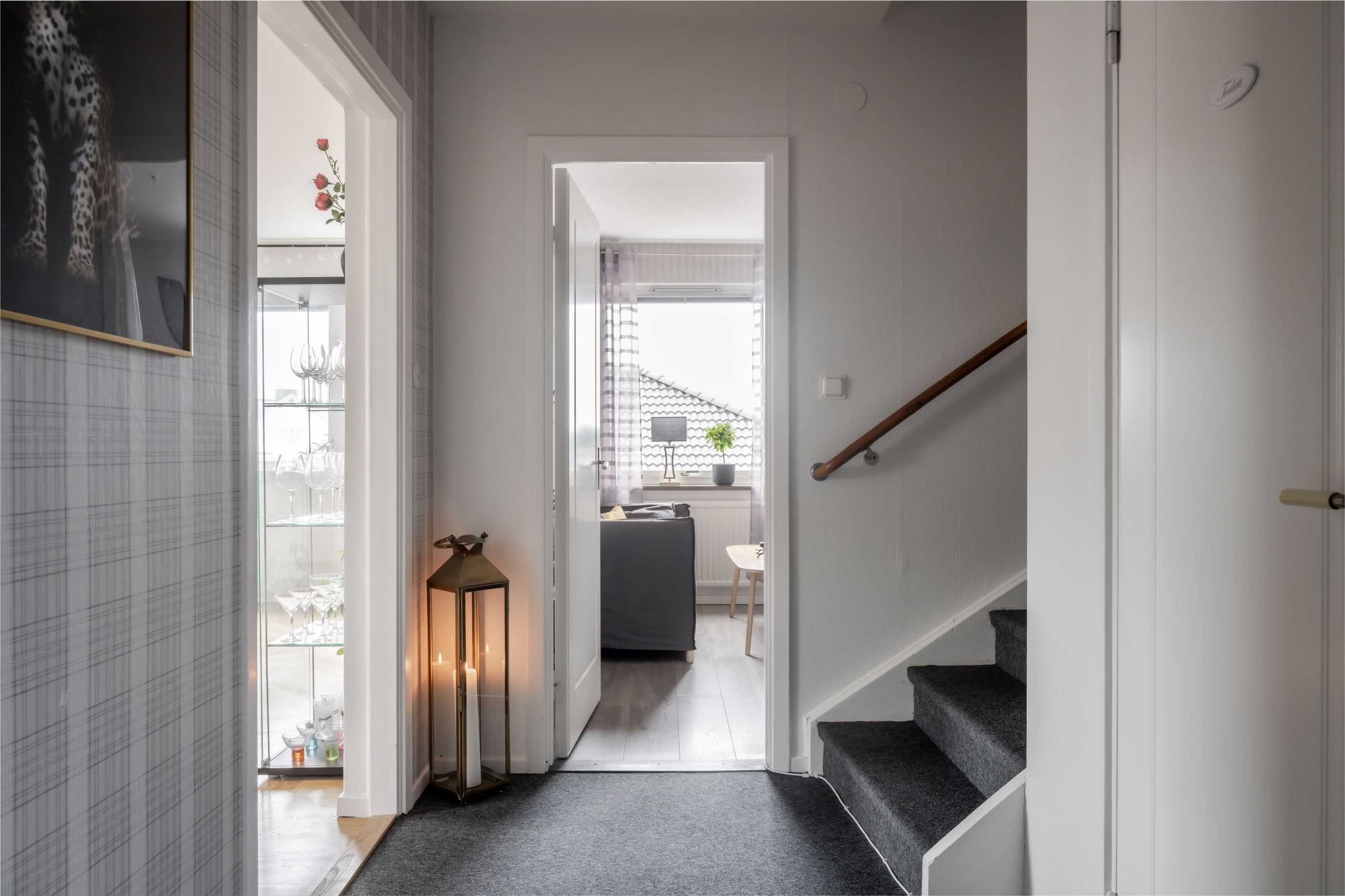 Entréplanet präglas av sociala ytor med öppen planlösning mellan kök och vardagsrum, där köksö och genomtänkta arbetsytor gör bostaden väl lämpad för både vardag och umgänge. Här finns även utgång till balkong i ett attraktivt solläge samt en praktisk gäst-WC. På detta plan finns även ett av sovrummen.