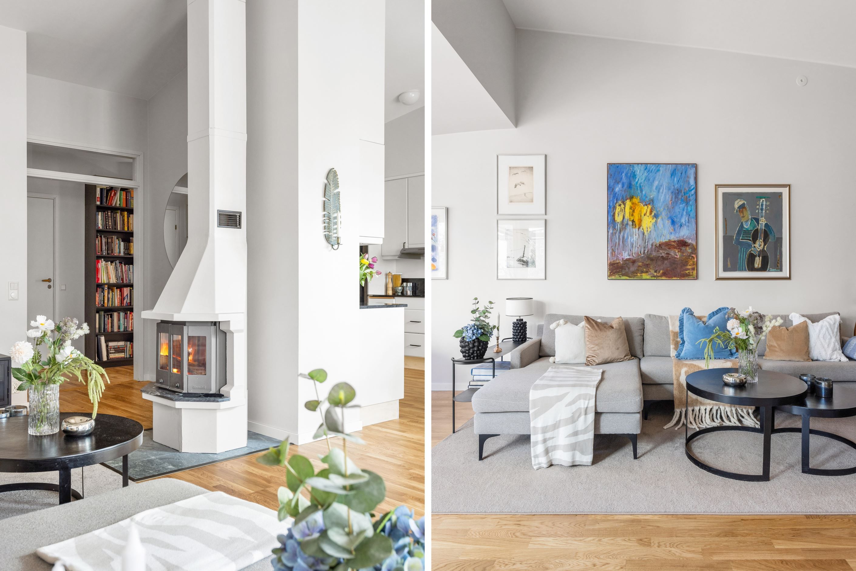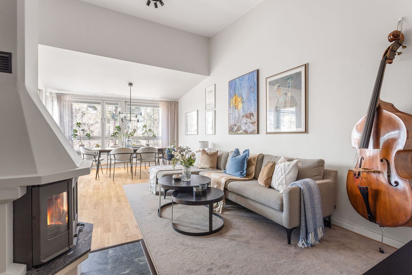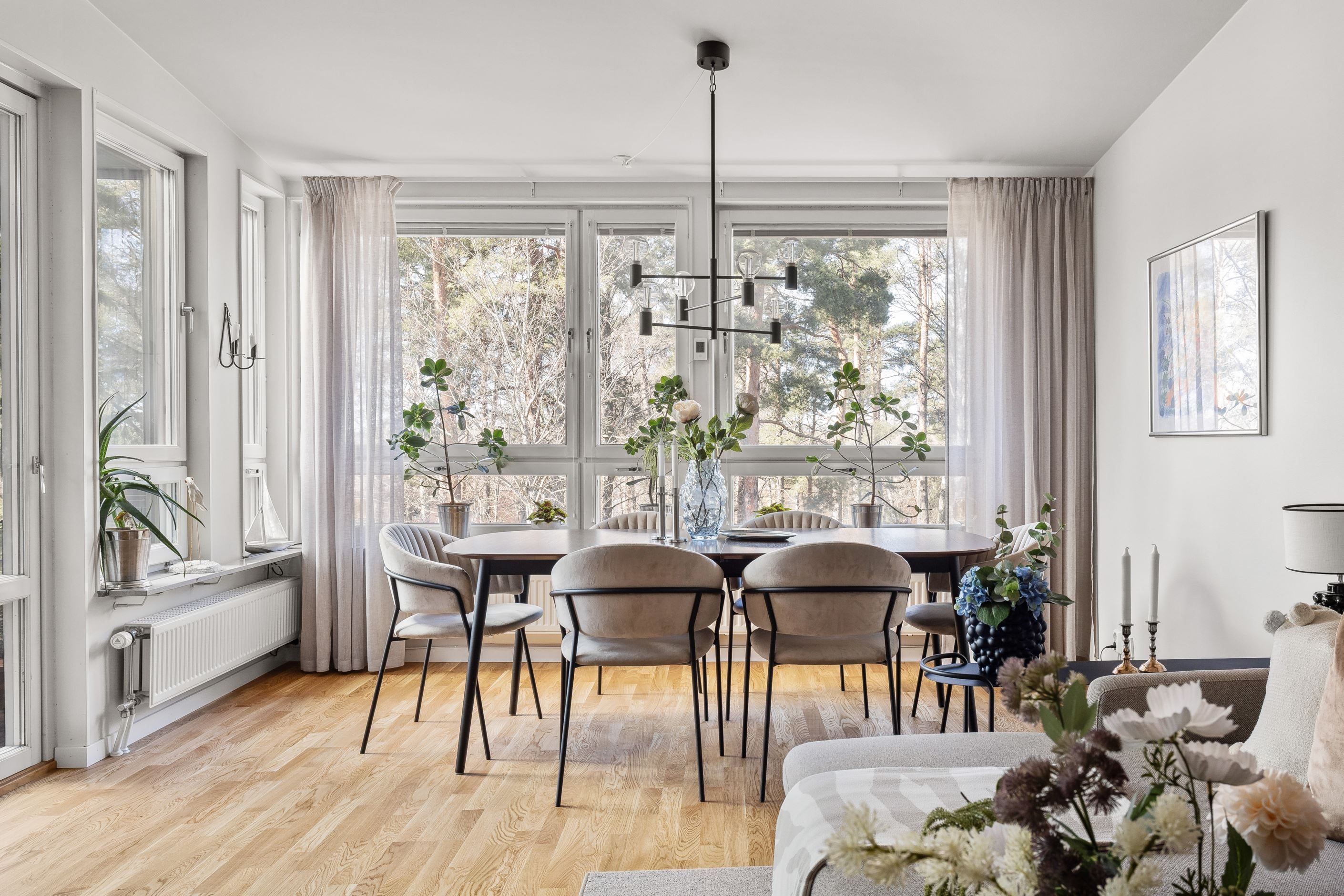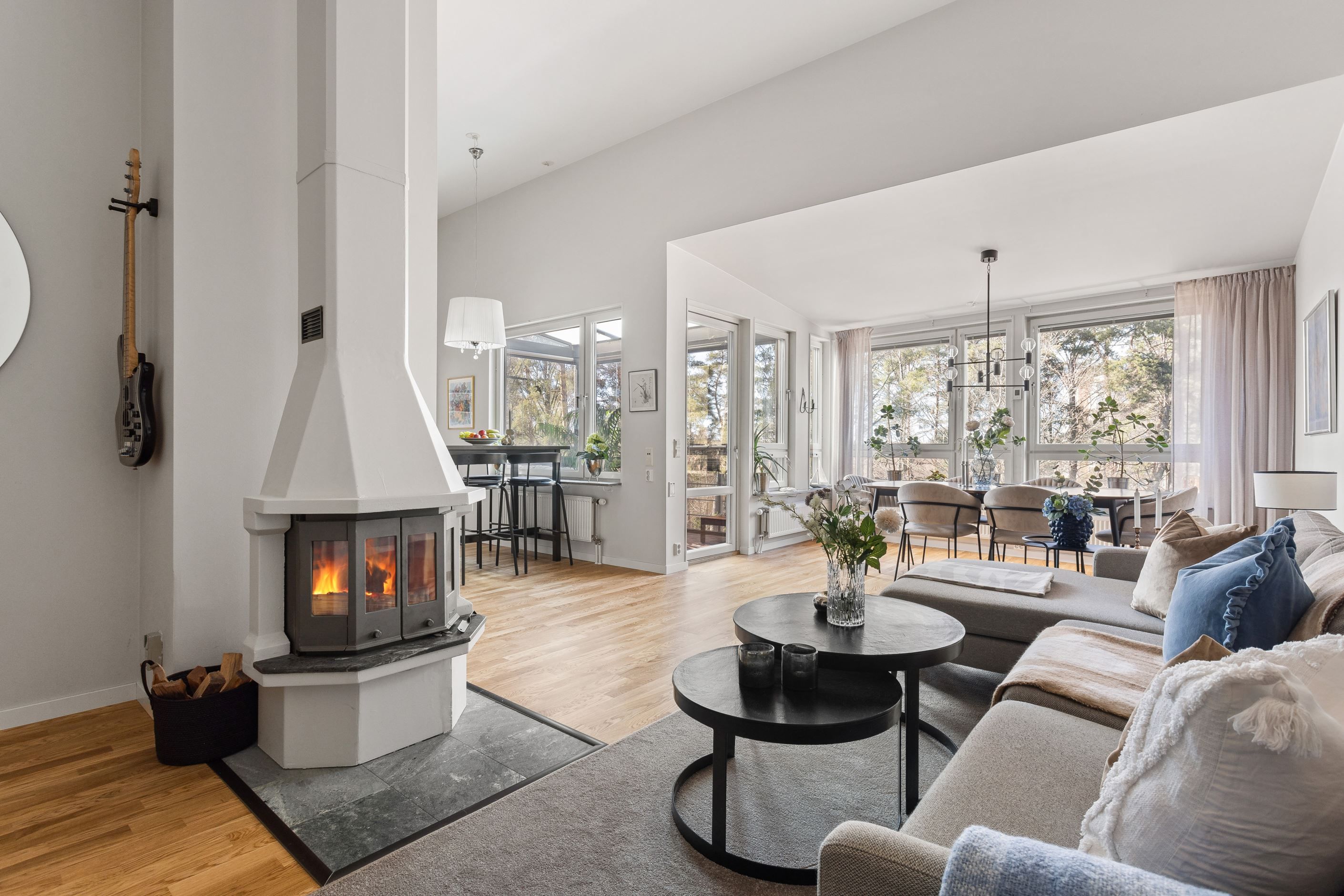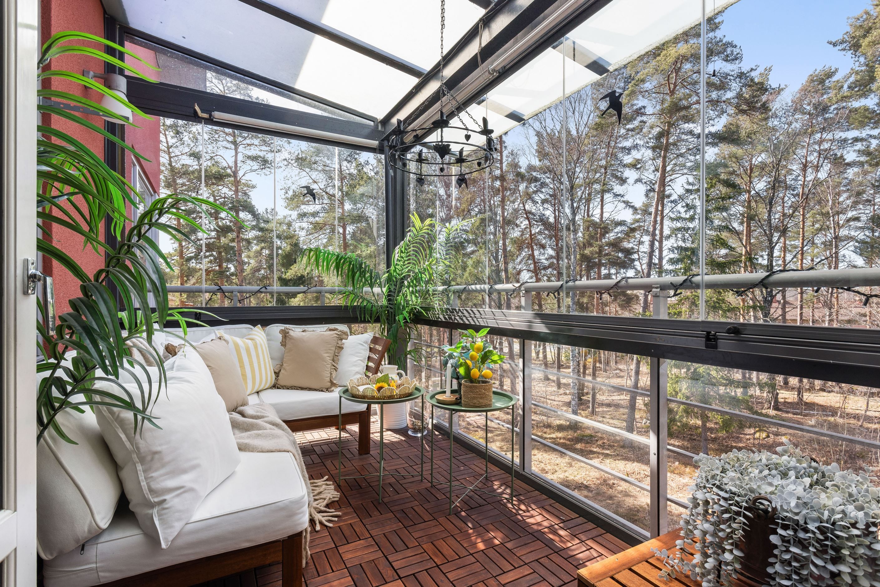 Wow känsla på vardagsrum, kök och matplats med stora fönsterpartier och högt i tak vilket ger en oerhörd rymd i jämförelse med en vanlig lägenhet. Här trivs du som är van vid villallivet och ytorna! Braskaminen ger rummet ett tydligt blickfång och förhöjer stämningen i bostaden. Den öppna planlösningen till både kök och matplats gör detta till hemmets självklara samlingsplats. Från matplatsen nås den inglasade balkongen, ett extra rum att nyttja stora delar av året och en uppskattad plats med utsikt mot den intilliggande skogsdungen. Läget mot grönskan skapar en avskild och rofylld inramning som förhöjer hela bostadsupplevelsen i vilket rum du än befinner dig.